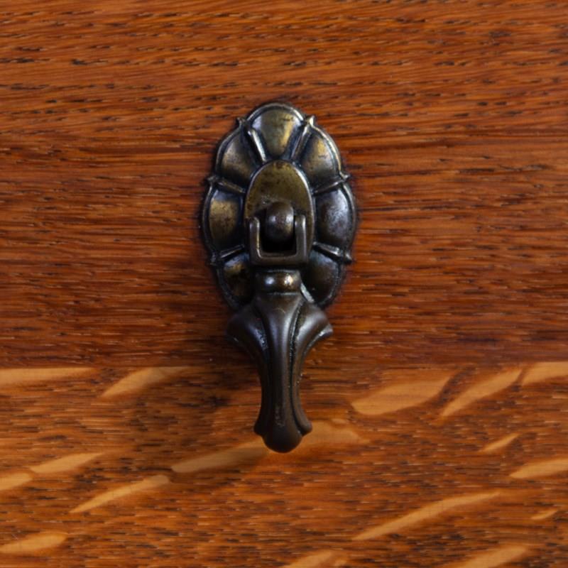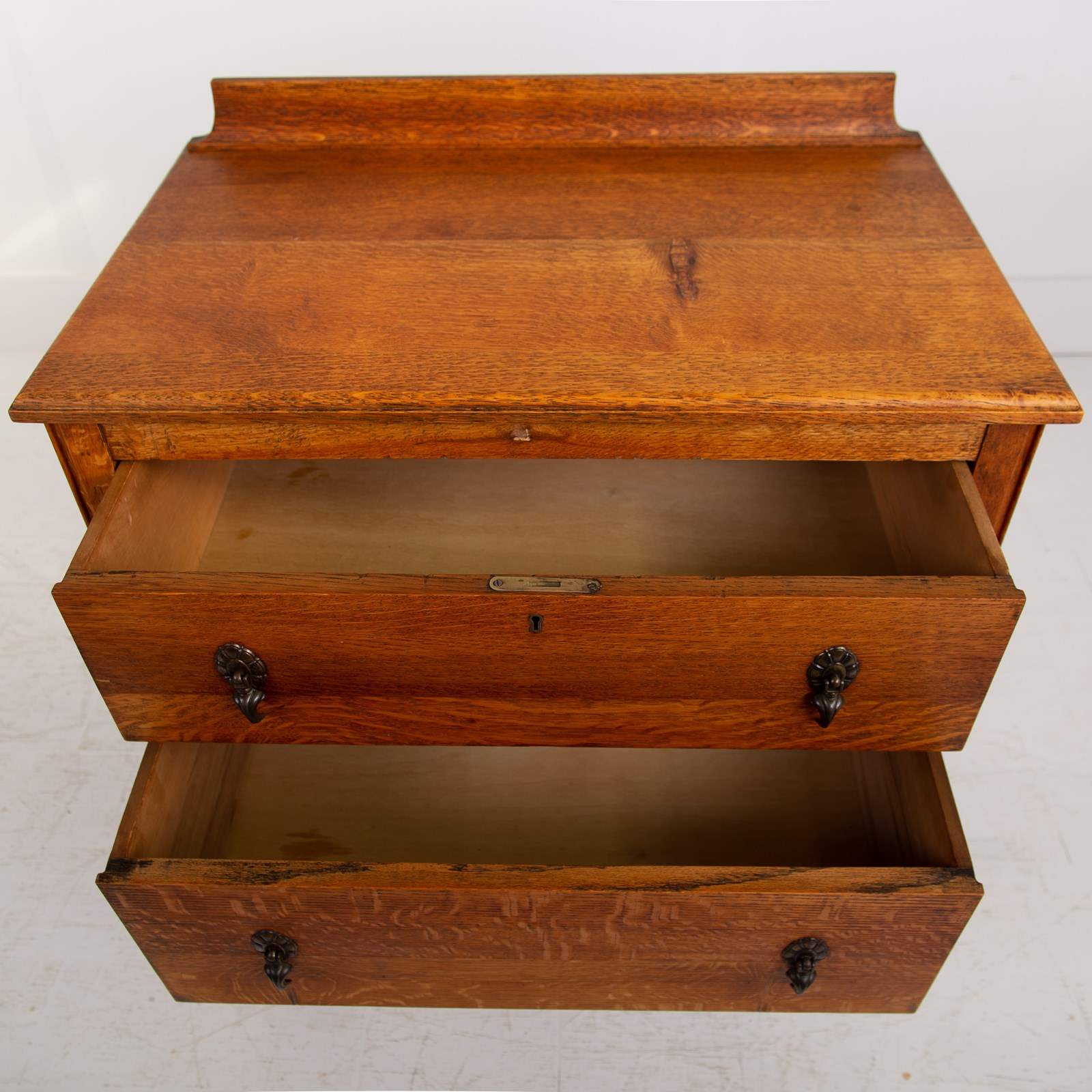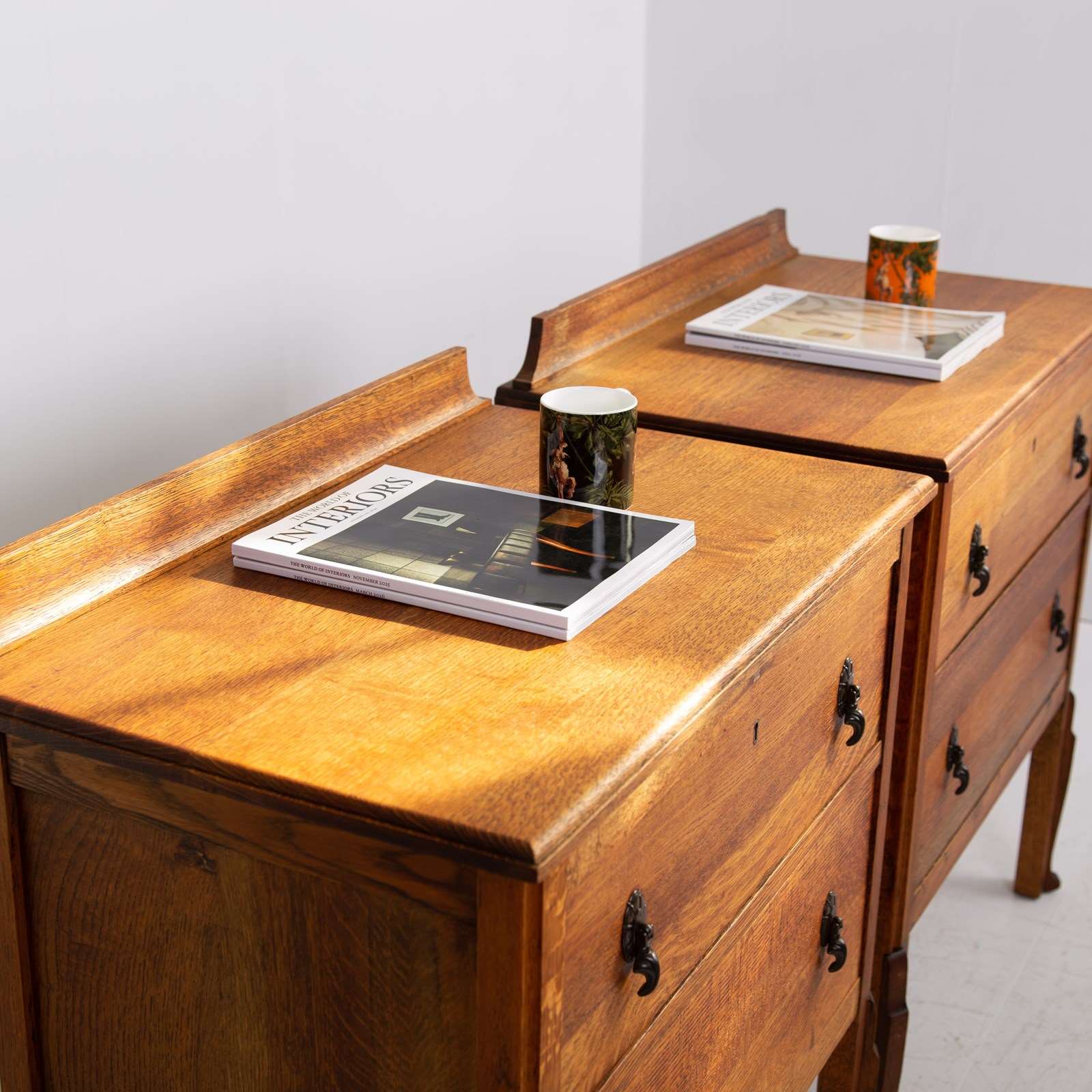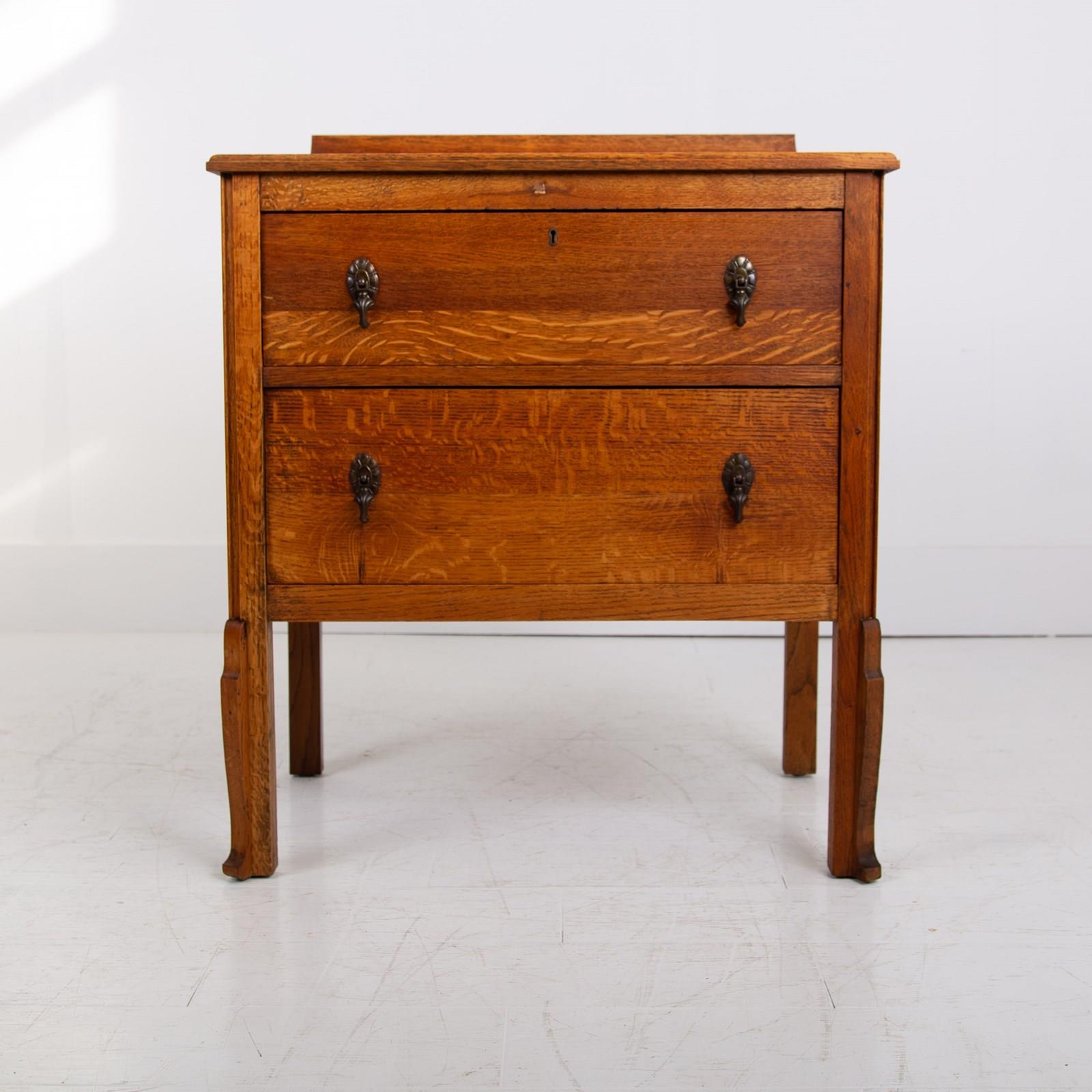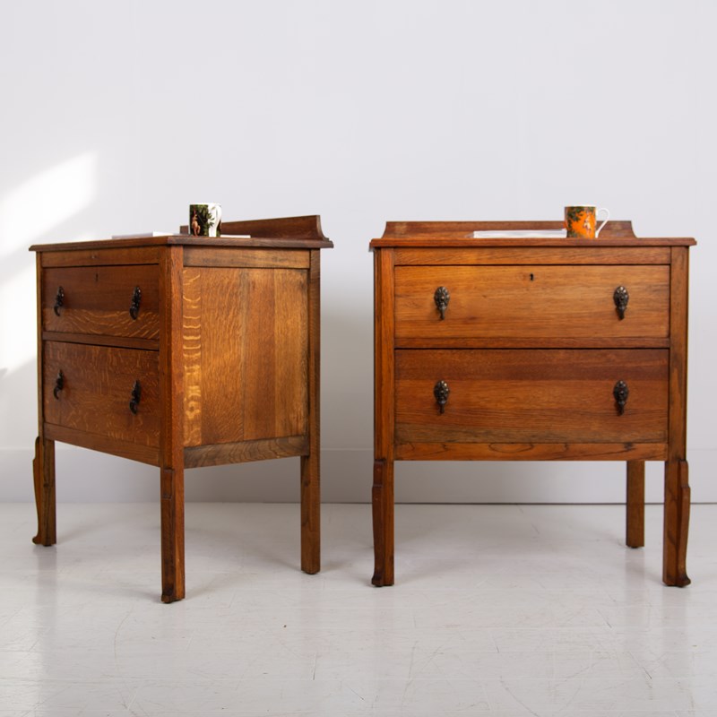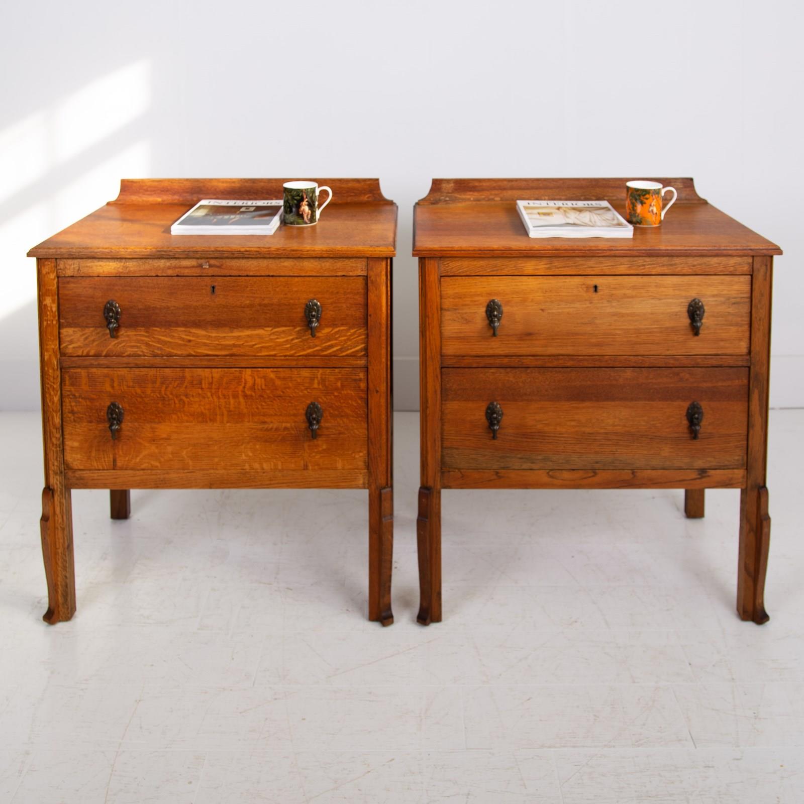 Super scale to this pair of handsome chaps, perfect for bedside cabinets or maybe a living room. Never easy to find these sitting in a lovely condition with a well shaped oversailing solid oak top, delightful shaped front legs and two graduated drawers with toggle drop pendant handles with casting numbers to the rear.