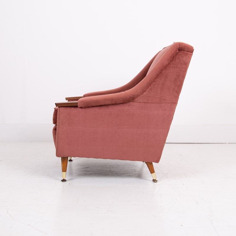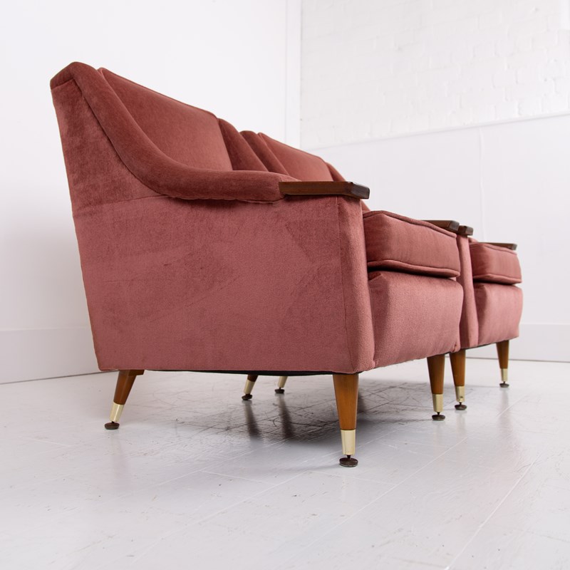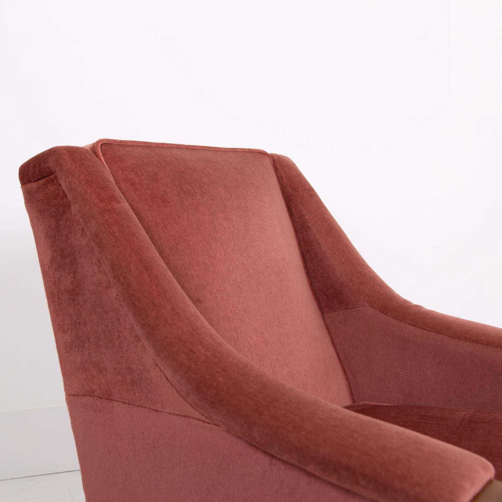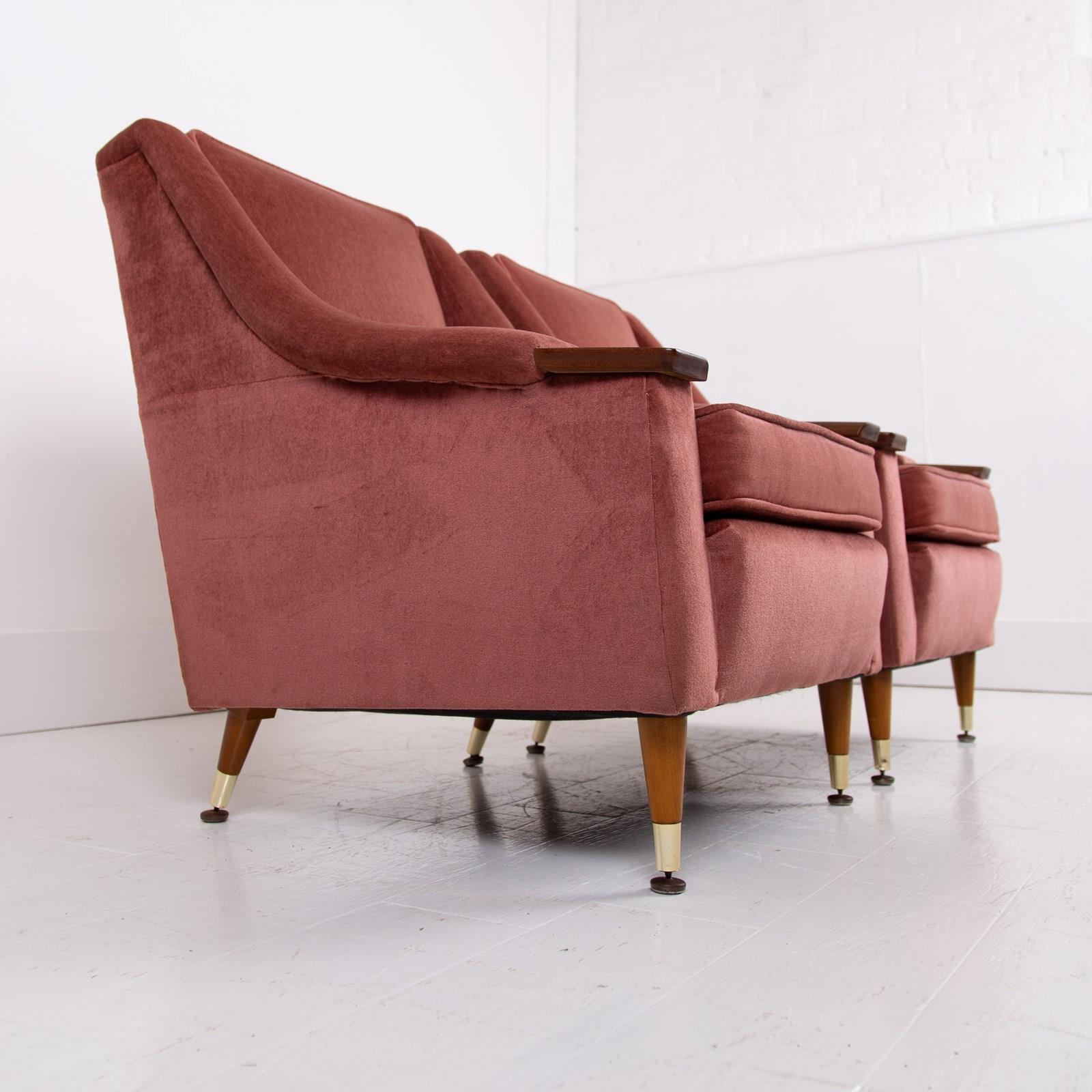 Both chairs sit in the same condition , the dusky pink short velvet fabric is very good with light wear, no holes, fading or marks with the upholstery being well executed, the legs also have sensible light aging and all have the original brass accents and original feet pads. We have ensured the chairs are ready to place and enjoy. If you wish for new upholstery, Mark the upholsterer could complete a professional job for £415 plus VAT per chair - you would require 3-4 metres of fabric per chair which we can assist with sourcing samples etc, let us know when you purchase.