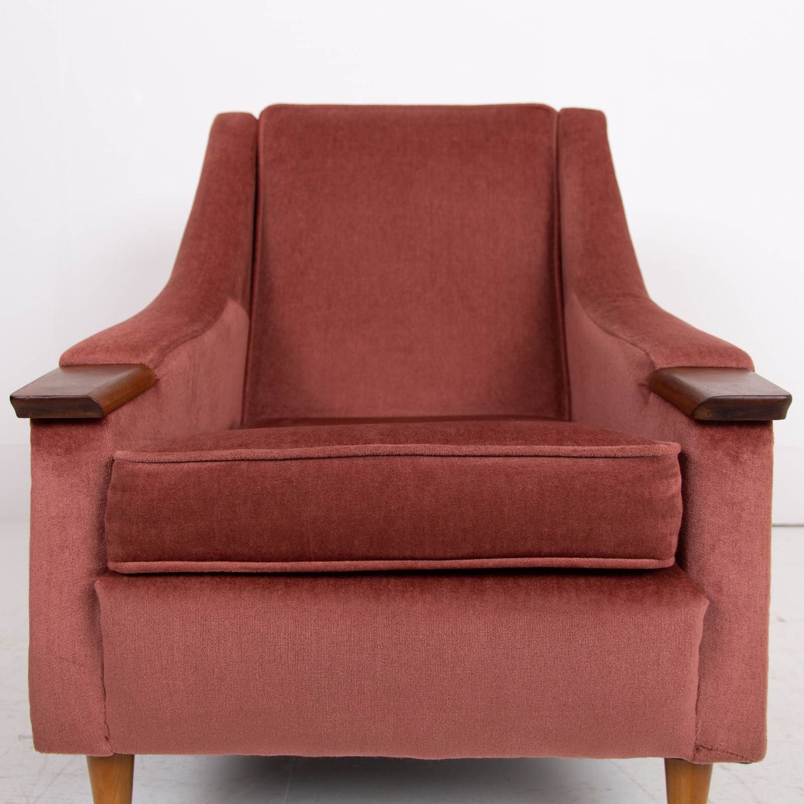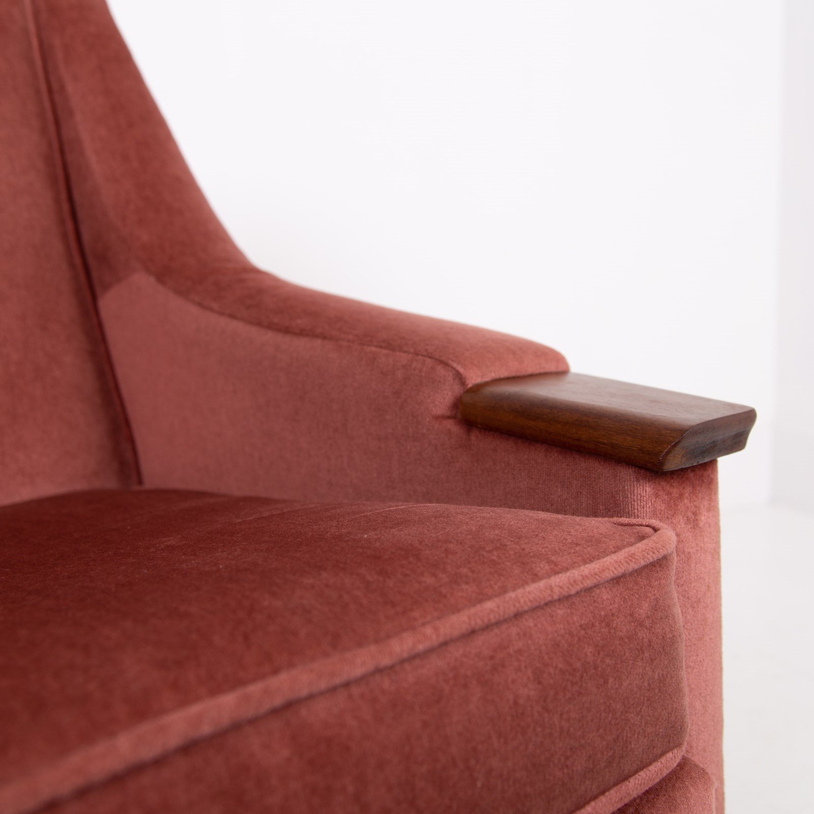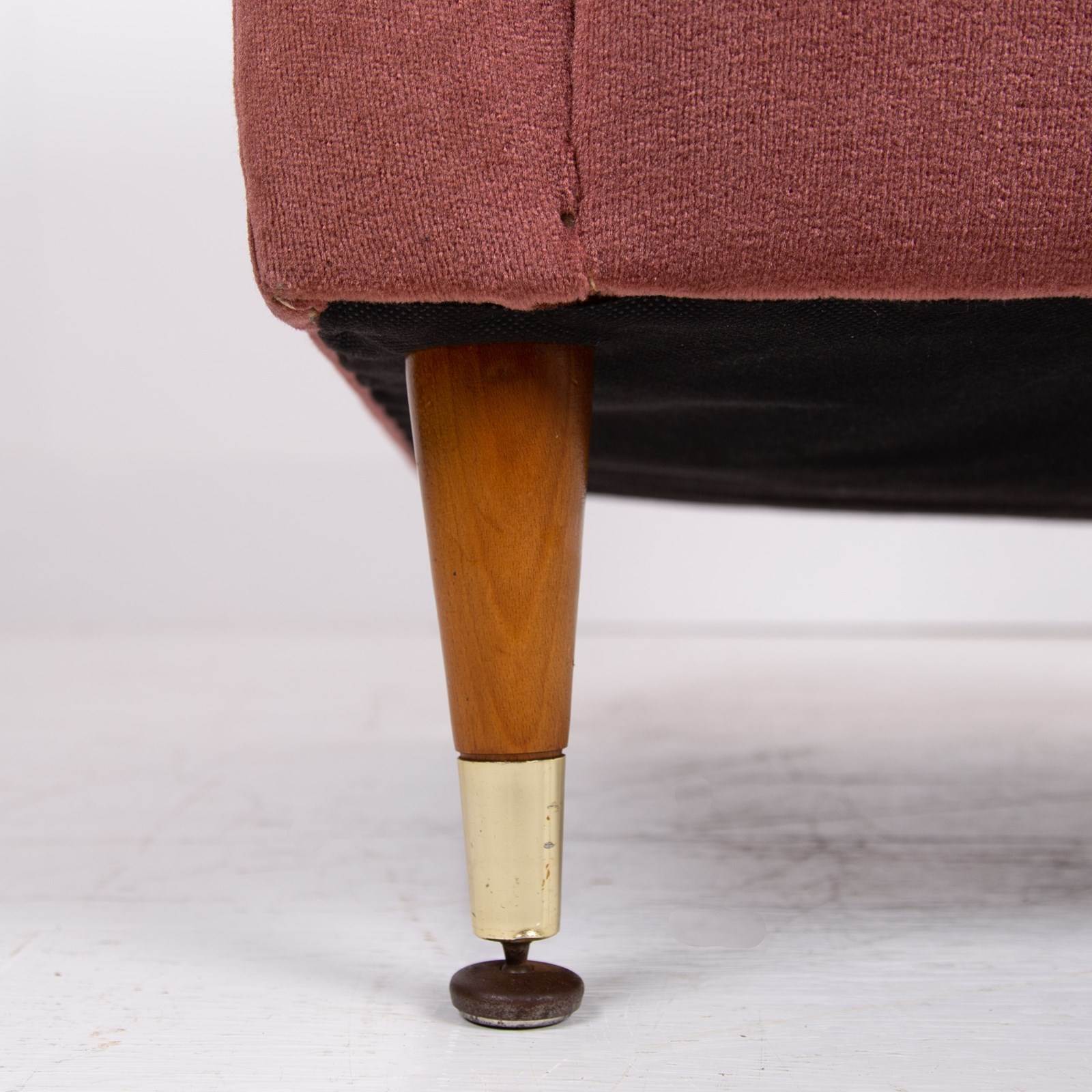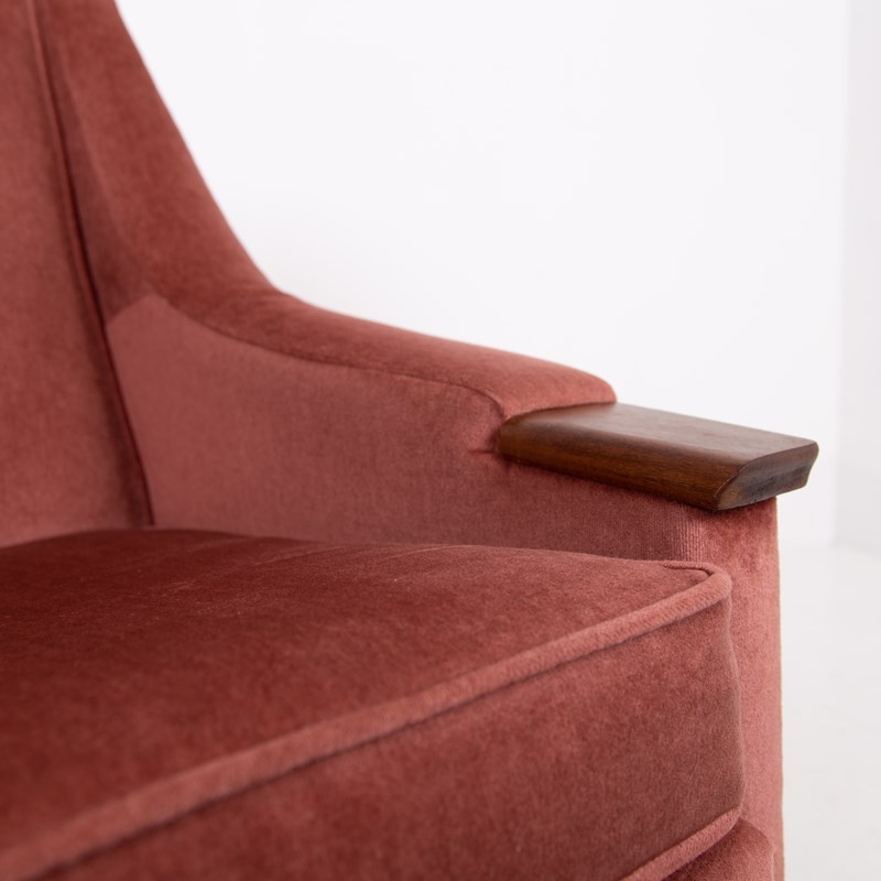 Both chairs sit in the same condition , the dusky pink short velvet fabric is very good with light wear, no holes, fading or marks with the upholstery being well executed, the legs also have sensible light aging and all have the original brass accents and original feet pads. We have ensured the chairs are ready to place and enjoy. If you wish for new upholstery, Mark the upholsterer could complete a professional job for £415 plus VAT per chair - you would require 3-4 metres of fabric per chair which we can assist with sourcing samples etc, let us know when you purchase.