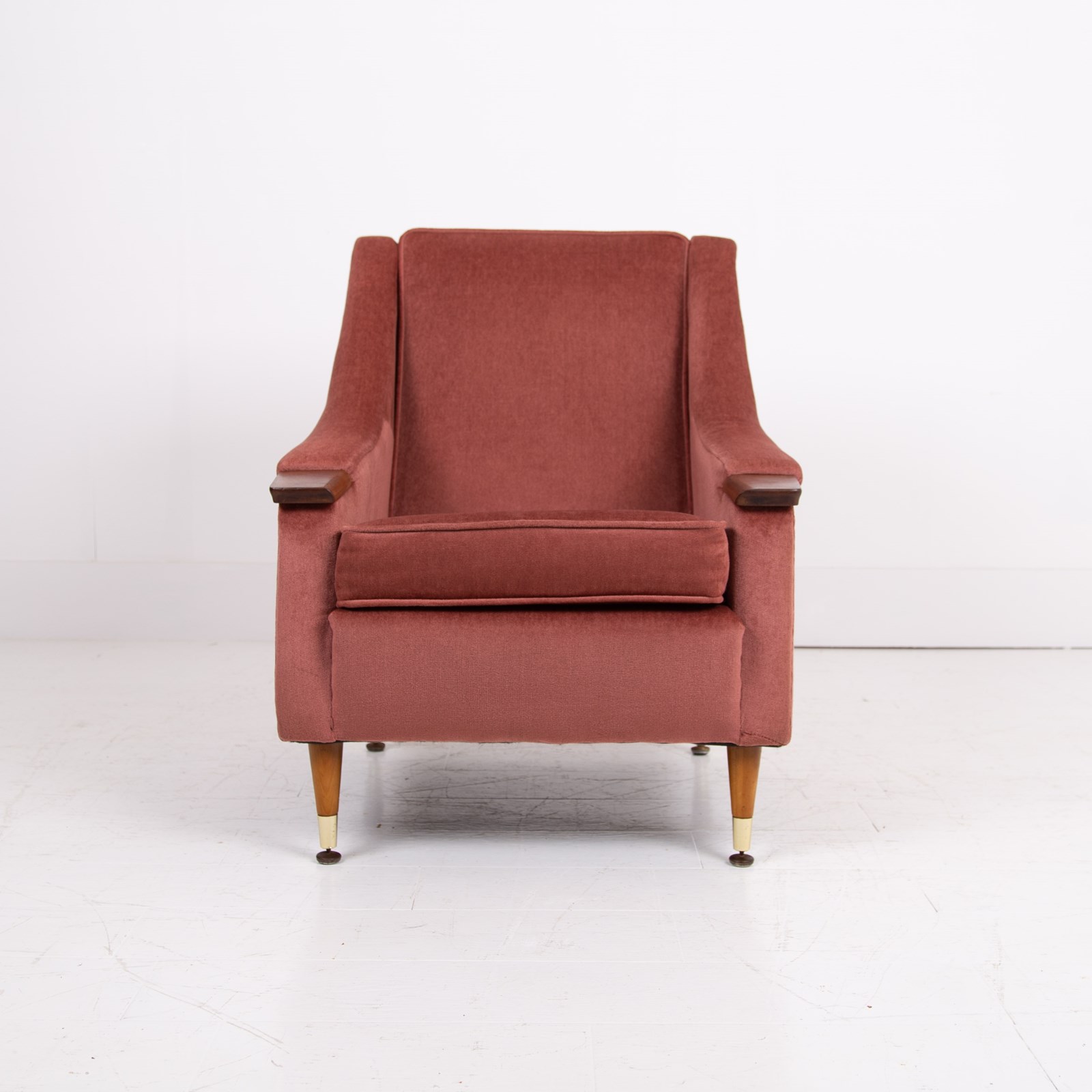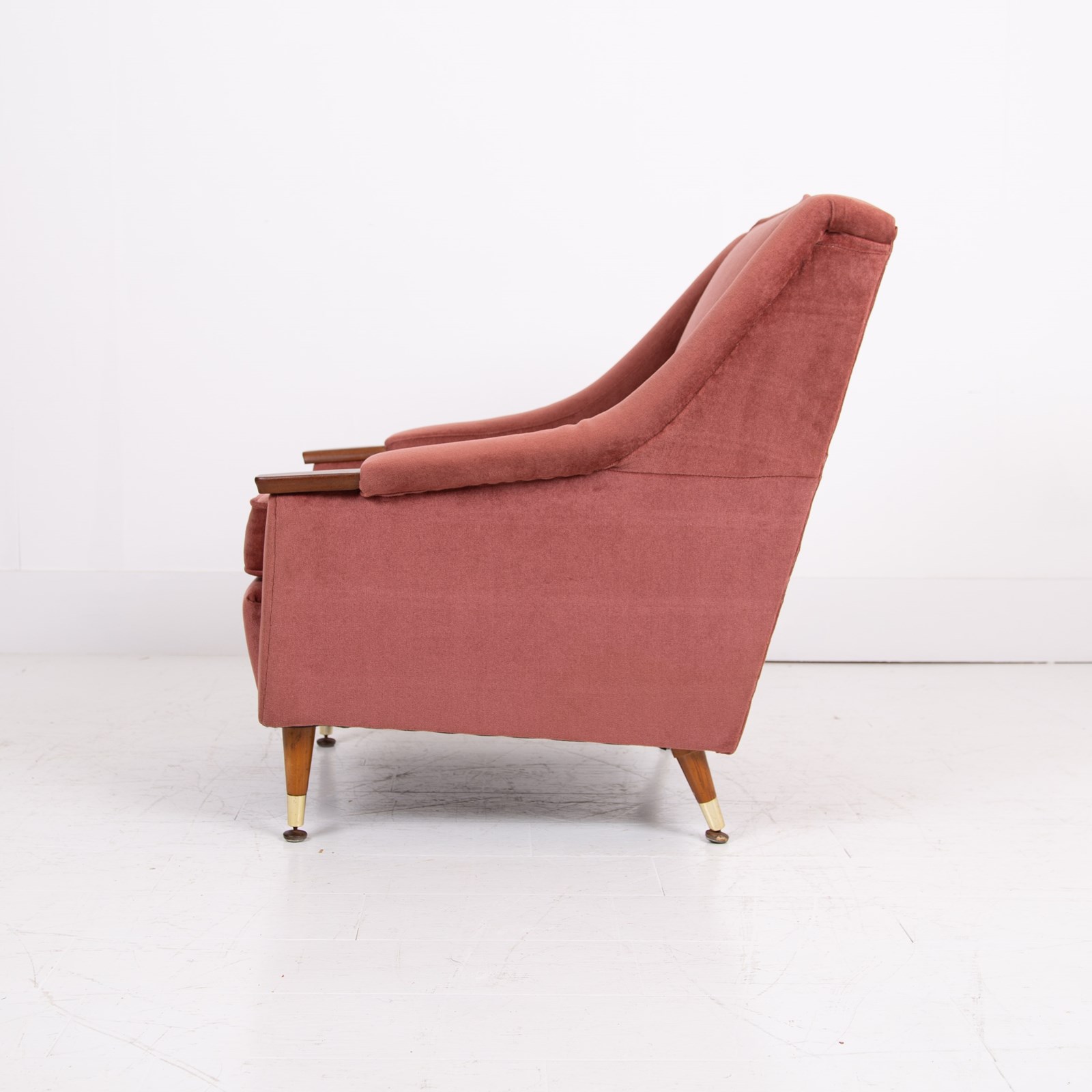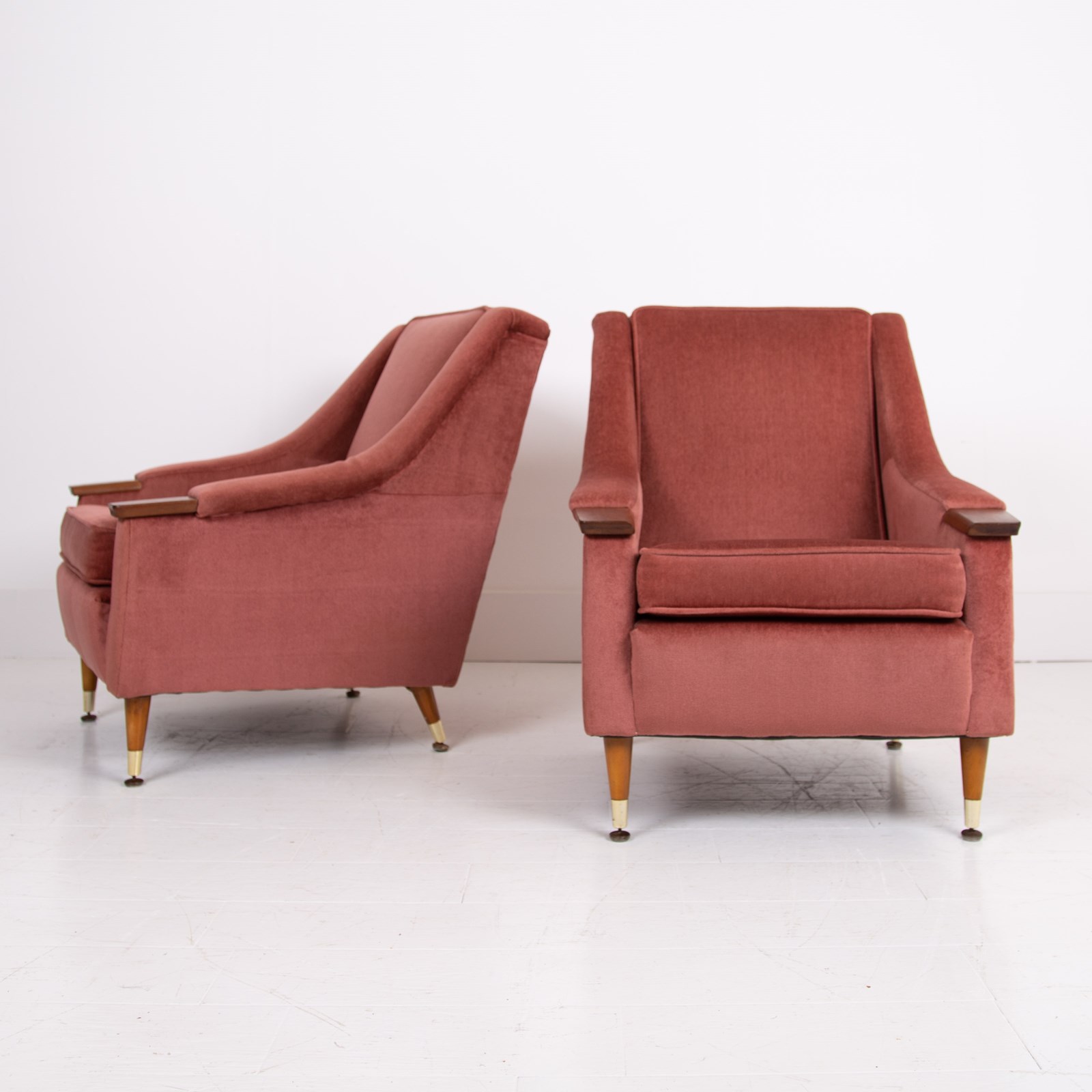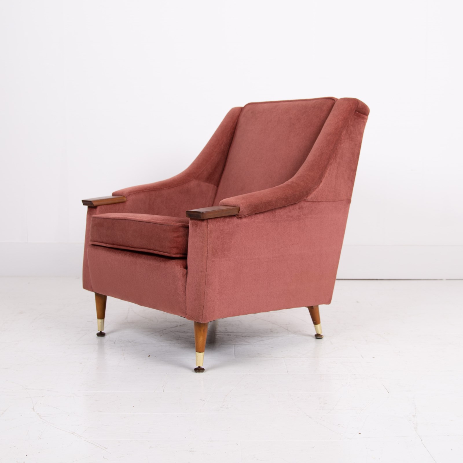 A great looking pair of British lounge armchairs C1960s in lovely cherished condition. The pair have plenty going for them - the slender brass capped tapered legs, those well shaped sweeping arms, the little solid teak arm pads, perfect for a cuppa and the overall scale, about the right size.