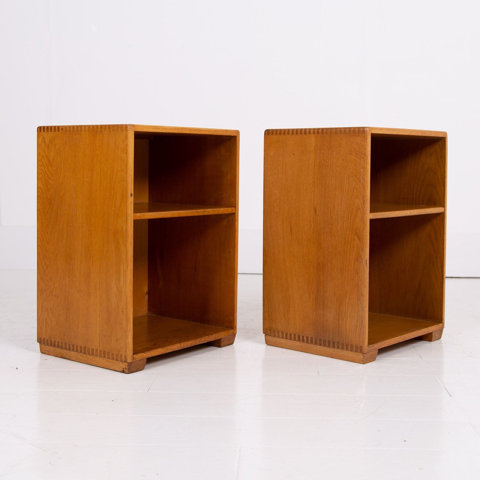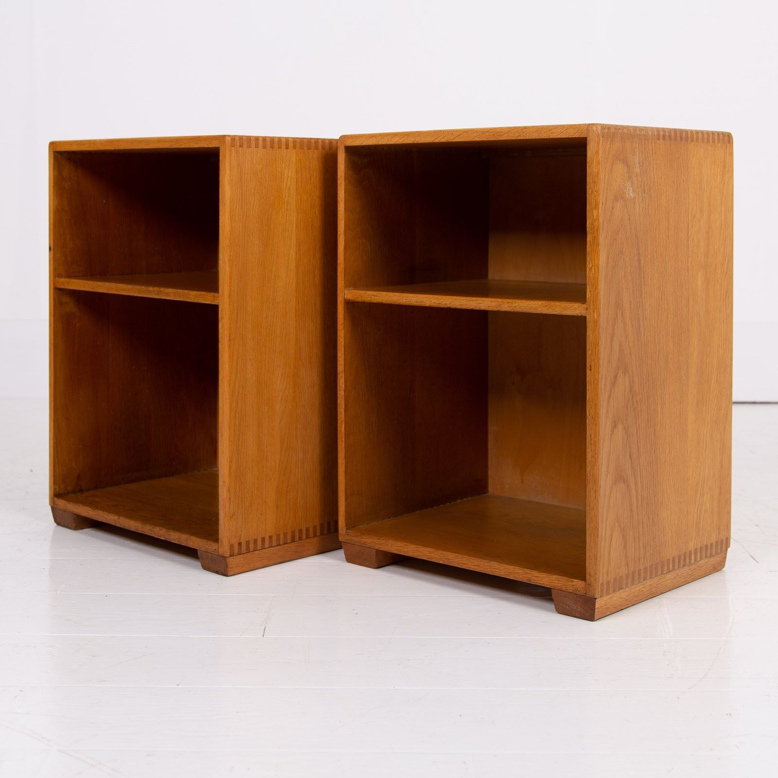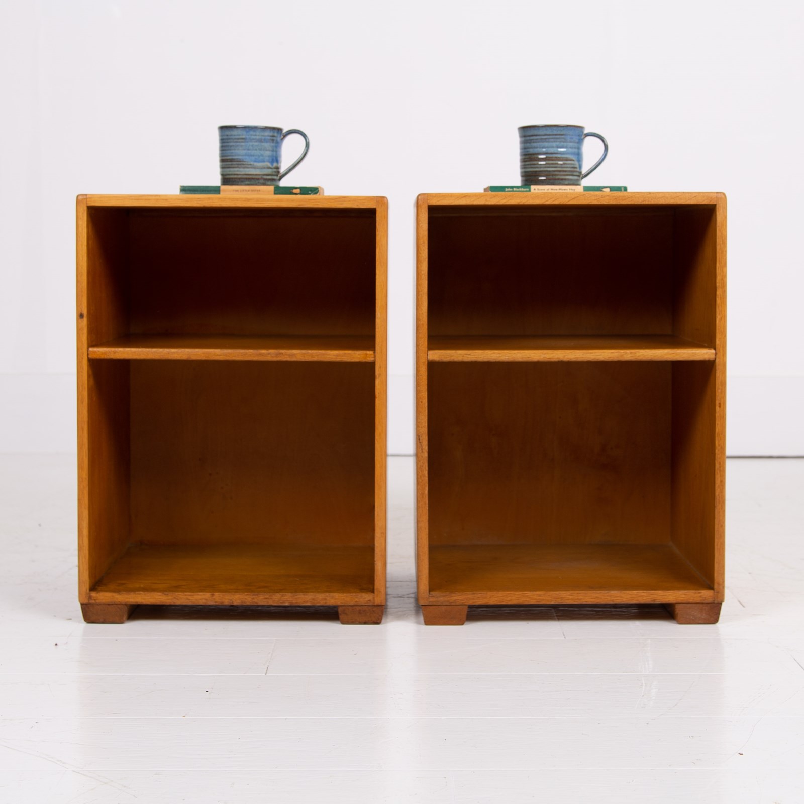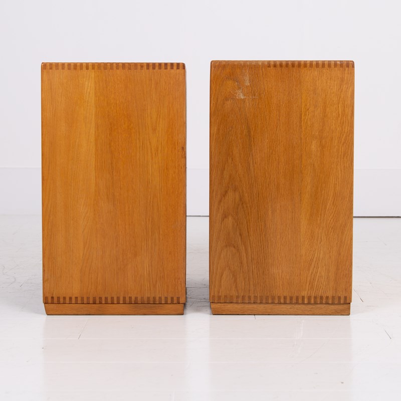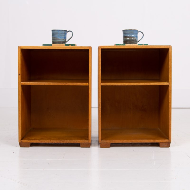 A very well designed pair of oak military issue side tables/cabinets, perfect as bedsides or paired with an armchair. So many times keeping design straightforward works and these with the open finger joints, little oblong feet and aligned lines using solid oak are fabulous.