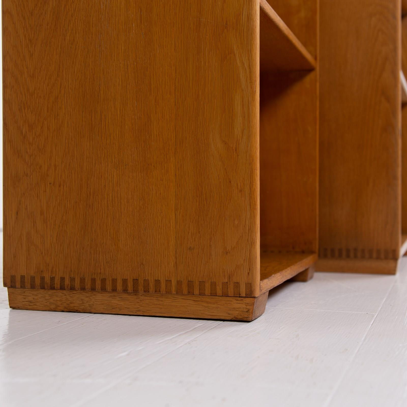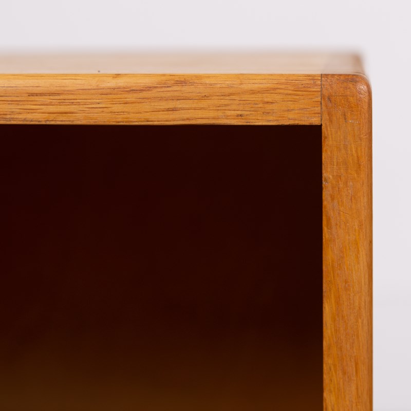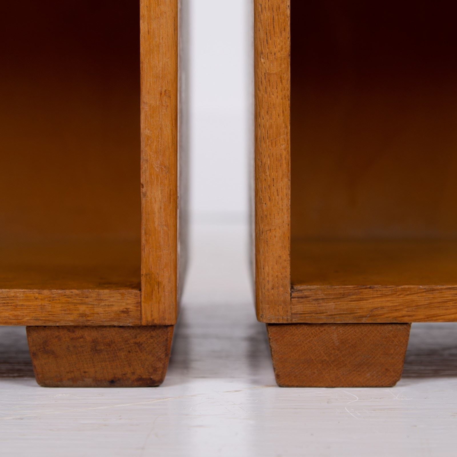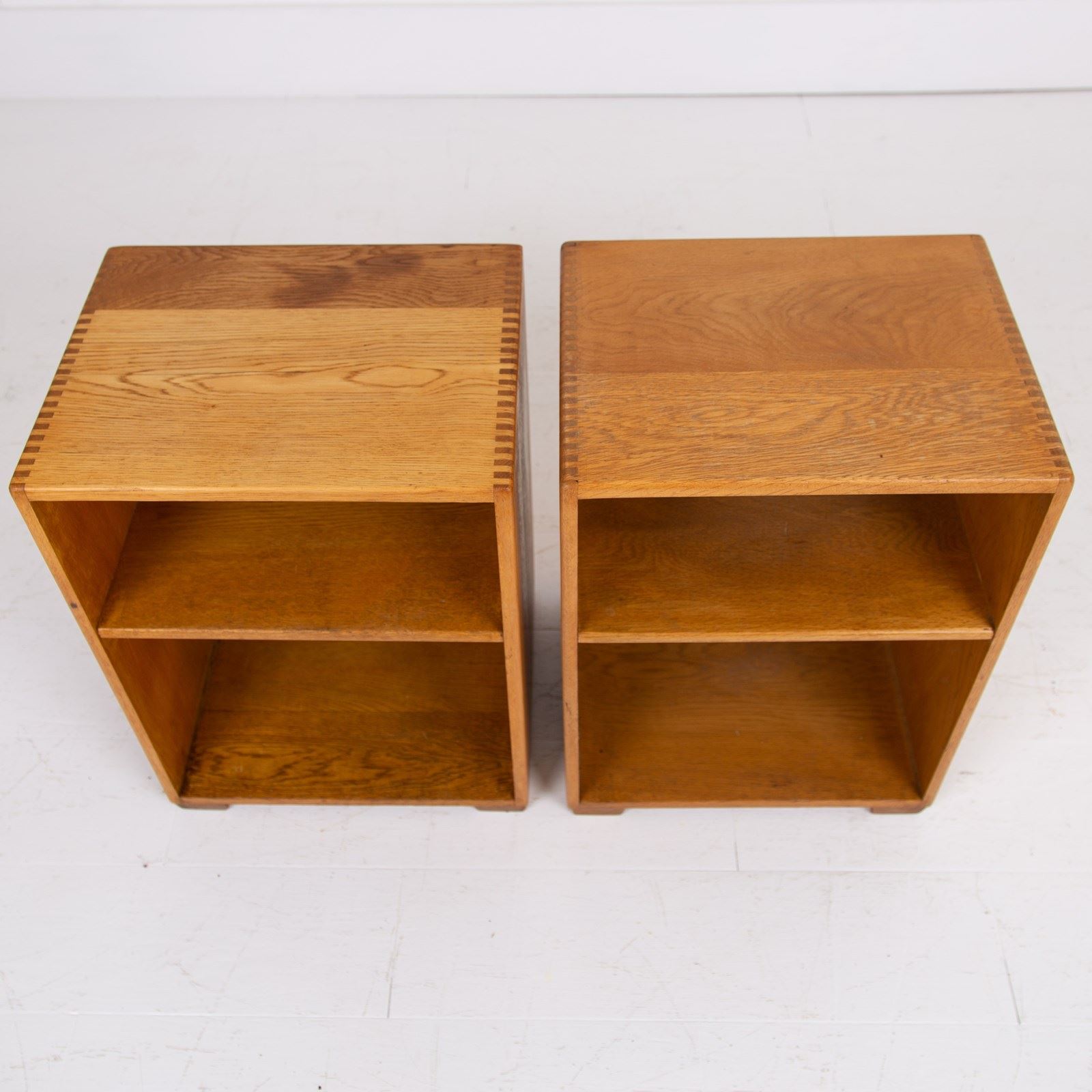 A very well designed pair of oak military issue side tables/cabinets, perfect as bedsides or paired with an armchair. So many times keeping design straightforward works and these with the open finger joints, little oblong feet and aligned lines using solid oak are fabulous.
