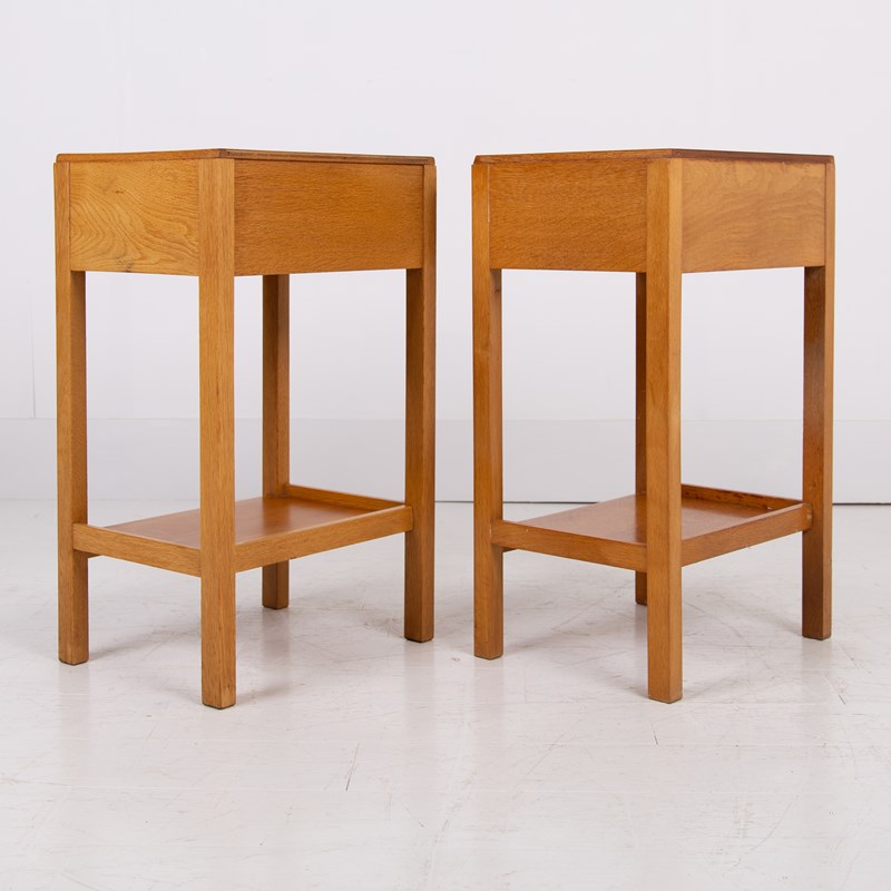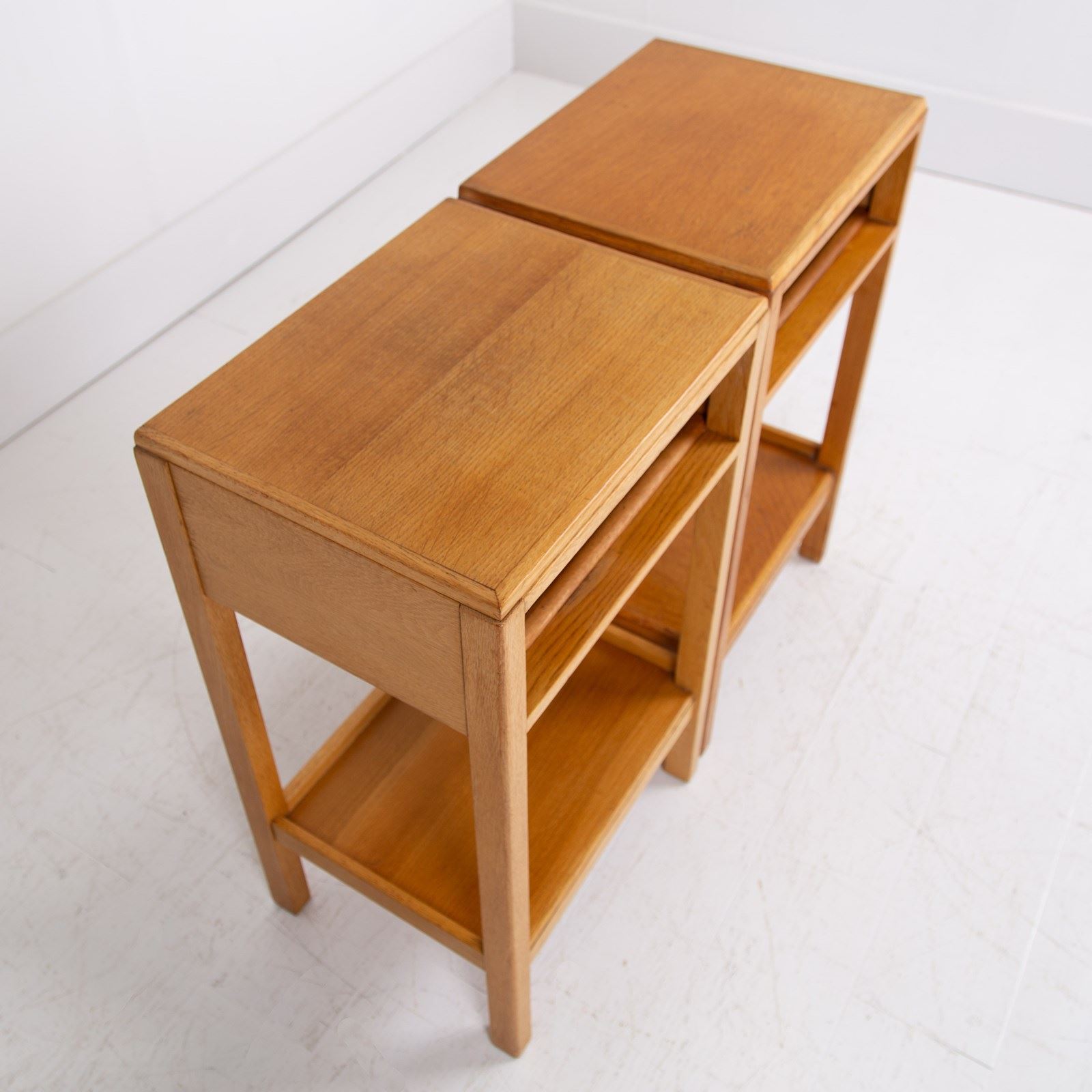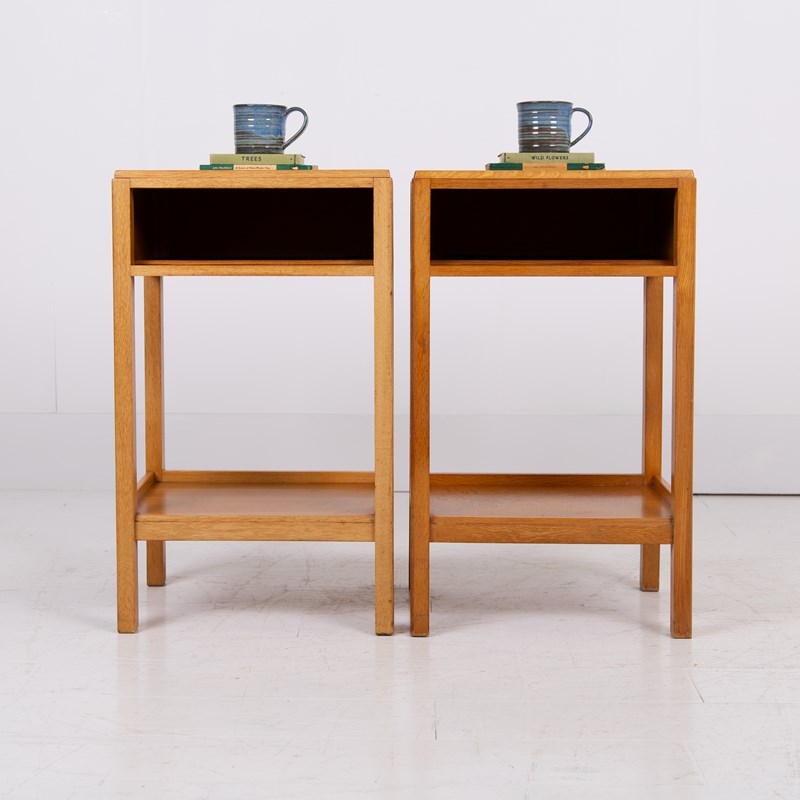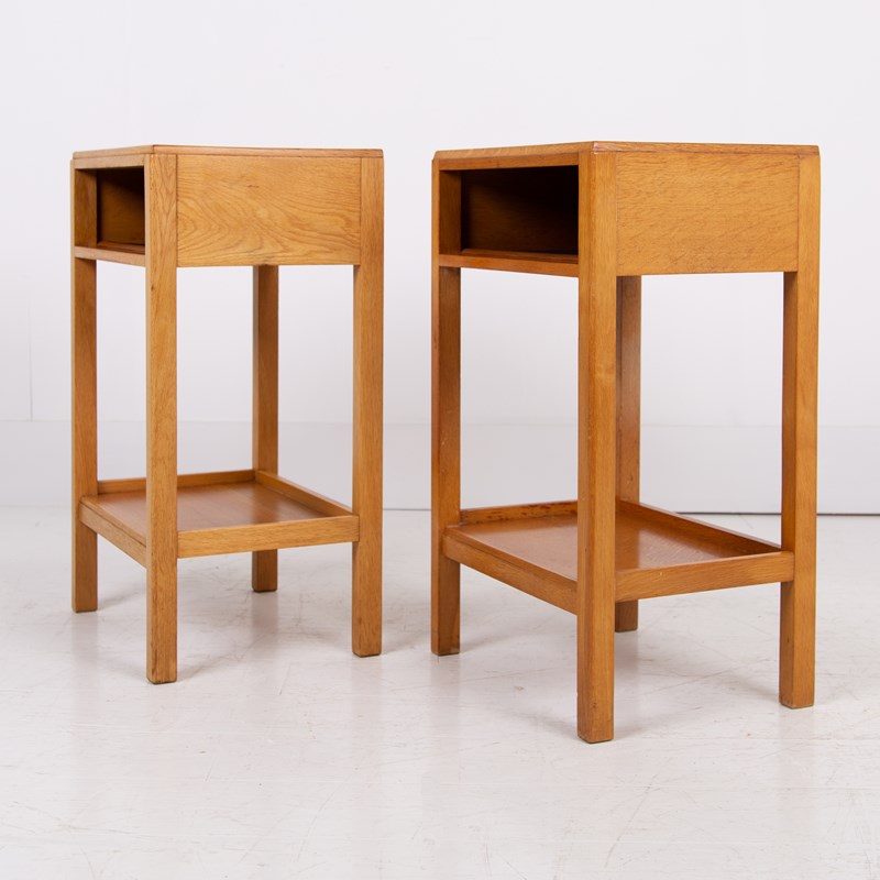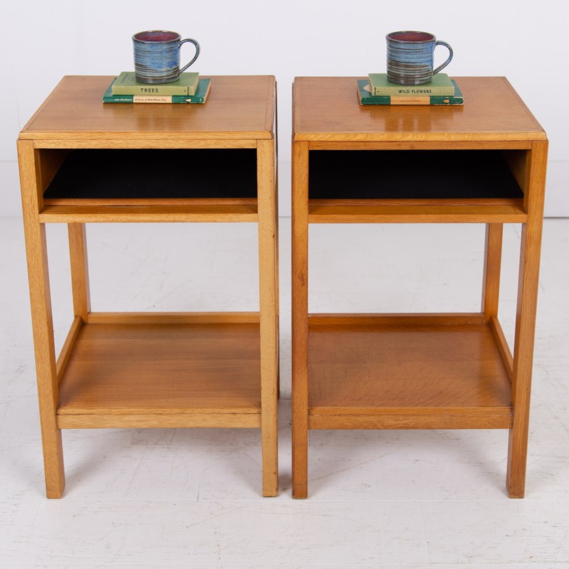 Very much in the Cotswold School style, this matching pair of lighter English oak side tables/cabinets which would work well in so many spaces. The design is very much Gordon Russell with simple, easy on the eye lines, well shaped and grained legs, a little felt lined “cubby hole” for books, or personal trinkets and a lower shelf.