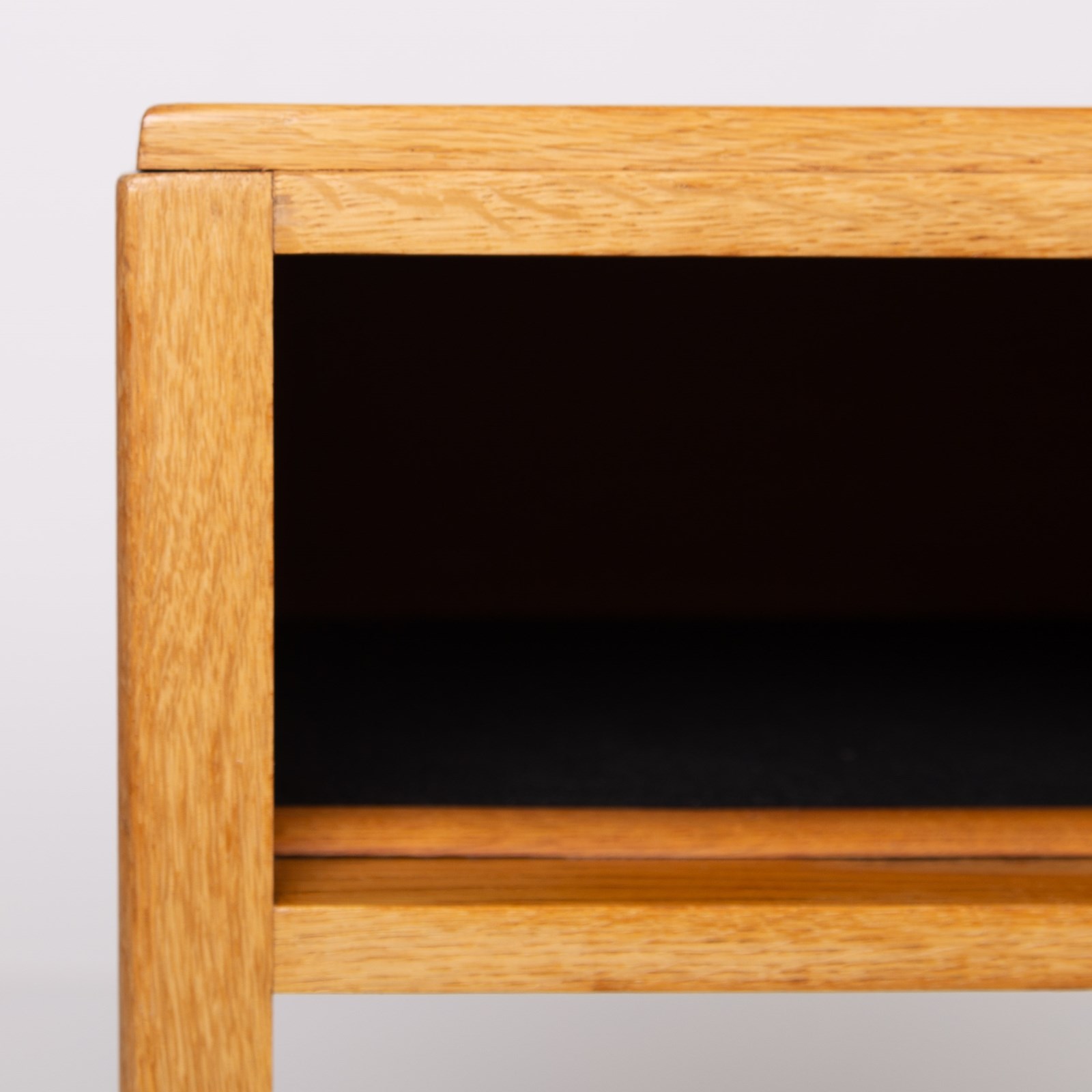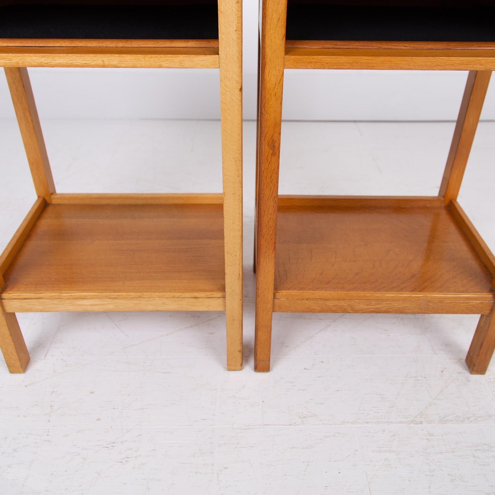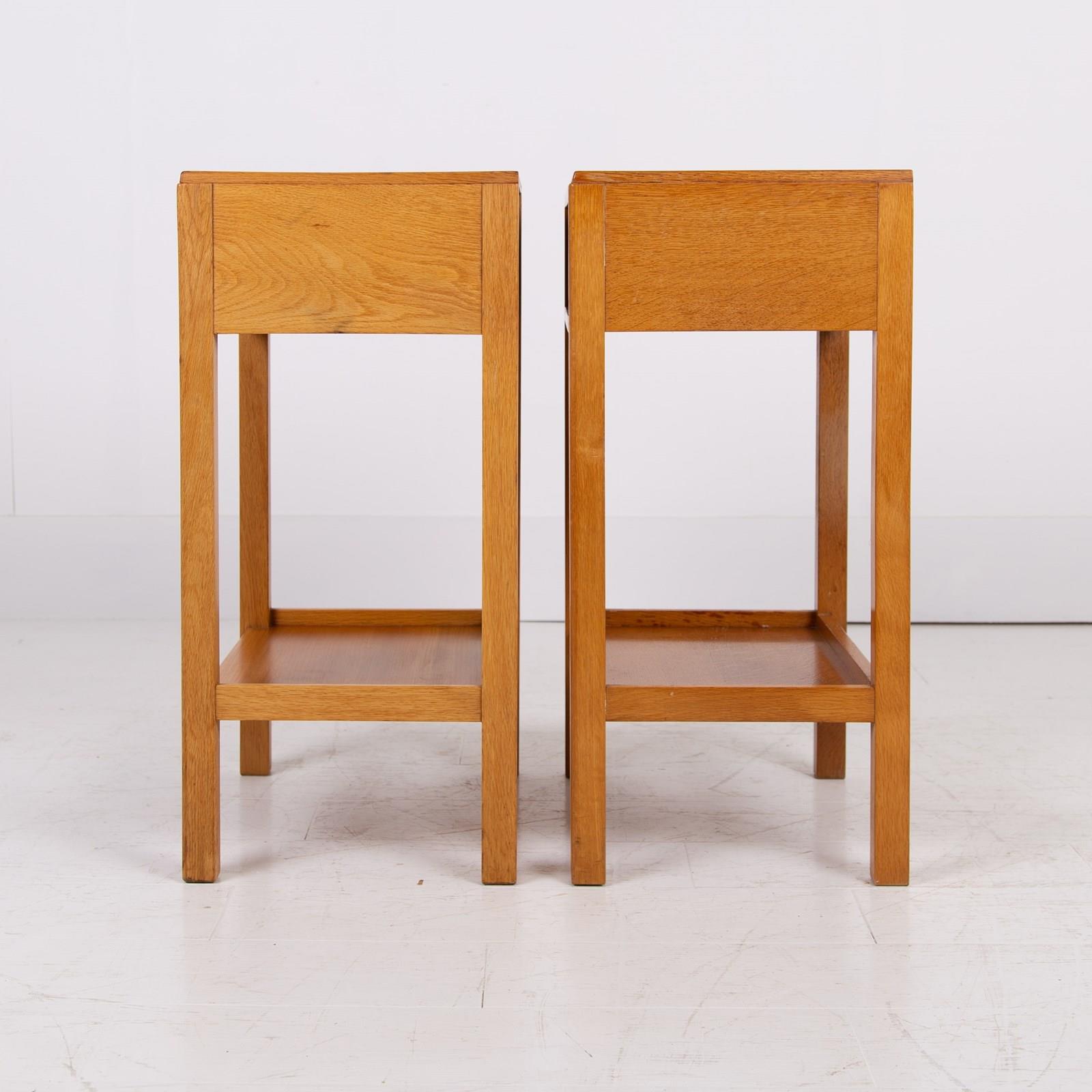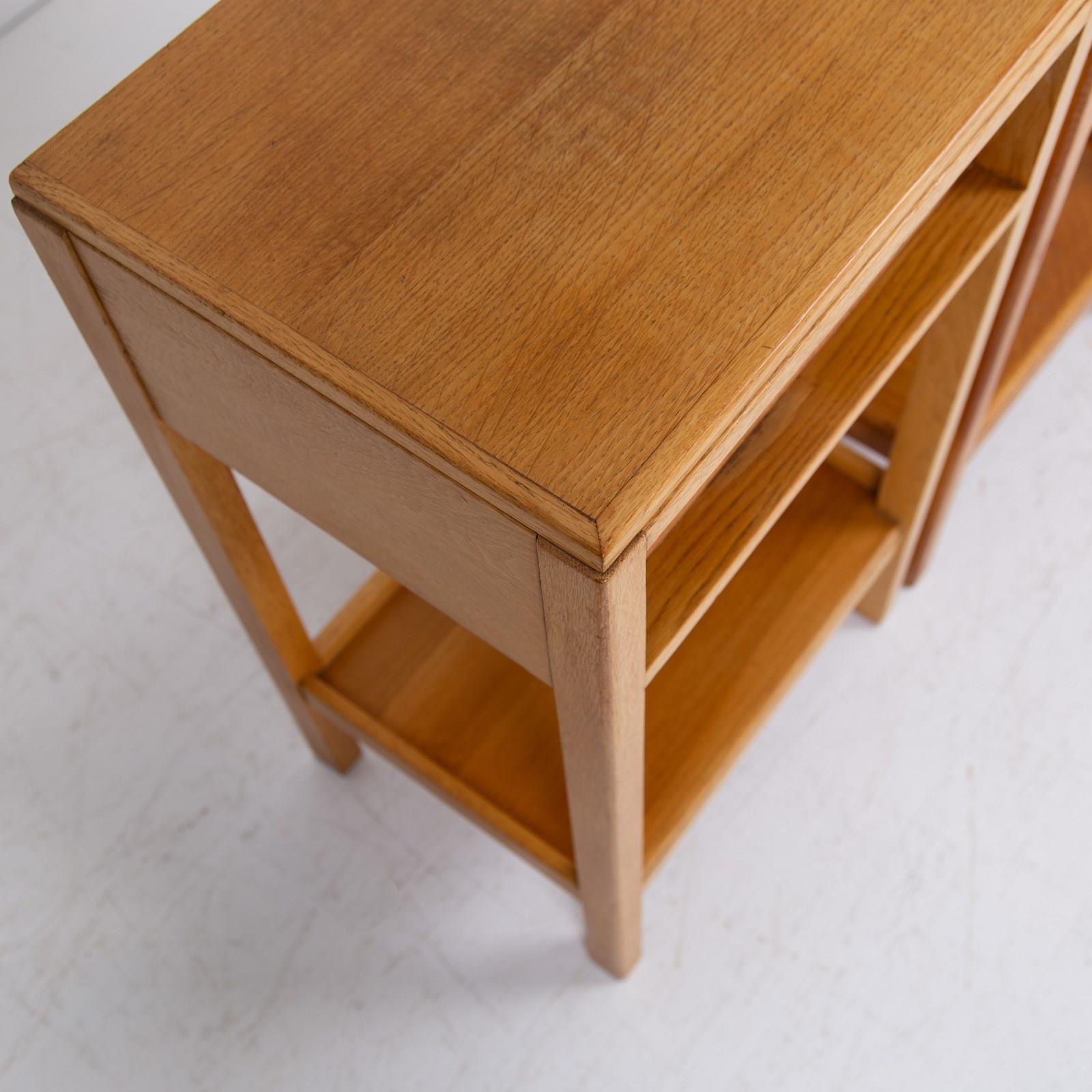 Very much in the Cotswold School style, this matching pair of lighter English oak side tables/cabinets which would work well in so many spaces. The design is very much Gordon Russell with simple, easy on the eye lines, well shaped and grained legs, a little felt lined “cubby hole” for books, or personal trinkets and a lower shelf.