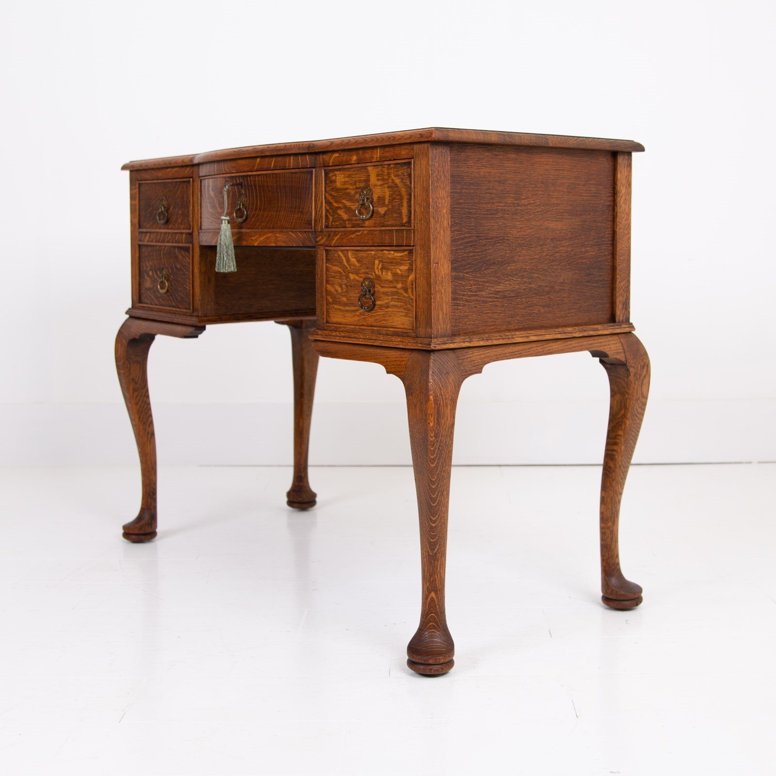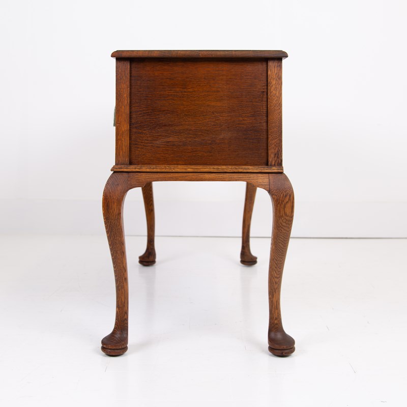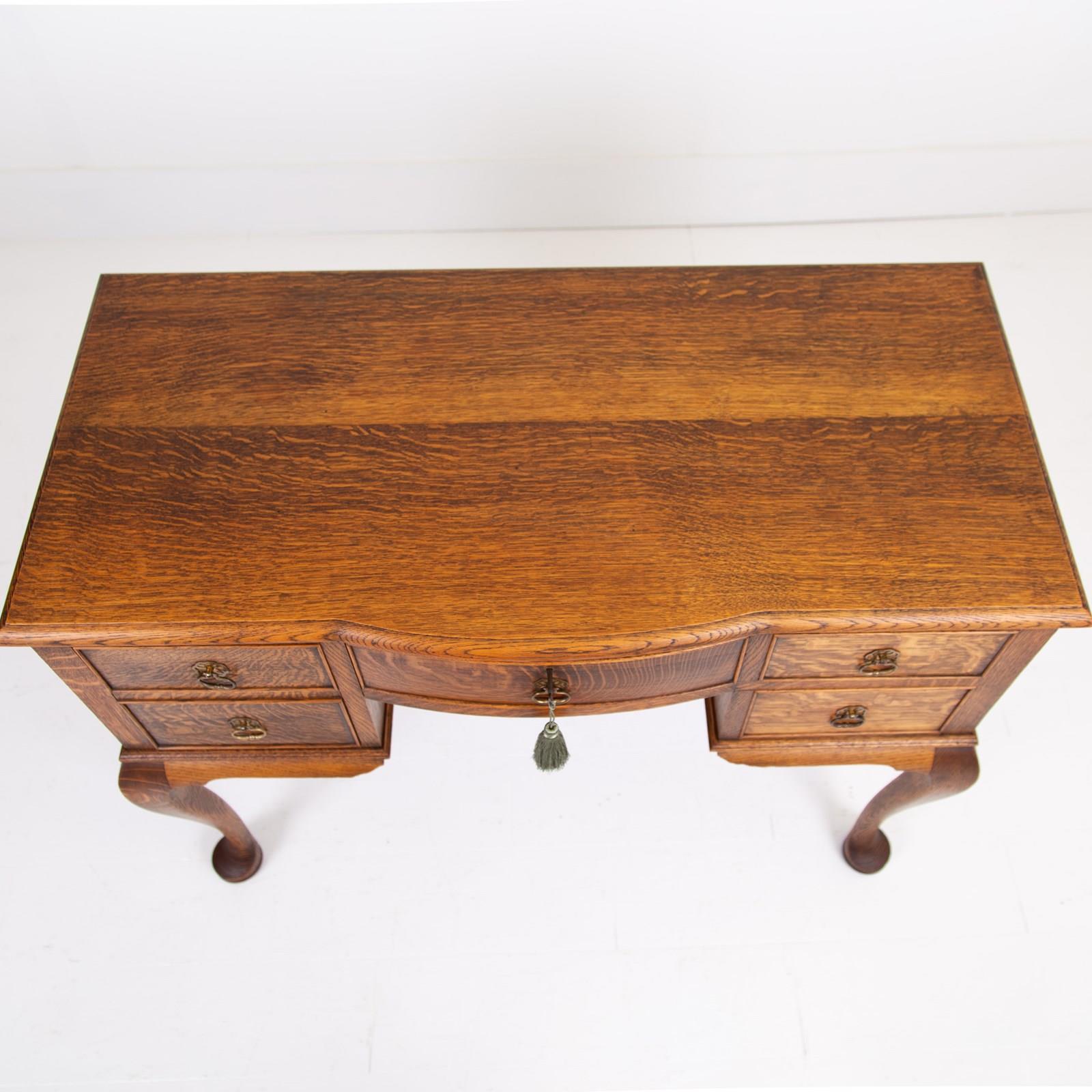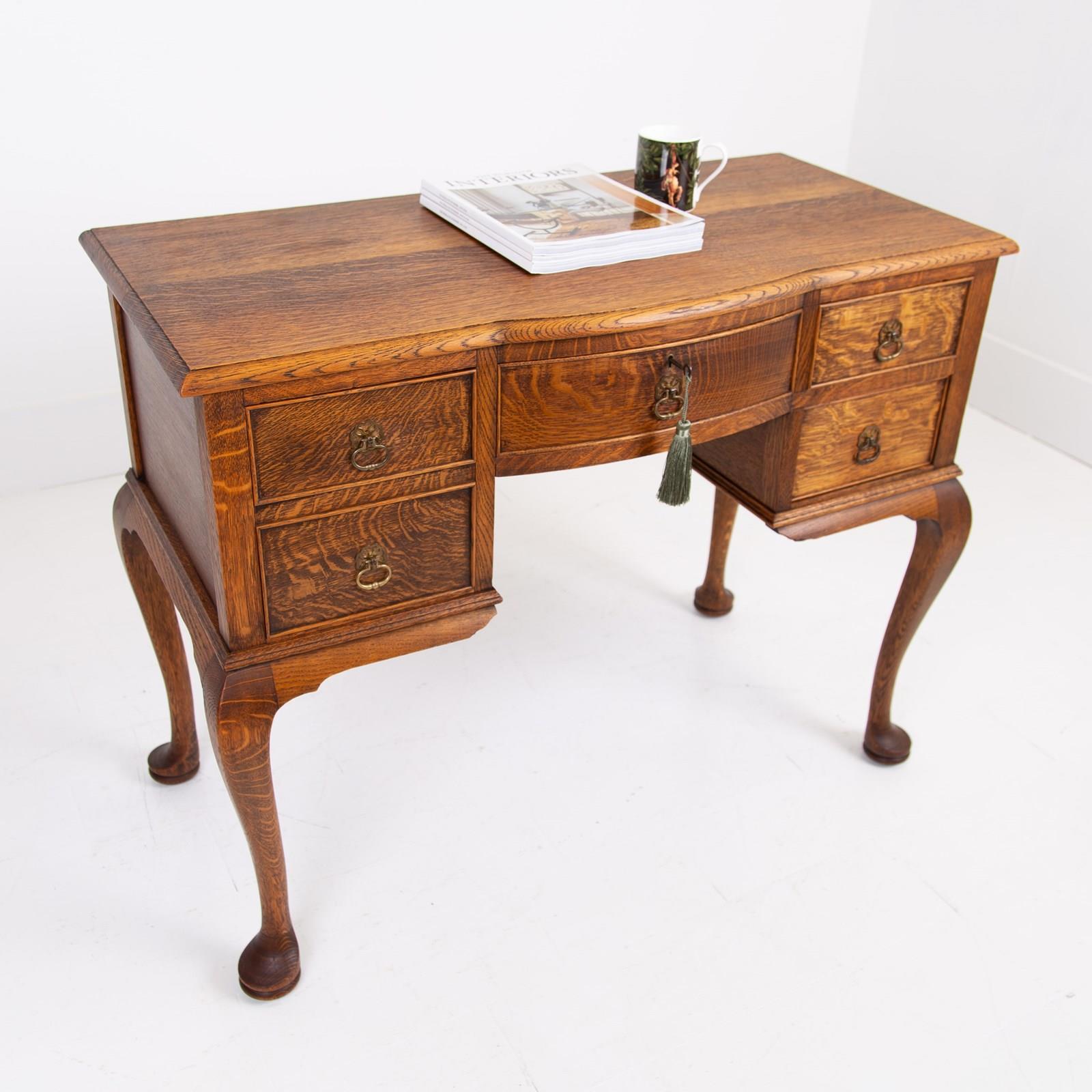 A highly attractive late 1920s 4 drawer desk in a lighter tone of English oak with a wealth of desirable features and of smaller scale than most. The desk sits on lovely pad feet and cabriole legs, we have a pleasing bow to the top drawer which comes with a working lock and key, smart cock beading to all drawers and the tone and colour of the oak is very good. Overall a quality piece for a period or modern home.