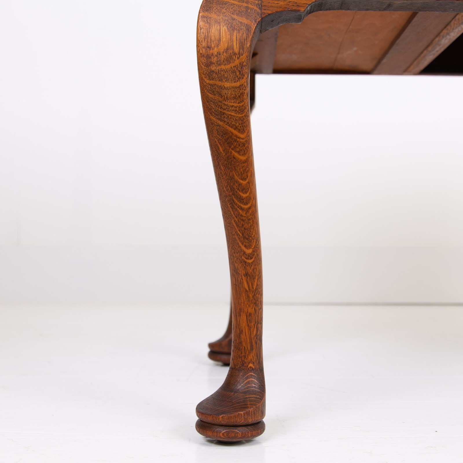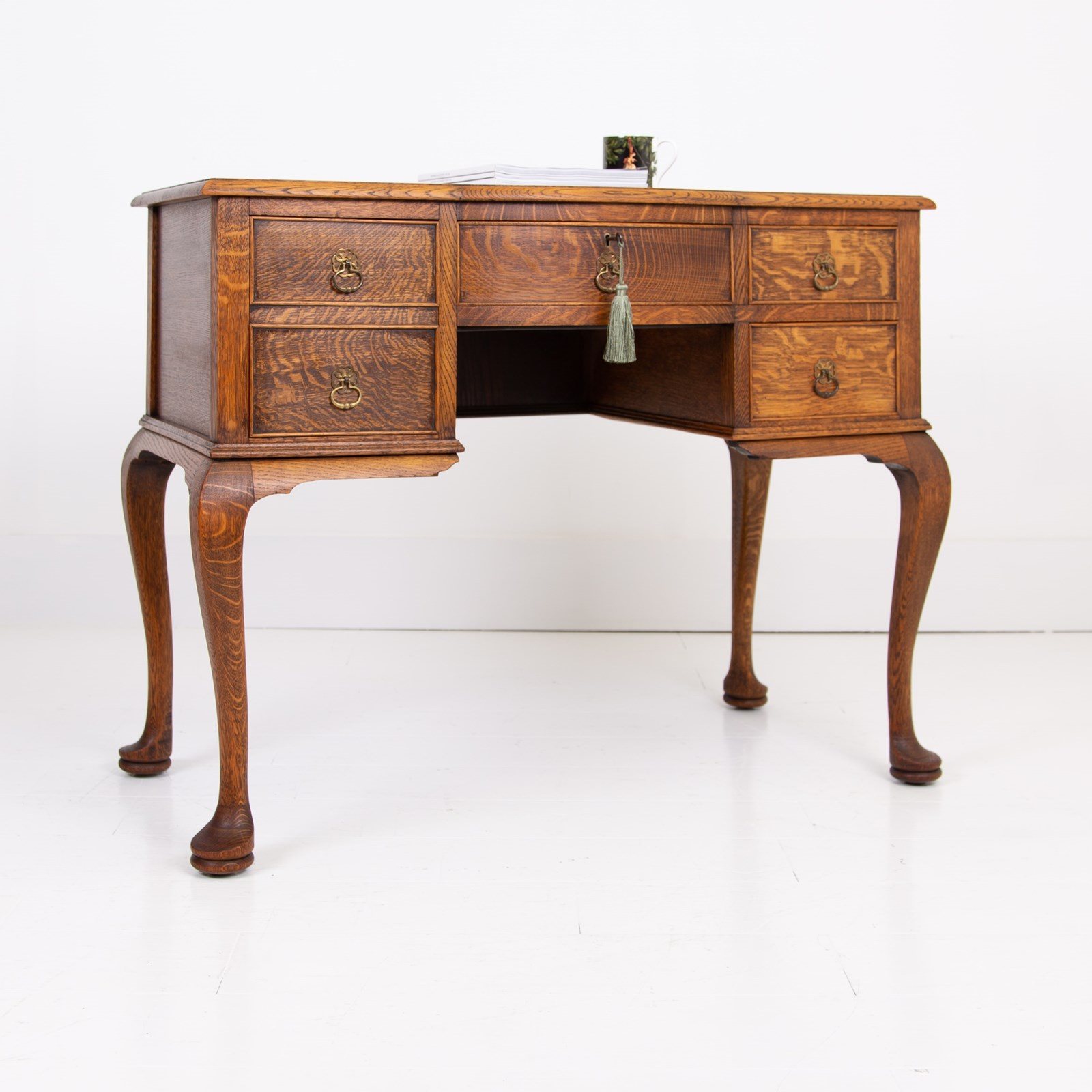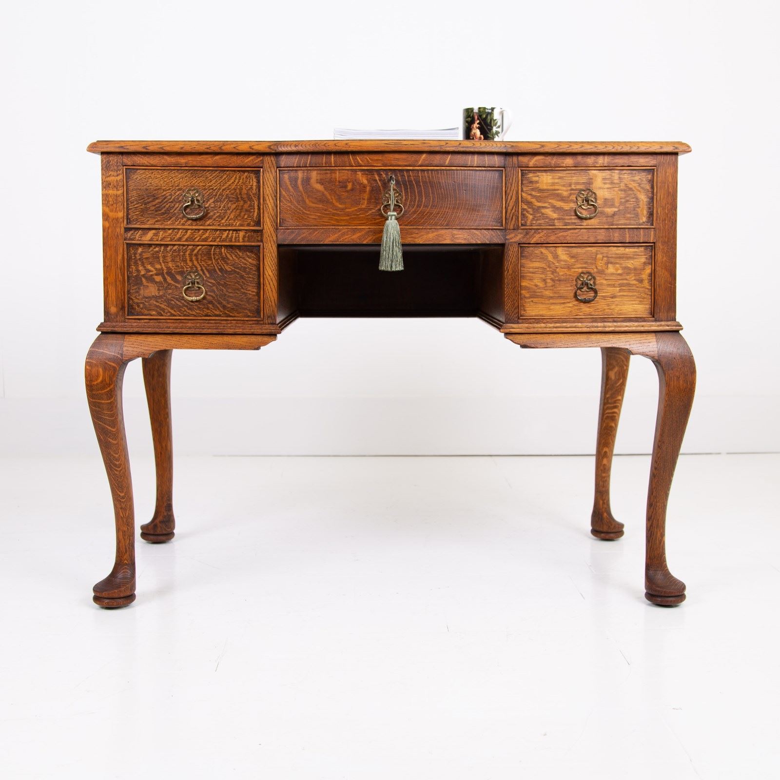 A highly attractive late 1920s 4 drawer desk in a lighter tone of English oak with a wealth of desirable features and of smaller scale than most. The desk sits on lovely pad feet and cabriole legs, we have a pleasing bow to the top drawer which comes with a working lock and key, smart cock beading to all drawers and the tone and colour of the oak is very good. Overall a quality piece for a period or modern home.