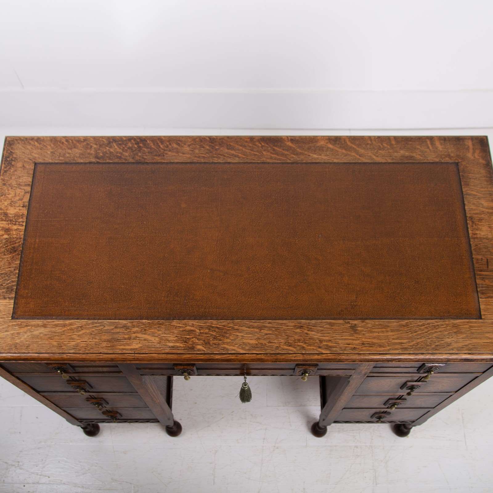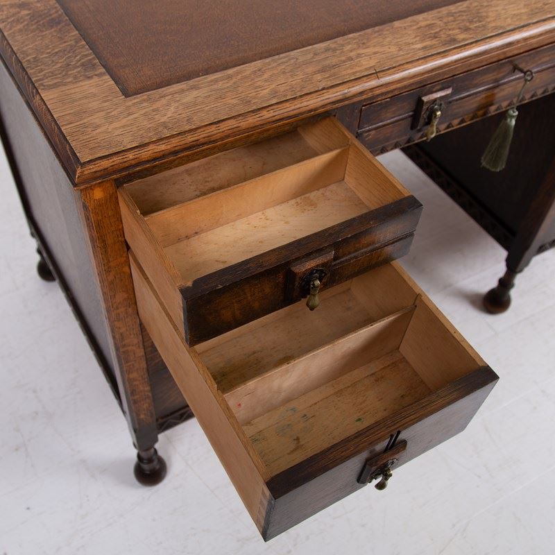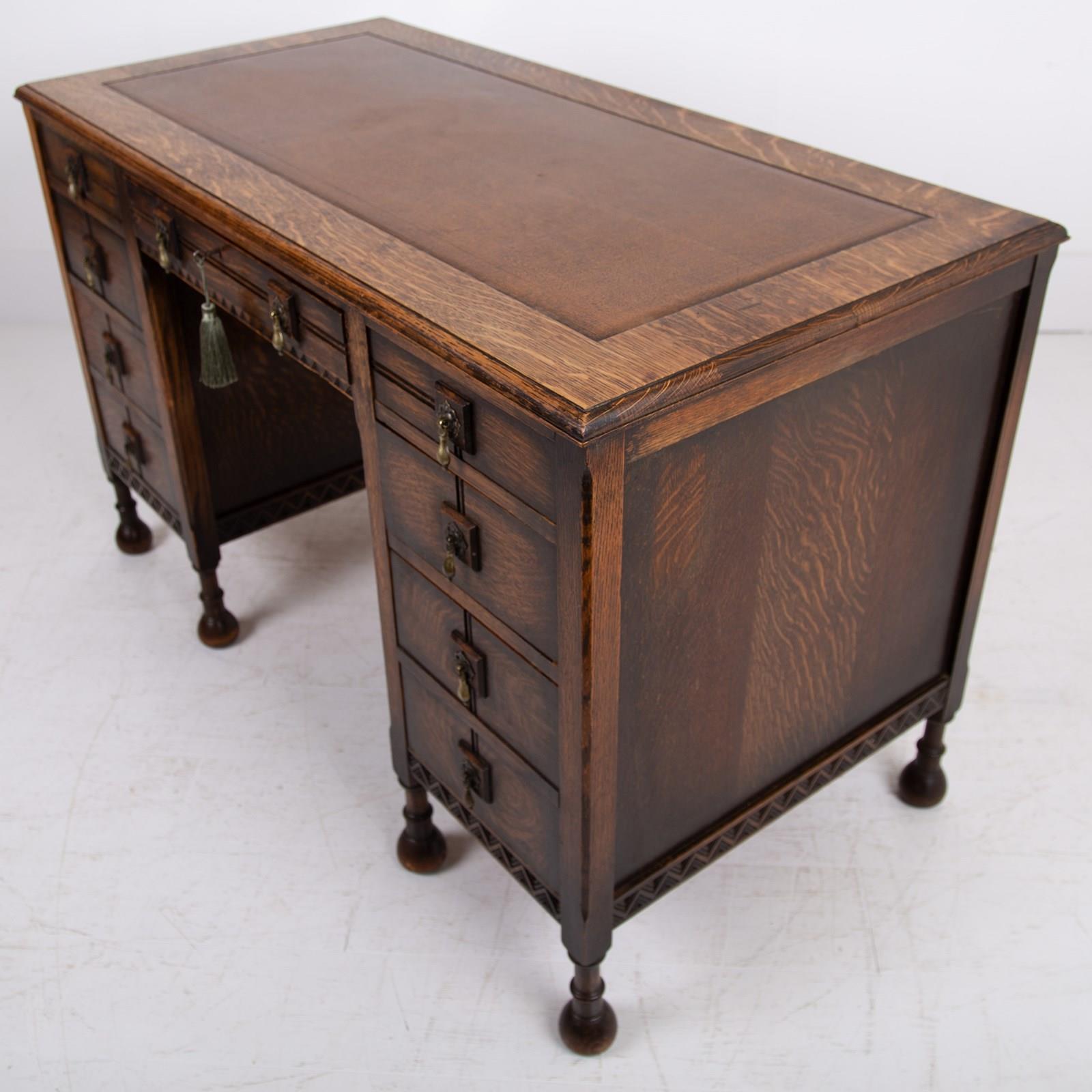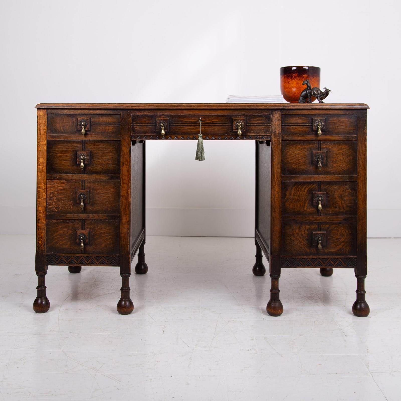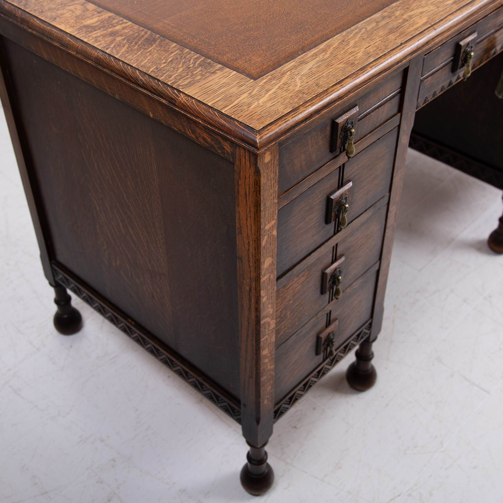 Although we have twin pedestals on this one, it is still compact and very stylish indeed with feet that terminate in lovely pear drop ends, original leather inset work area with Grecian key stamped edge, lovely original solid brass drop pendants to all drawers, slight chiselled edged oak to the front kneehole space, attractive zig zag detailed molding to some edges and the superb original untouched overall condition. As we said, a one family owned piece from new.