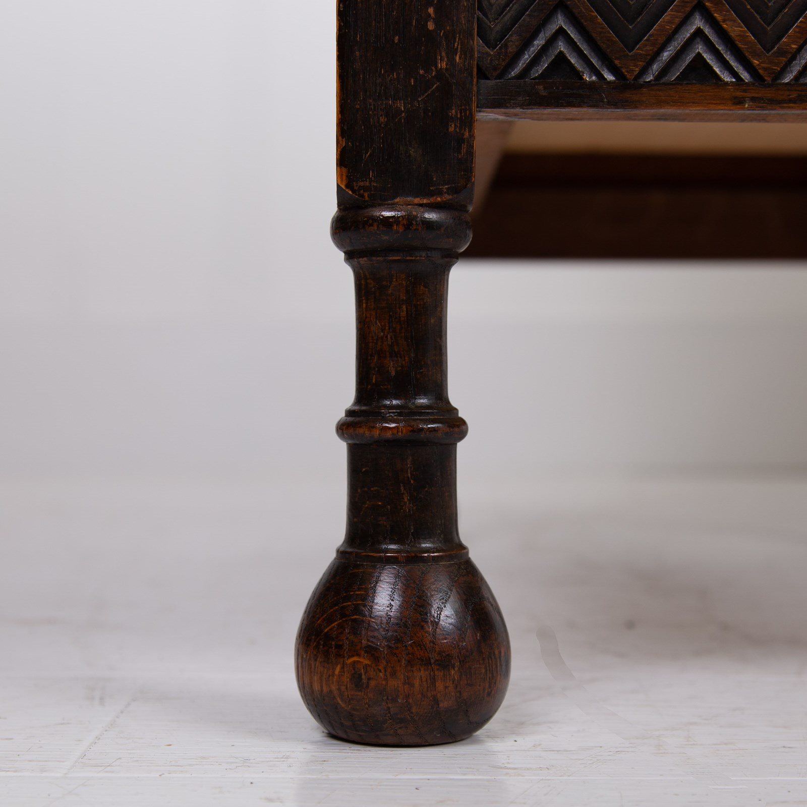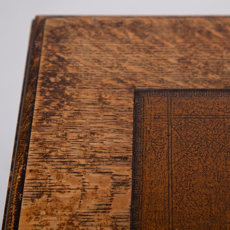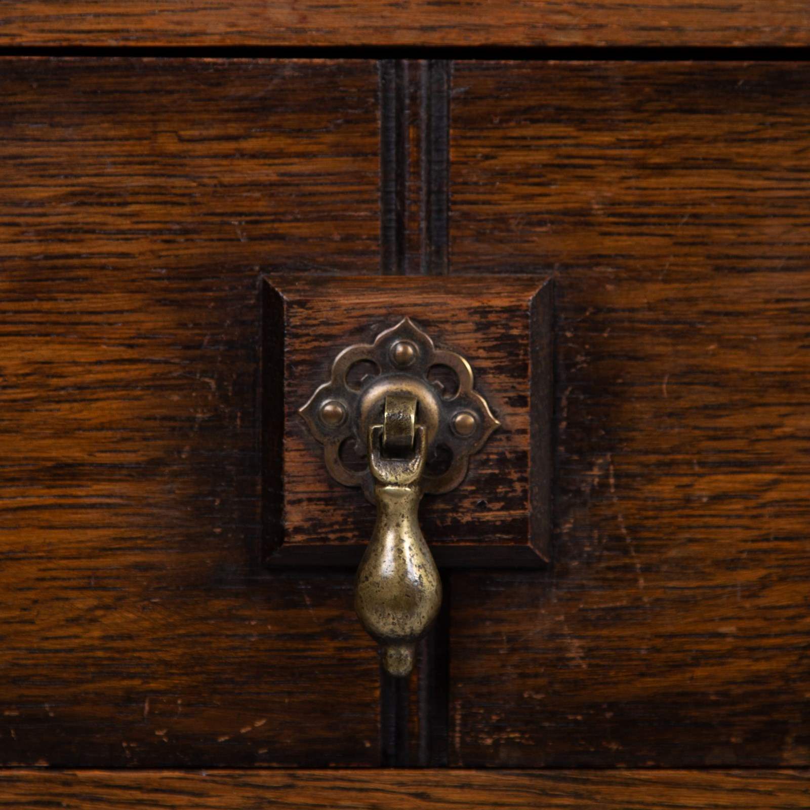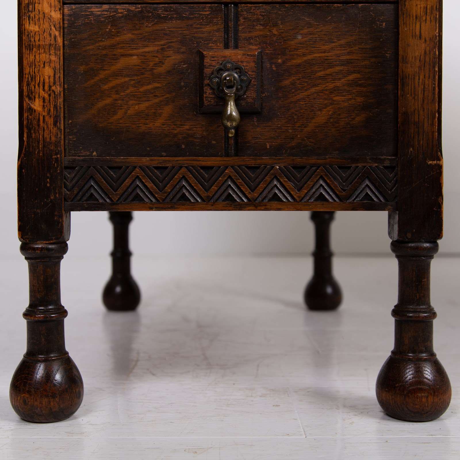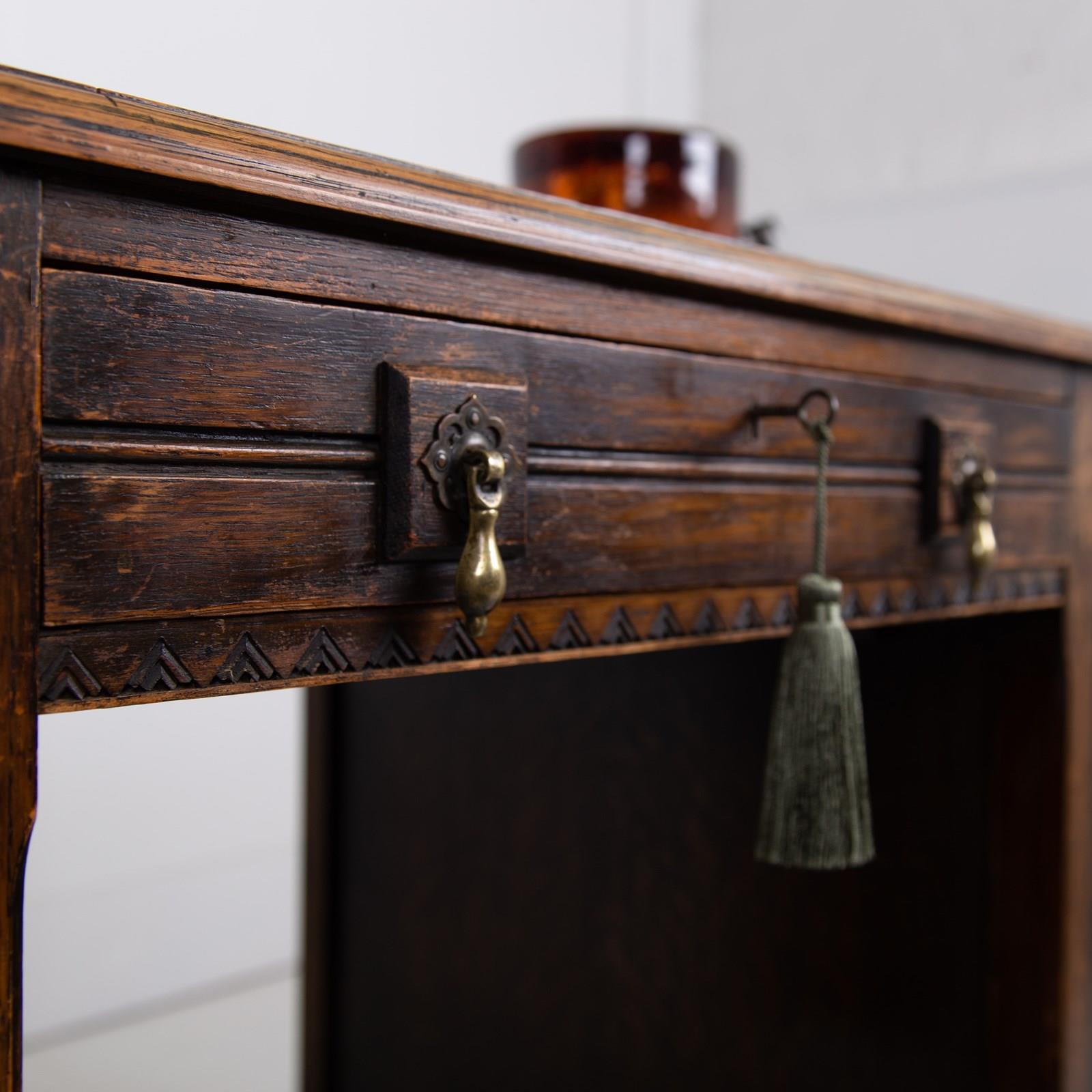 Although we have twin pedestals on this one, it is still compact and very stylish indeed with feet that terminate in lovely pear drop ends, original leather inset work area with Grecian key stamped edge, lovely original solid brass drop pendants to all drawers, slight chiselled edged oak to the front kneehole space, attractive zig zag detailed molding to some edges and the superb original untouched overall condition. As we said, a one family owned piece from new.