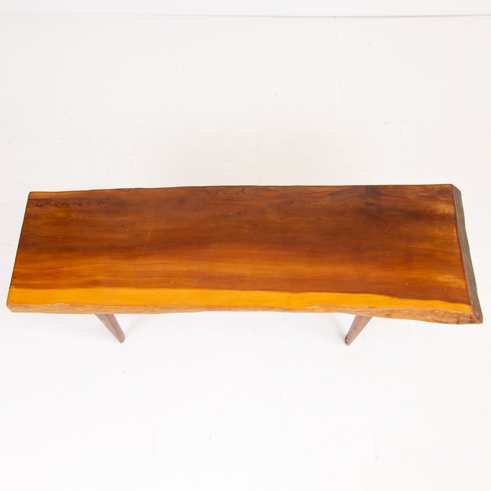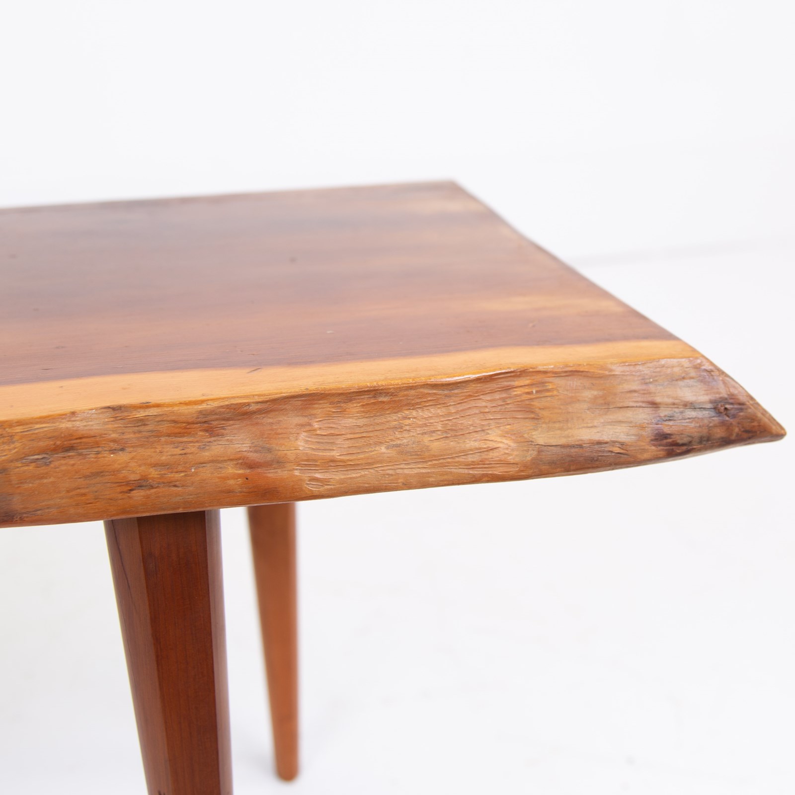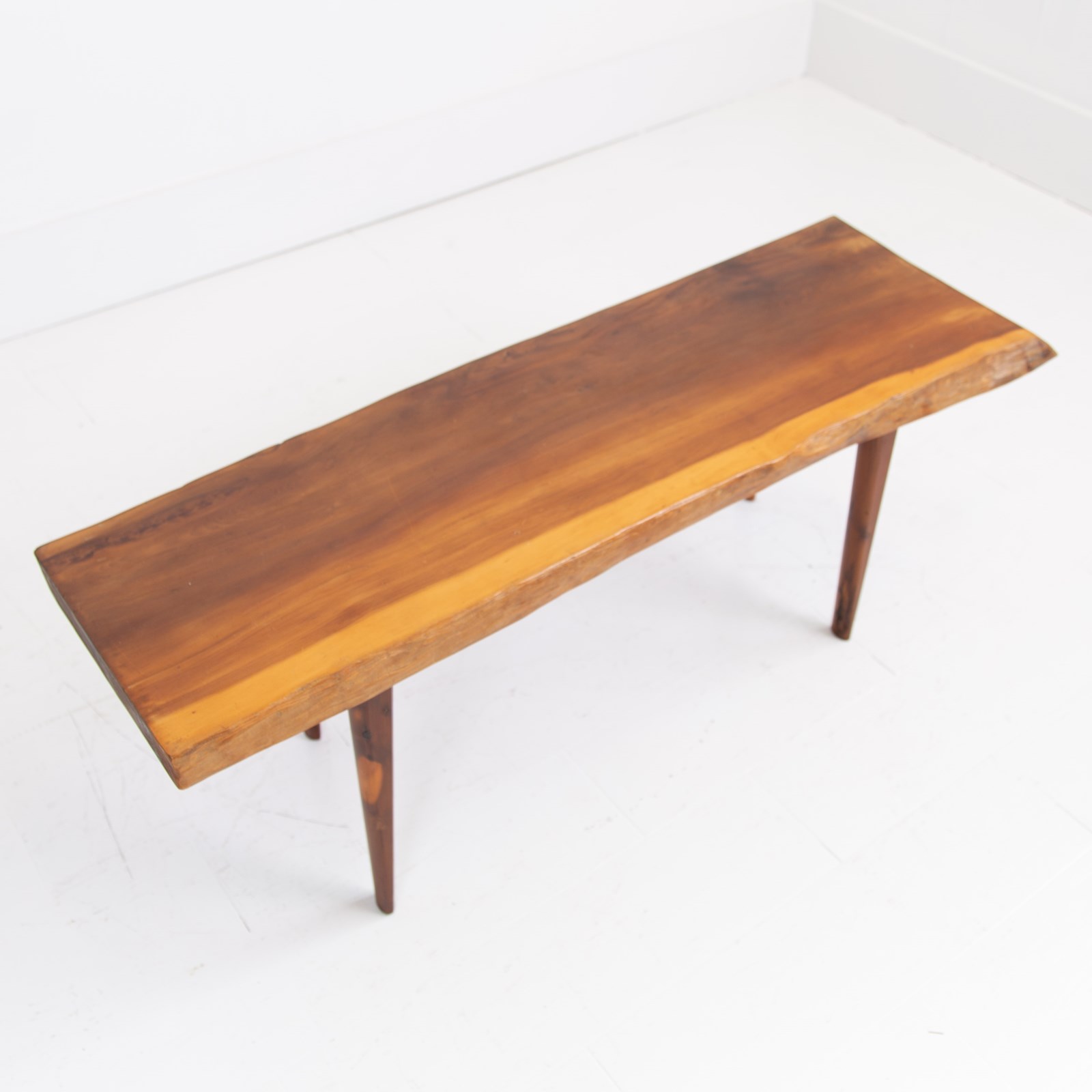 A ‘live edge’ Mid Century coffee table from Reynolds of Ludlow, made from yew wood. The table features a natural, irregularly shaped tabletop that highlights the organic and natural nature of the wood grain and natural edges. The surface possesses a smooth finish making the unique characteristics of the yew glow. Makers label to the underside.