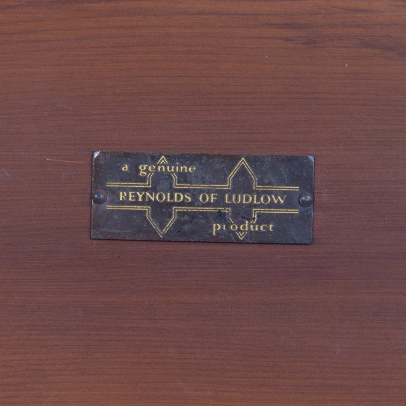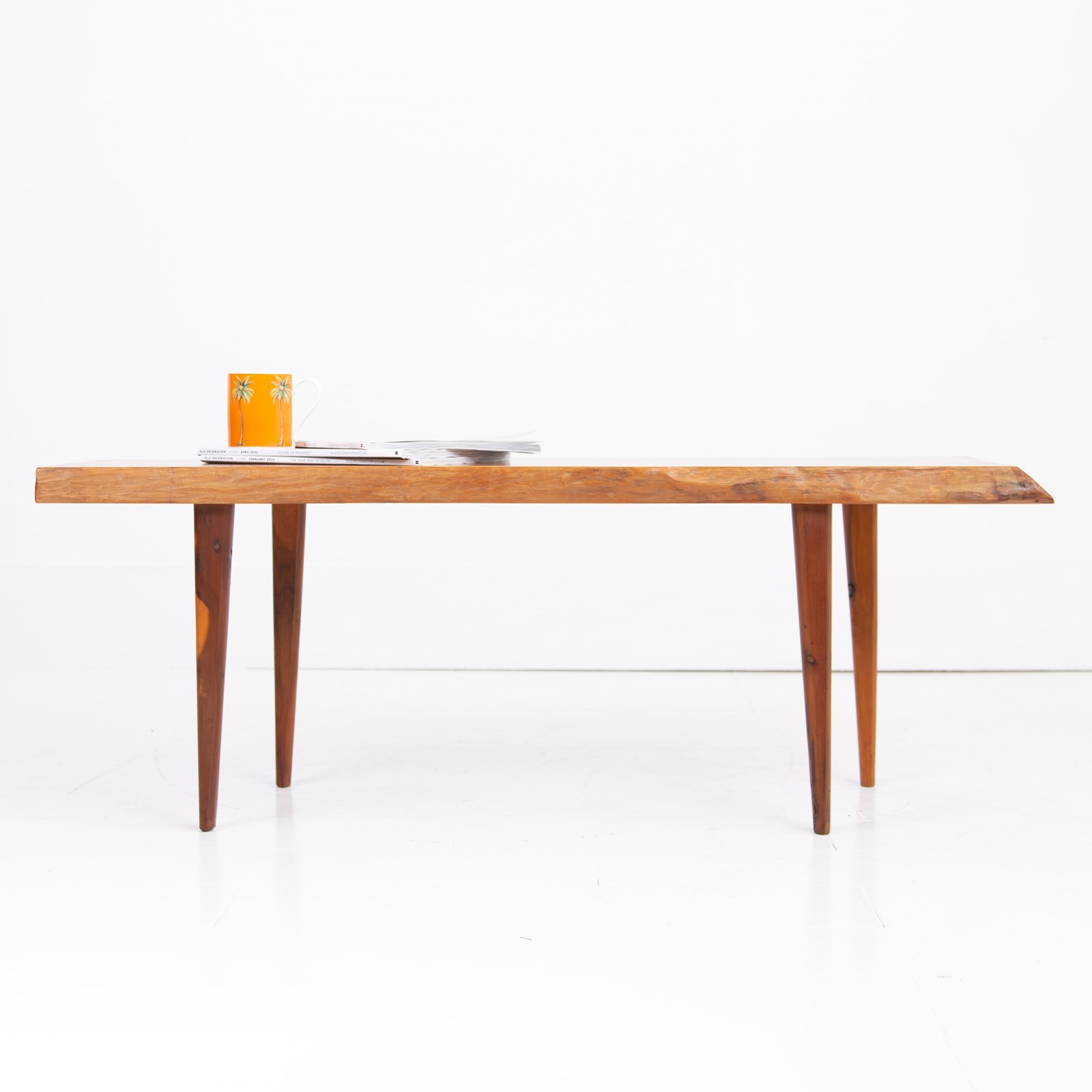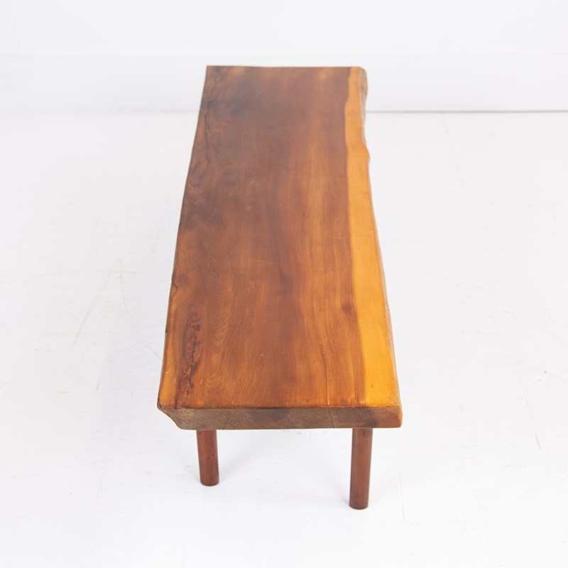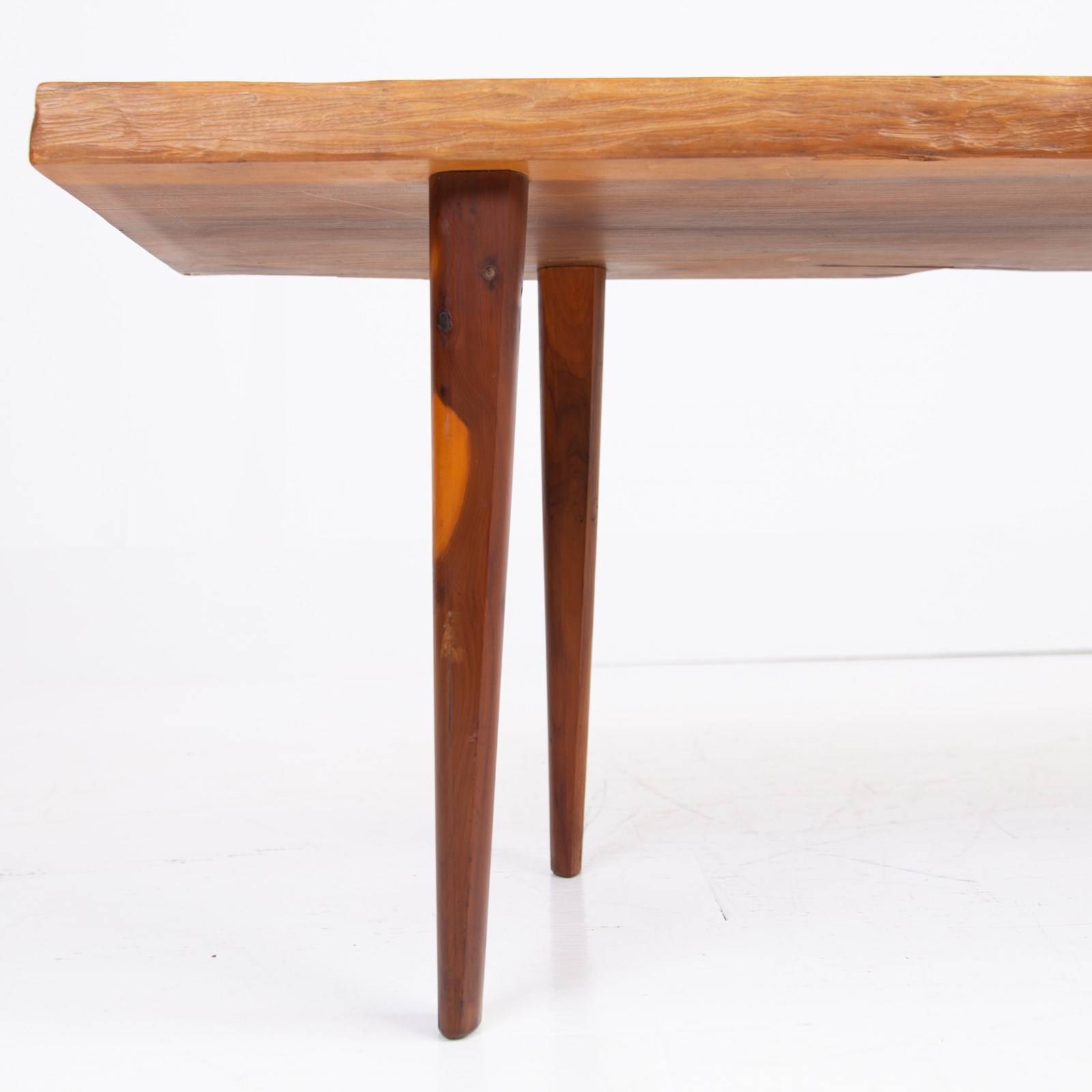 A ‘live edge’ Mid Century coffee table from Reynolds of Ludlow, made from yew wood. The table features a natural, irregularly shaped tabletop that highlights the organic and natural nature of the wood grain and natural edges. The surface possesses a smooth finish making the unique characteristics of the yew glow. Makers label to the underside.