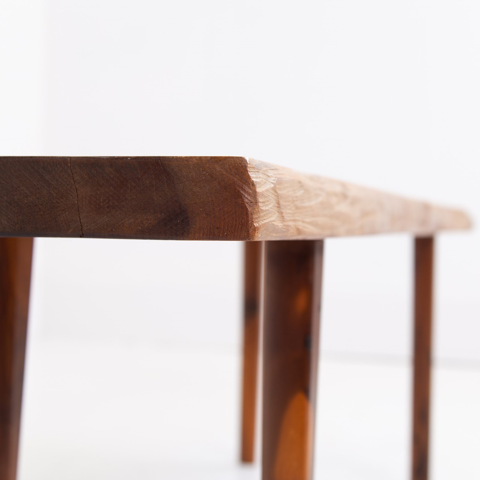 The table stands on four tapered legs, which are lightly angled and crafted from a complementary wood, giving it that Mid Century modern feel. The simplicity of the design, combined with the natural elements, makes this piece both rustic and elegant, suitable for a variety of interior styles. Ready to place, expect sensible day to day.