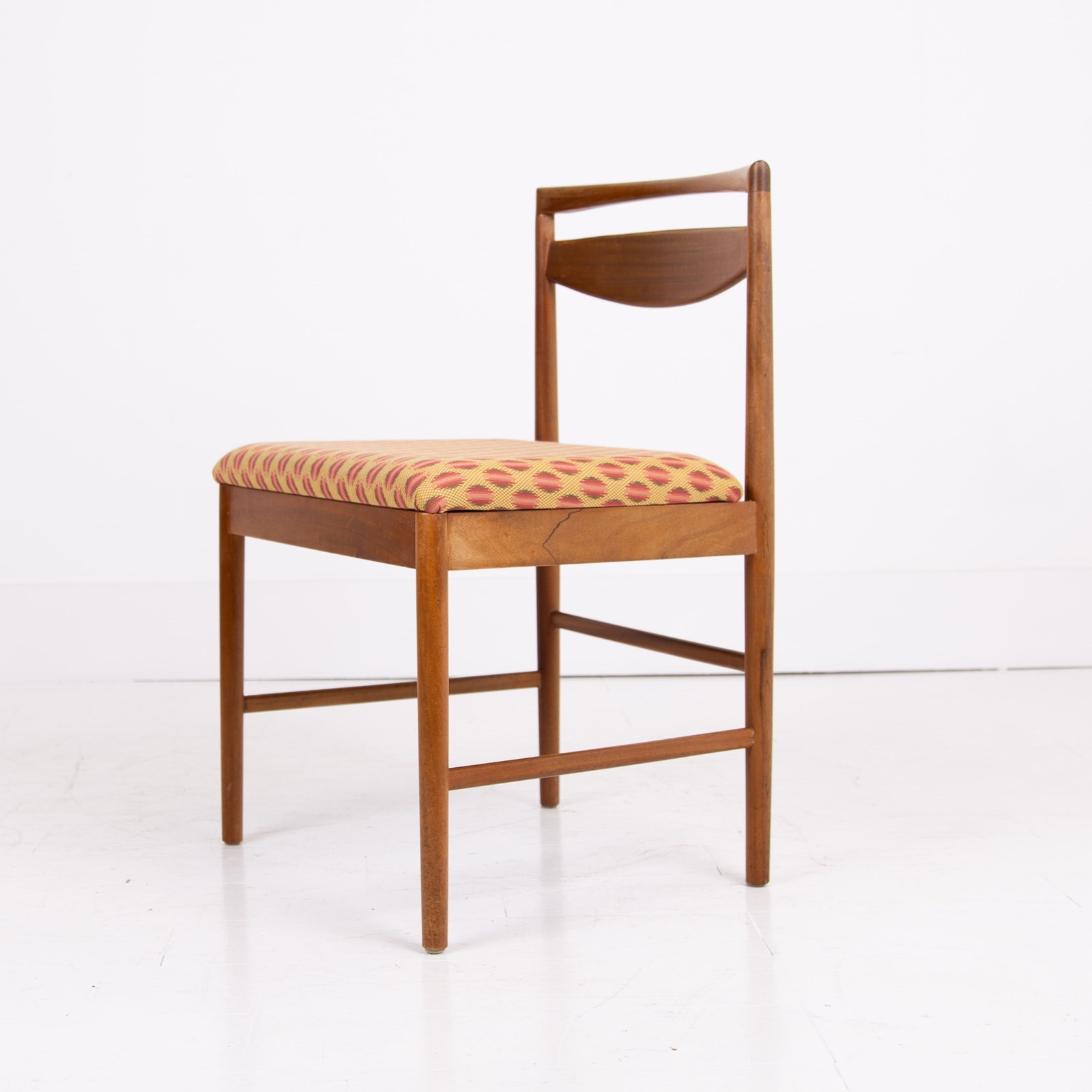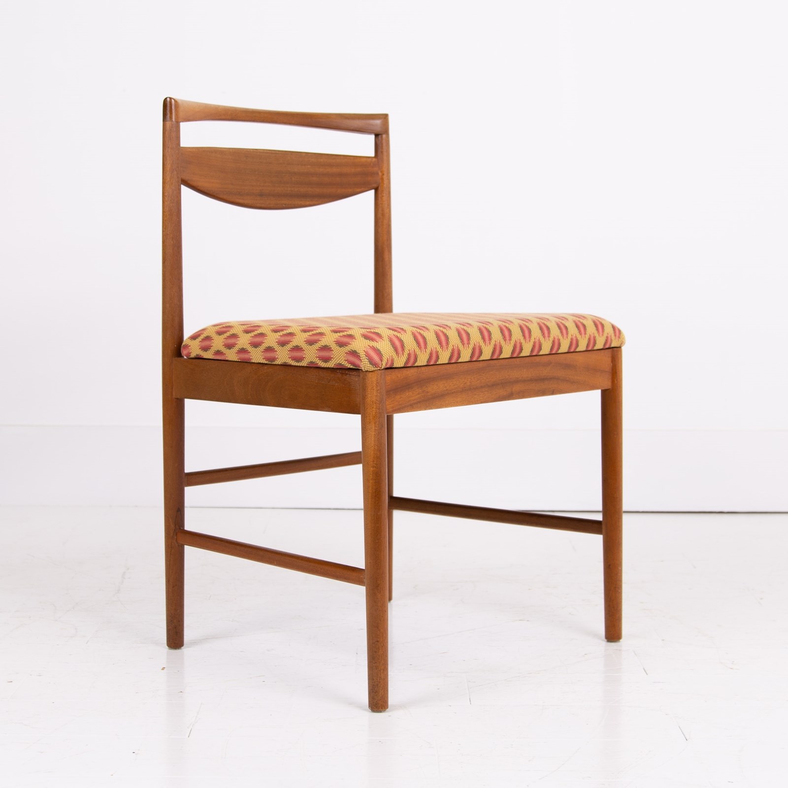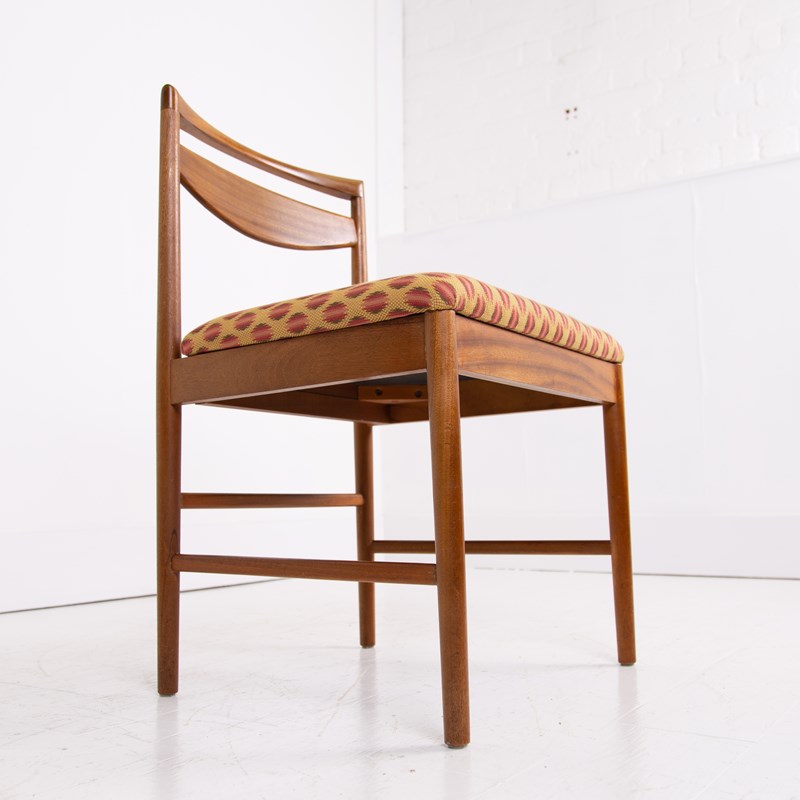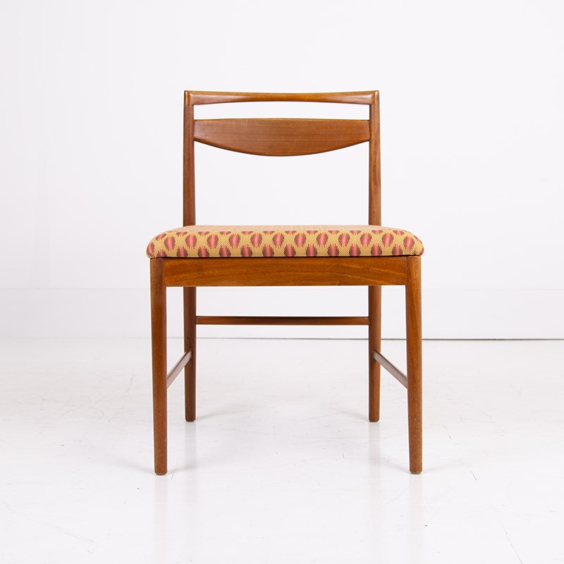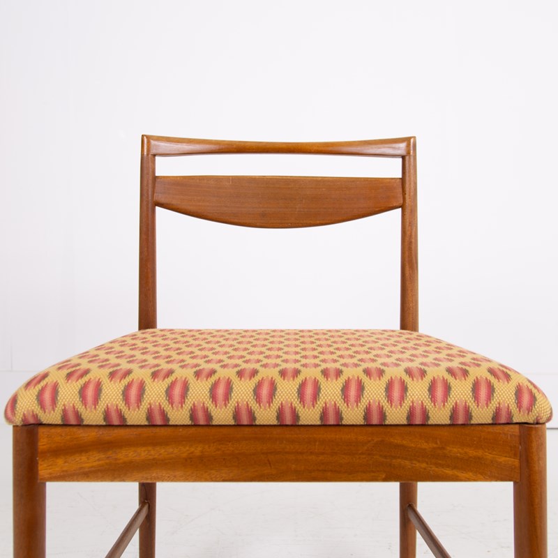 We have a super set of McIntosh 9433 model teak dining chairs designed by Tom Robertson in the 1970s. The design incorporates simple lines with a nod to its Danish counterparts from the same era. The well sized seats have been recently covered in a high quality, woven Zoffany fabric which is in perfectly good order. If you wish for another fabric Mark, our upholsterer could reupholster for £50 per chair plus VAT and you would require 3 to 4 metres of fabric which we can assist with samples etc.