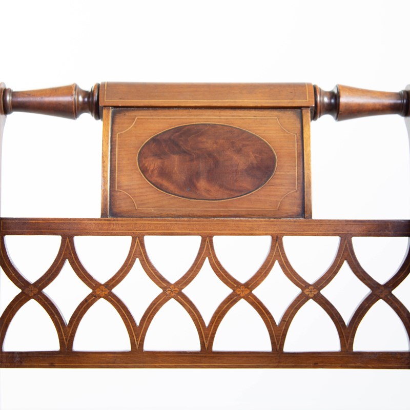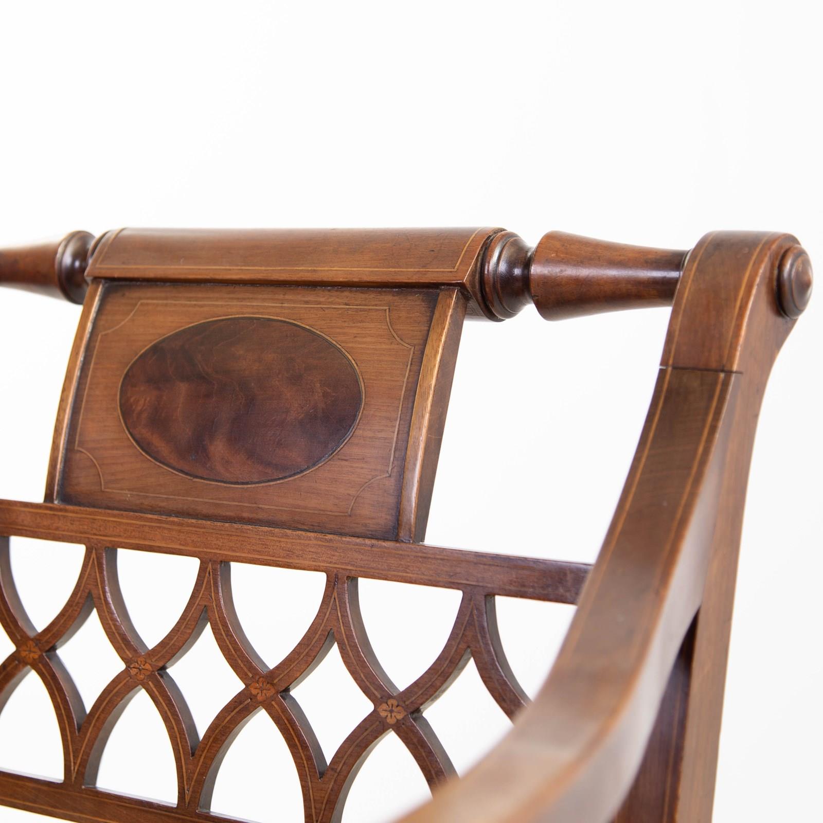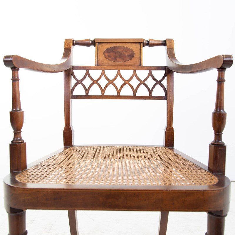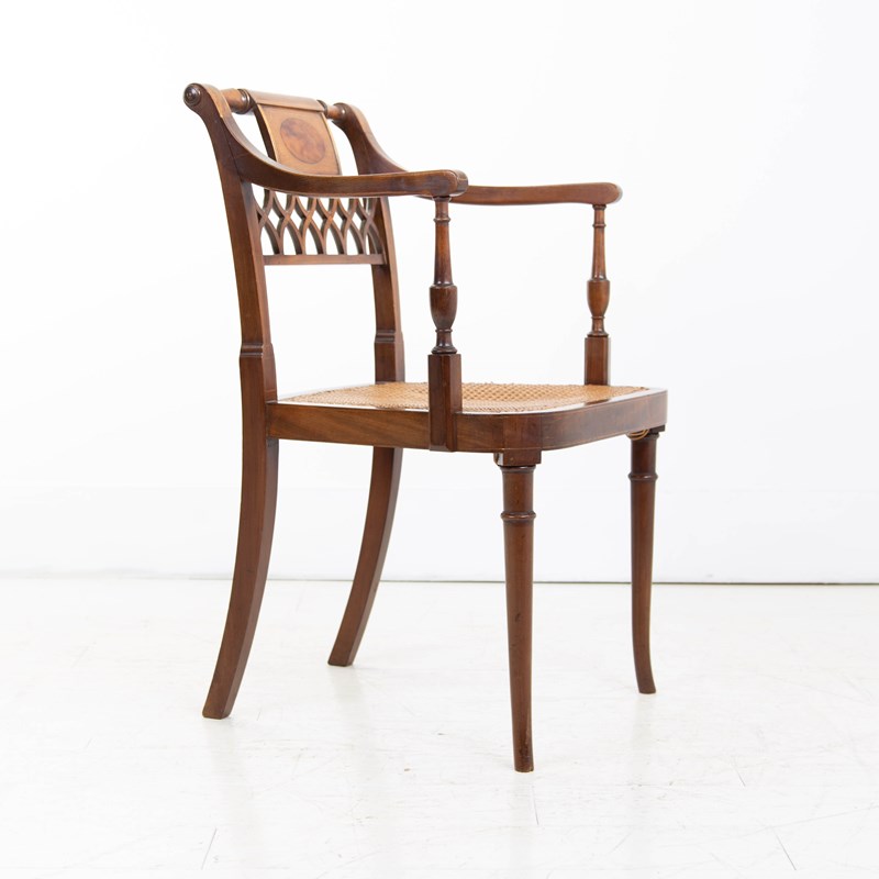 A particularly handsome Sheraton Revival occasional armchair with cane seat. It's a handsome chair with well shaped slender legs, a shield style back and fine satinwood inlay to the arms.