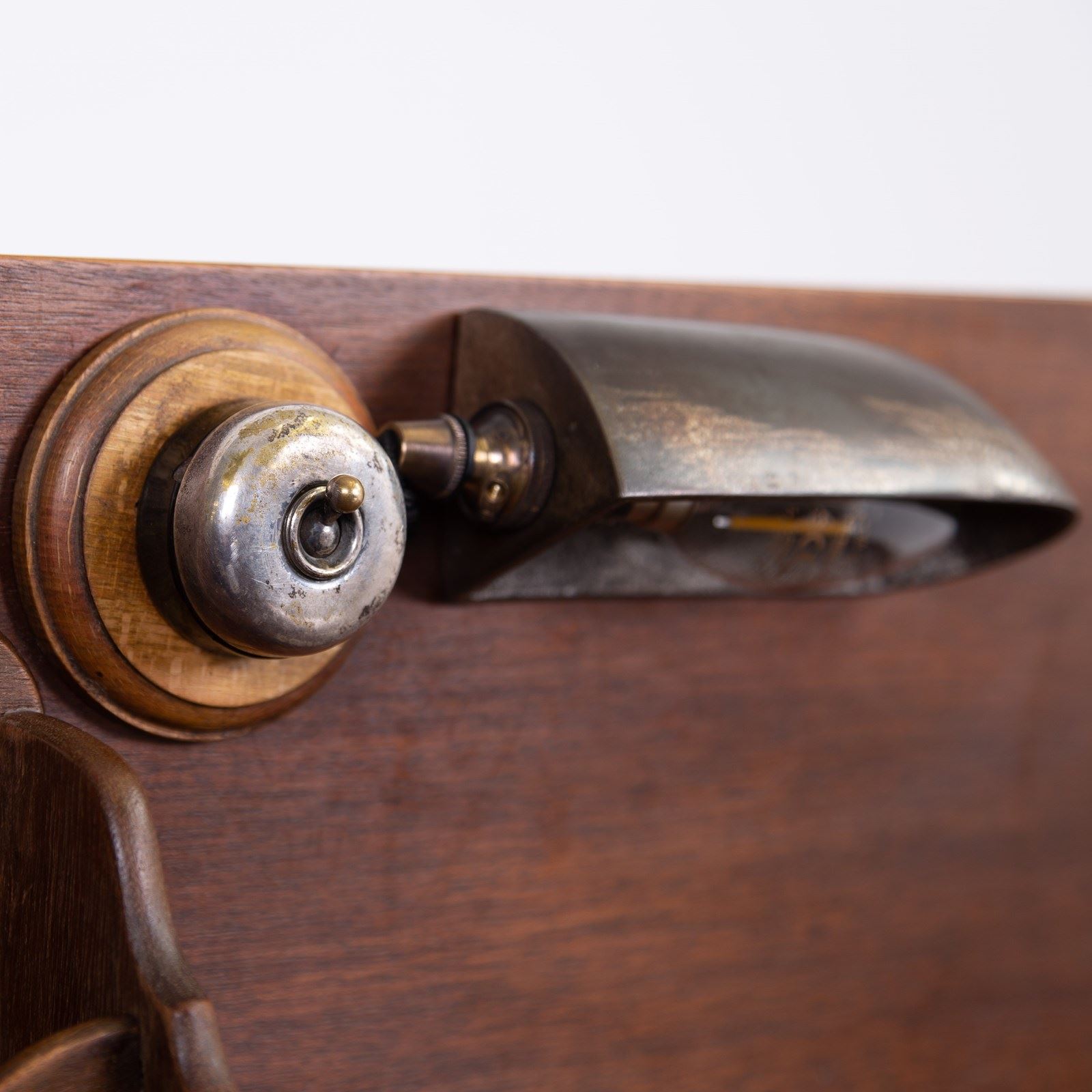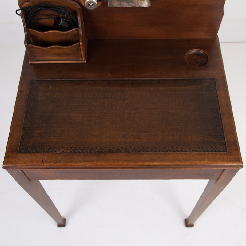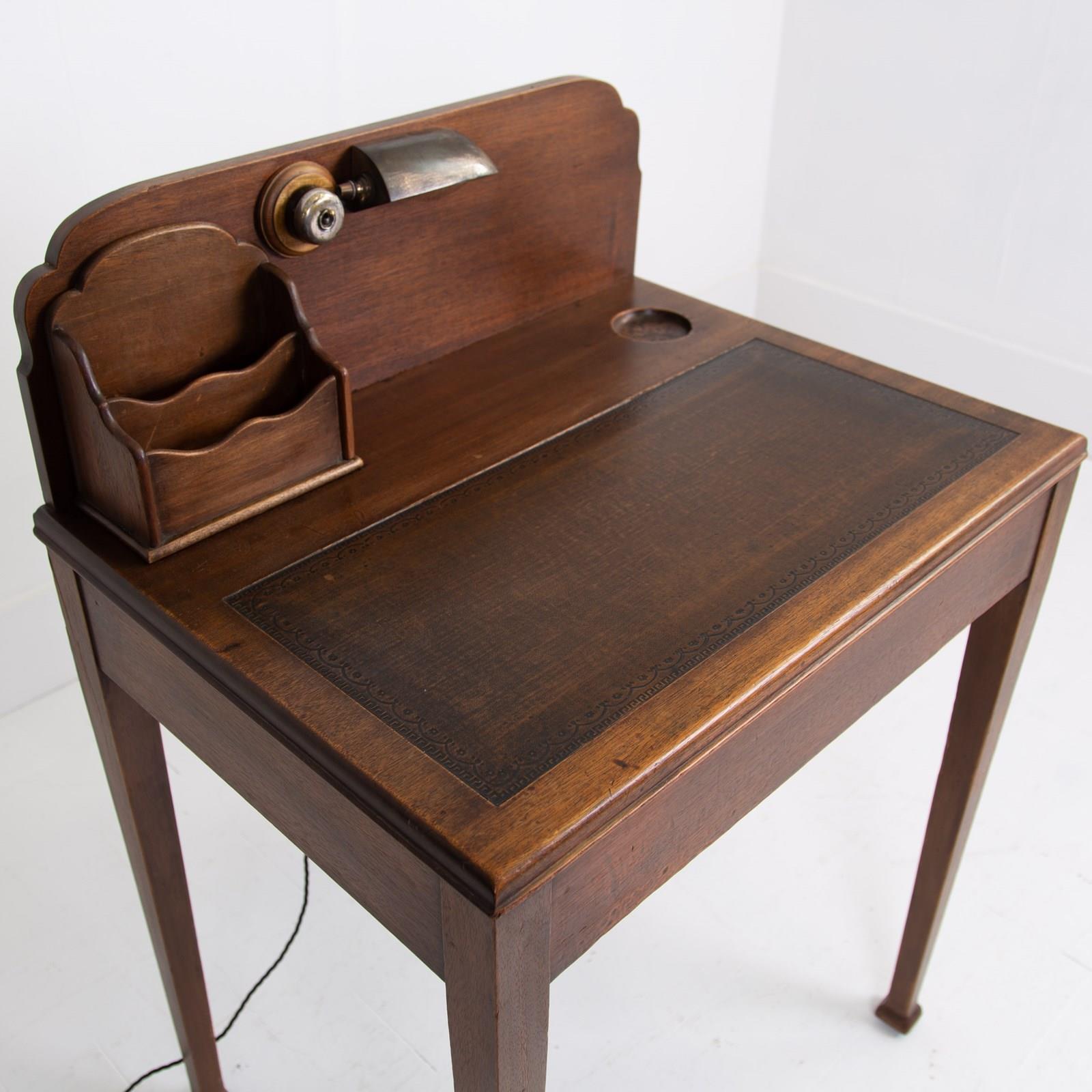 What an utter delight - we have a small workers desk, English C1920 with a little bankers style lamp with crabtree switch attached to the back alongside a little letter rack. It’s of a smaller scale than most with its original leather inset top, slender well shaped legs and of course the little lamp.
