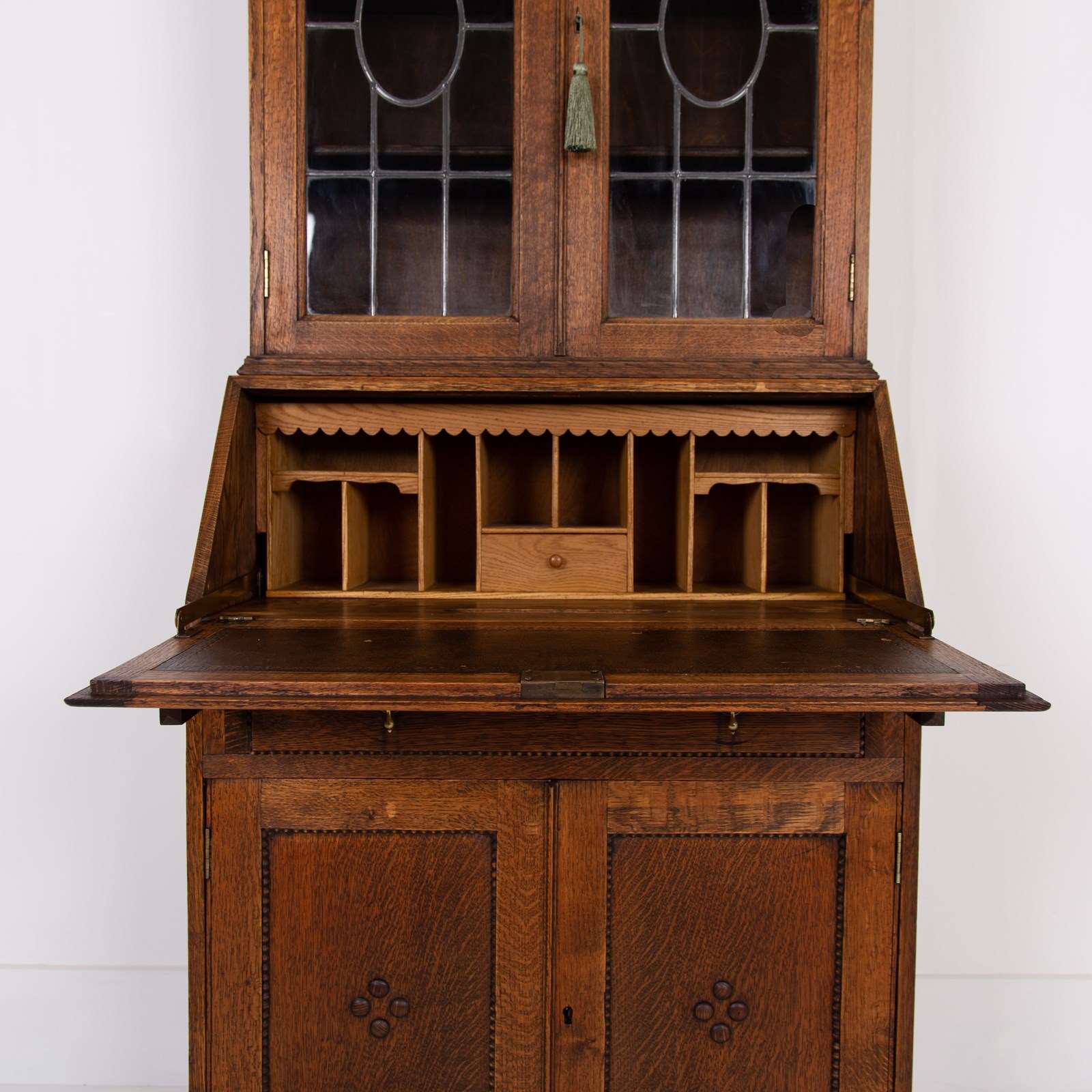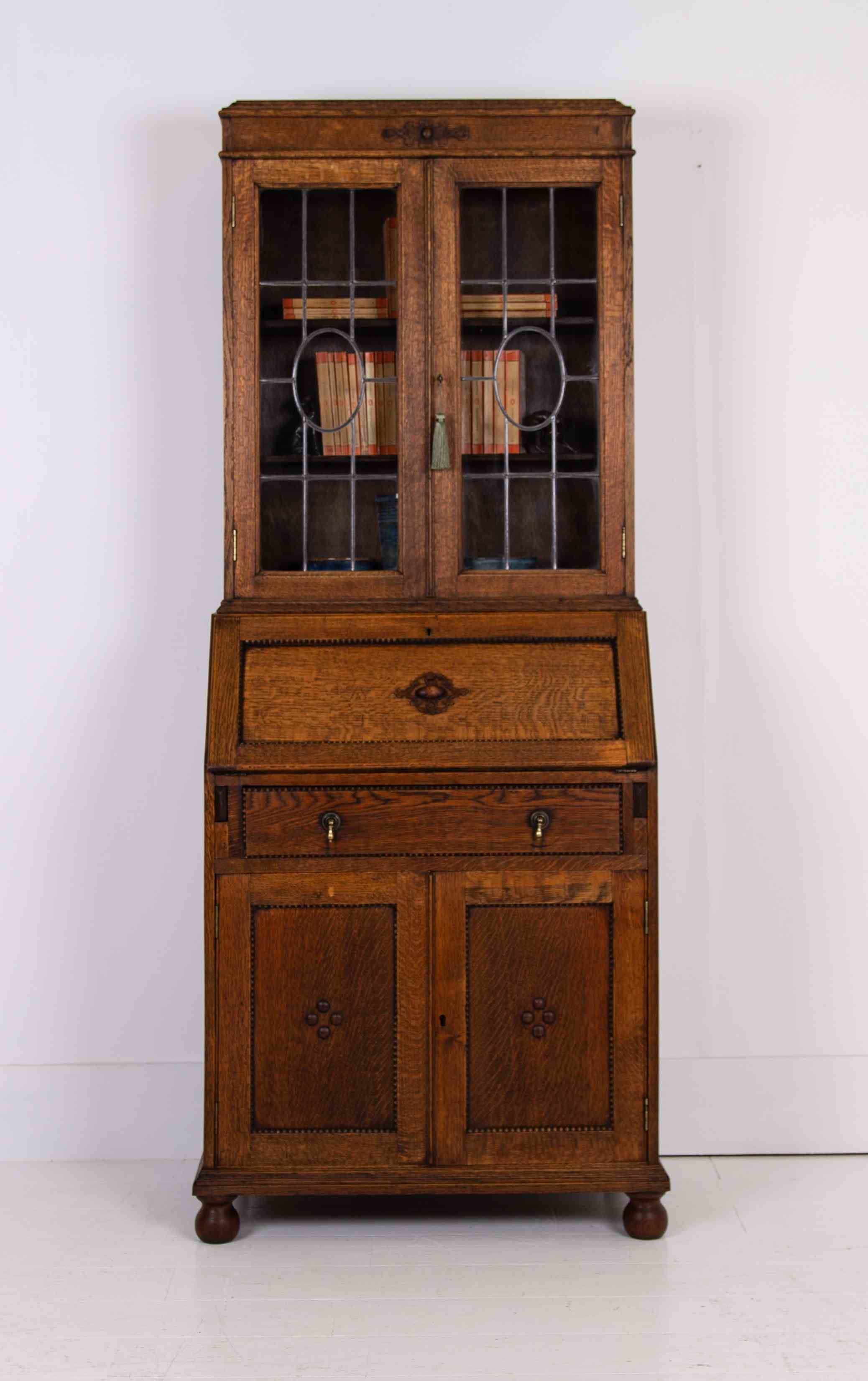 It sits in fine order with its appealing patterned lead glazed oak framed top section, fitted drop down interior, original leather writing area, attractively beaded long drawer with solid brass drop knobs, beaded door cupboard and ball feet.