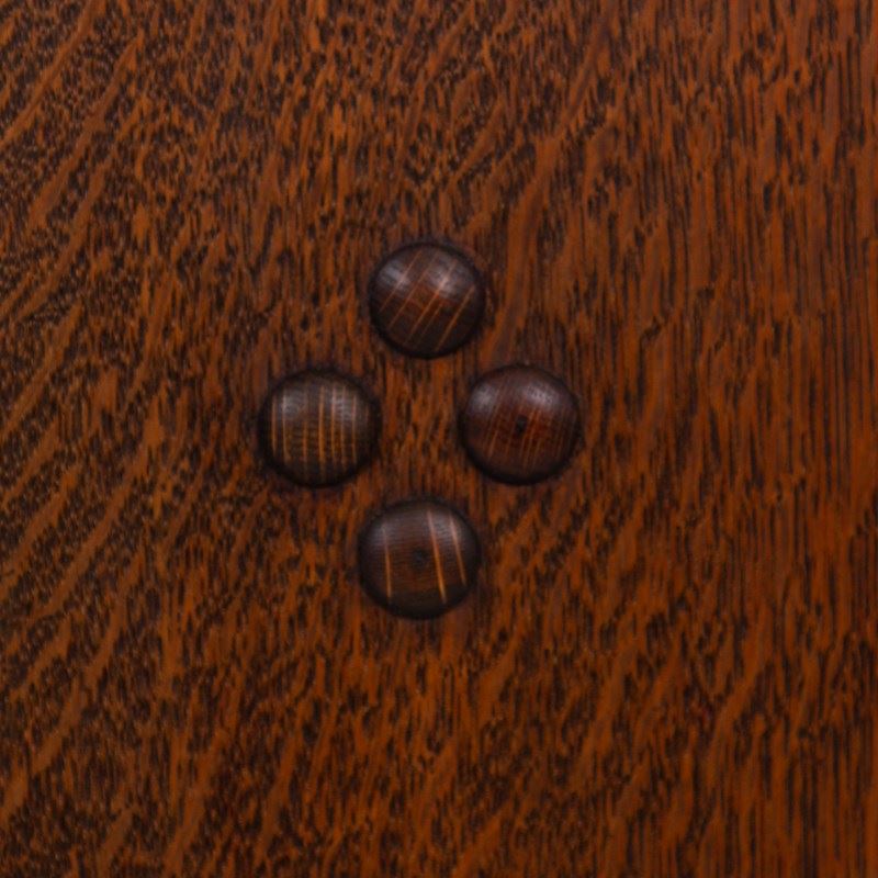 This piece has been carefully repolished in our workshop and comes with working locks and a key. No cracks or repairs to the original glass with two fixed shelves to the glazed section and a removable shelf to the cupboard. We do have a darker round mark to one side of the lower section. The piece separates into 2 for easier moving and placing.