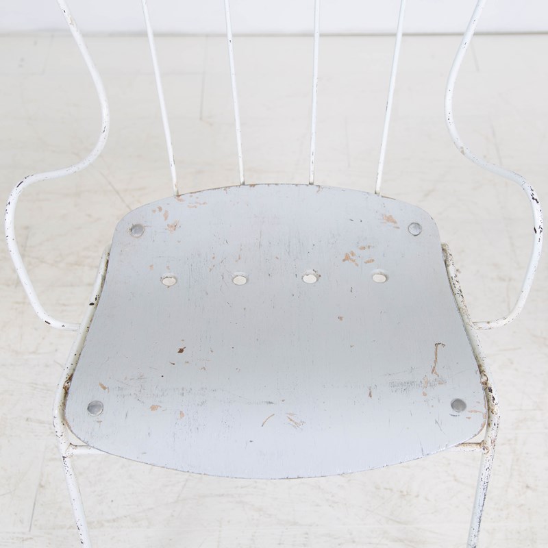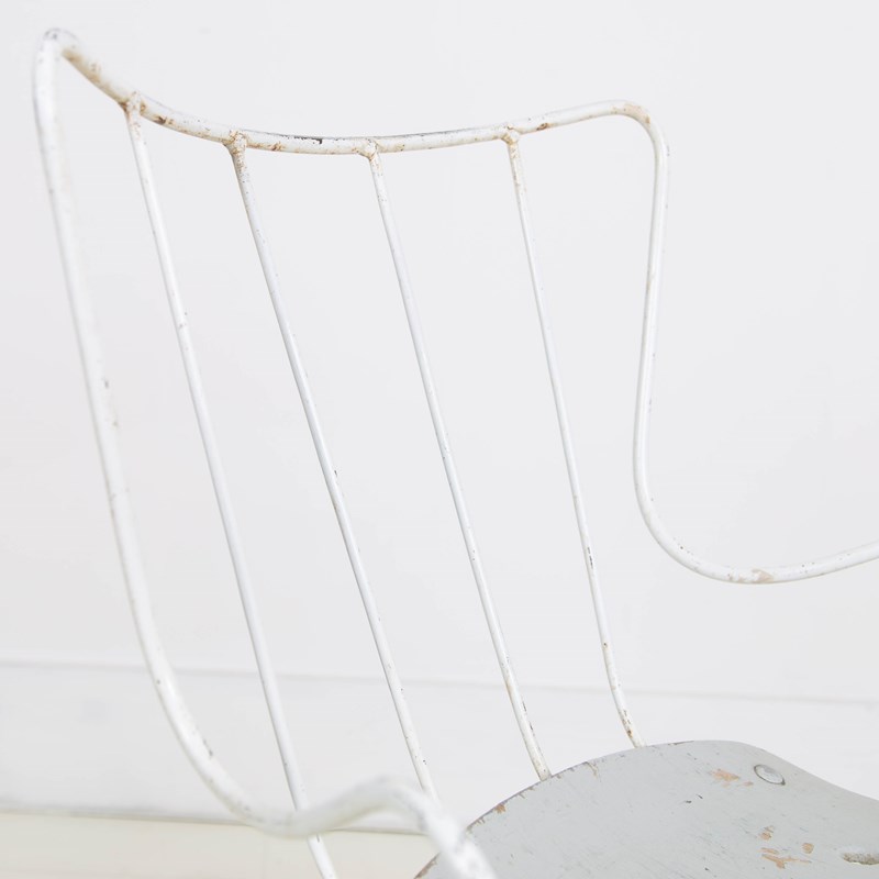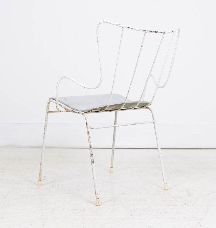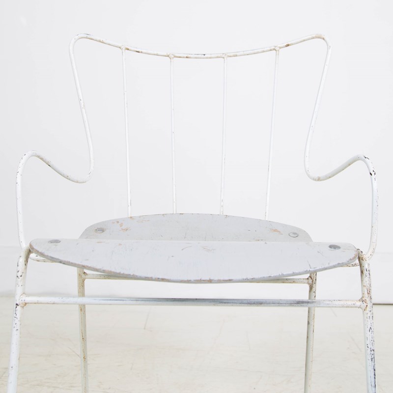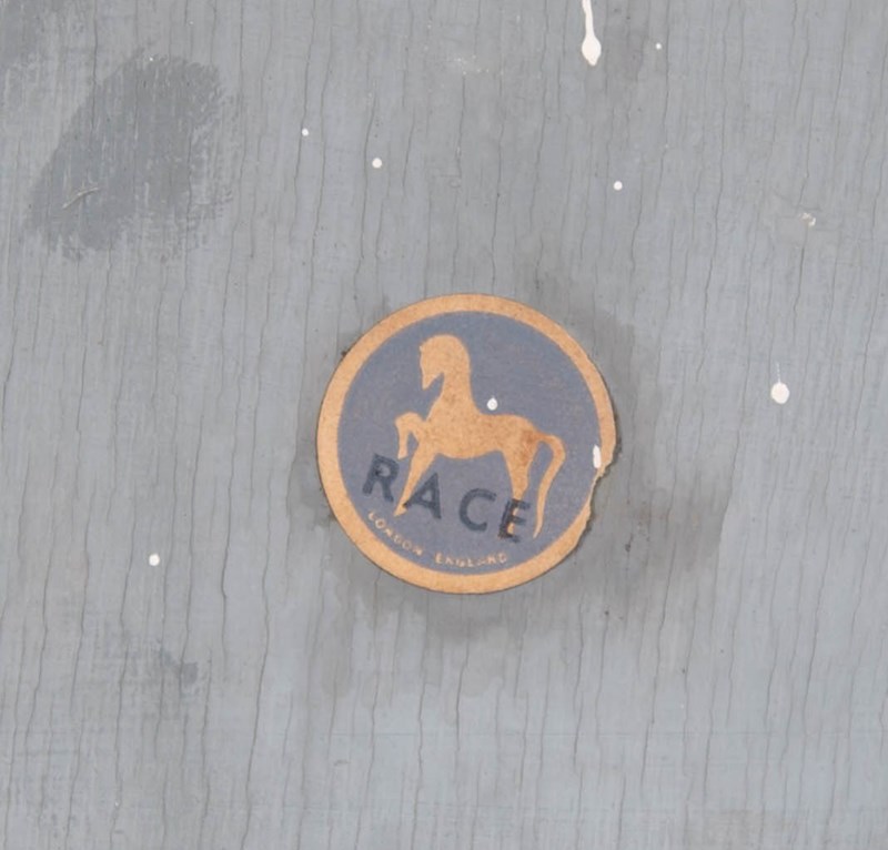 This is a good earlier one, surviving in a great unrestored condition. The chair is firm with the plywood seat with wear and the white metal frame again age worn. We have the Race label to the underside of the seat.