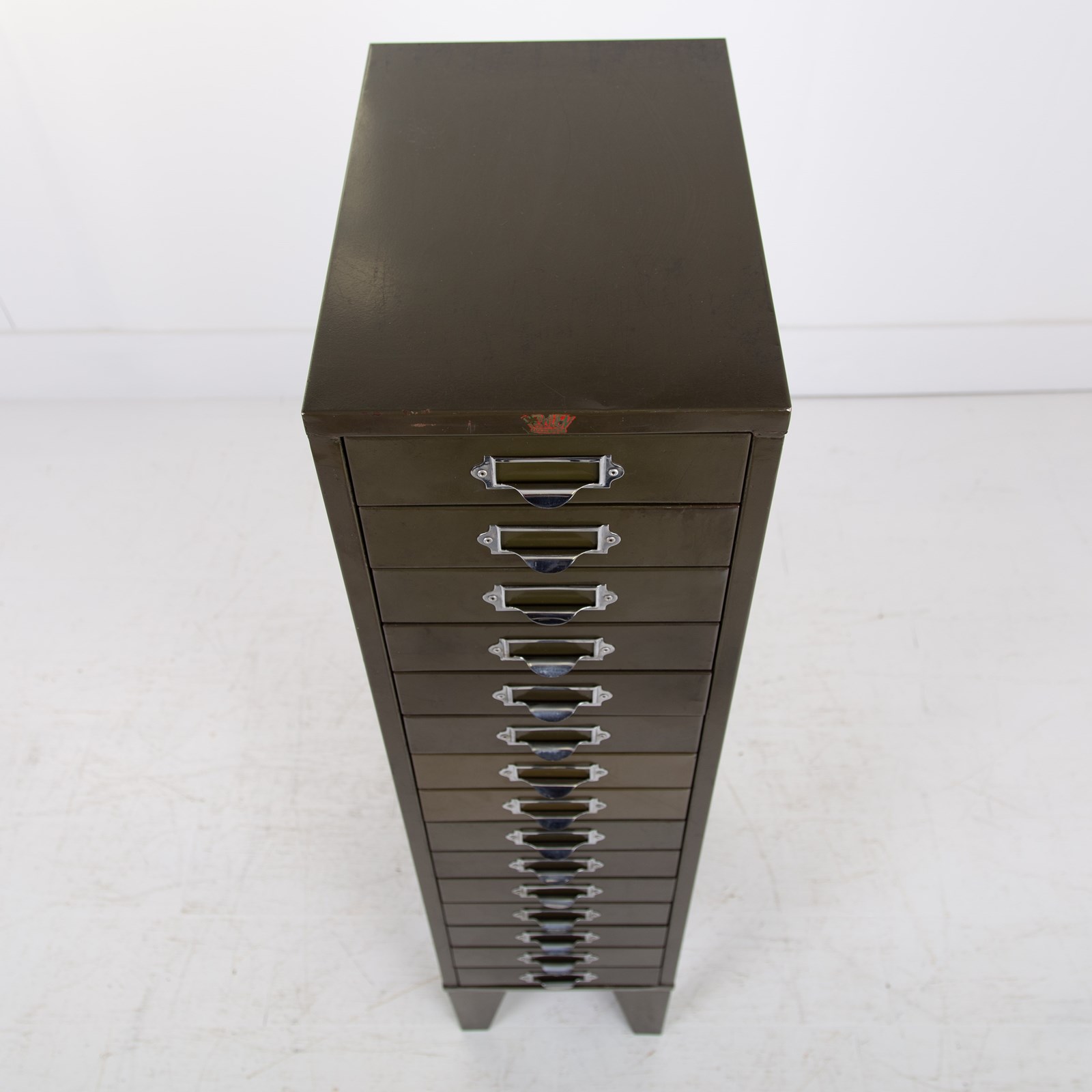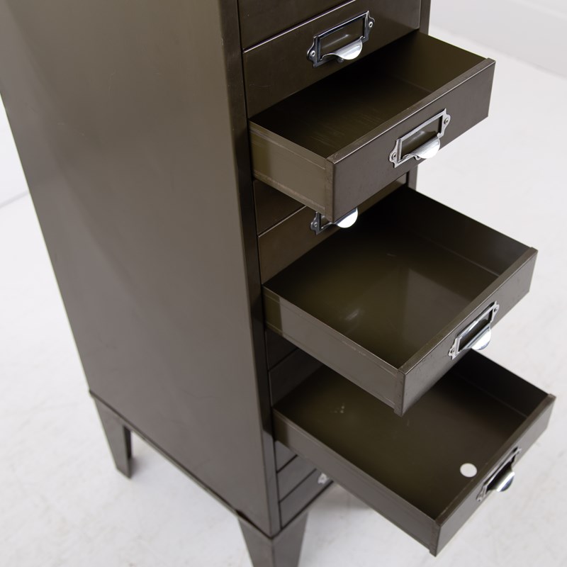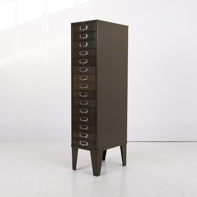 A good looking, slim 15 drawer cabinet by Howden in classic vintage office green in fine order and ready for placing.