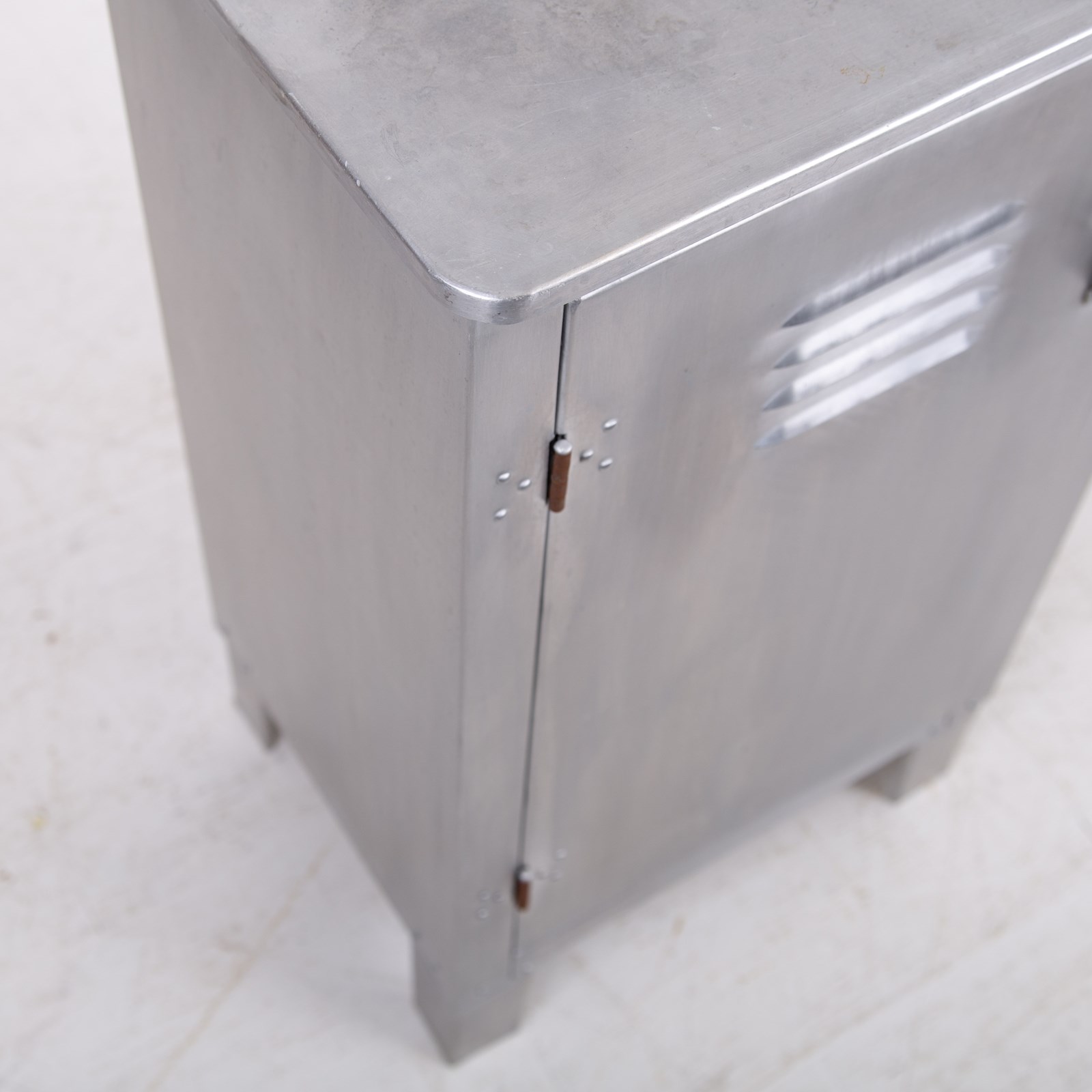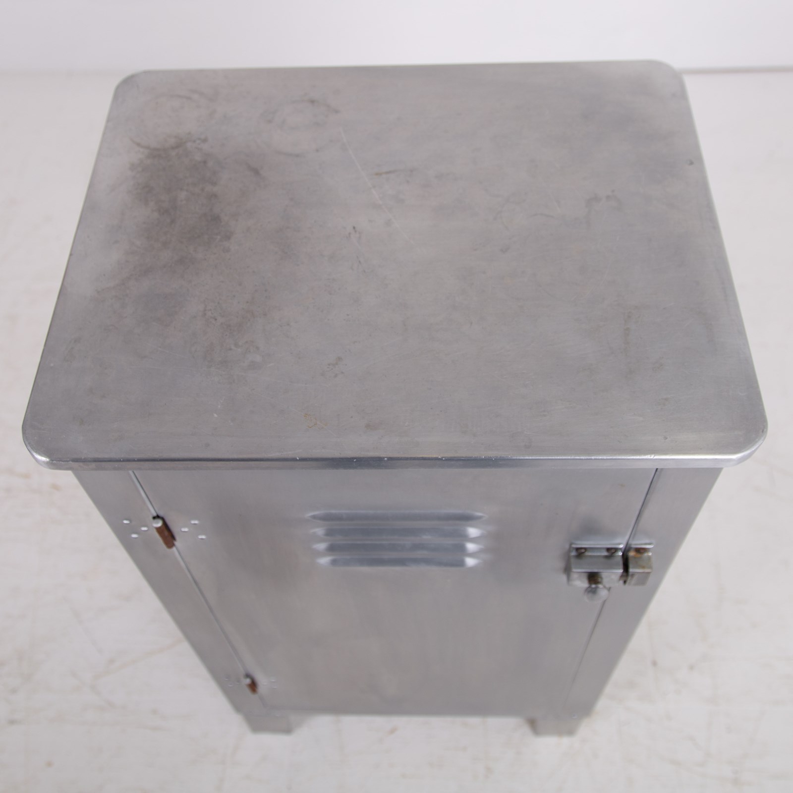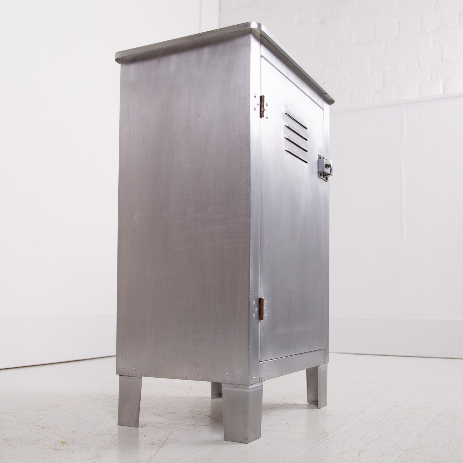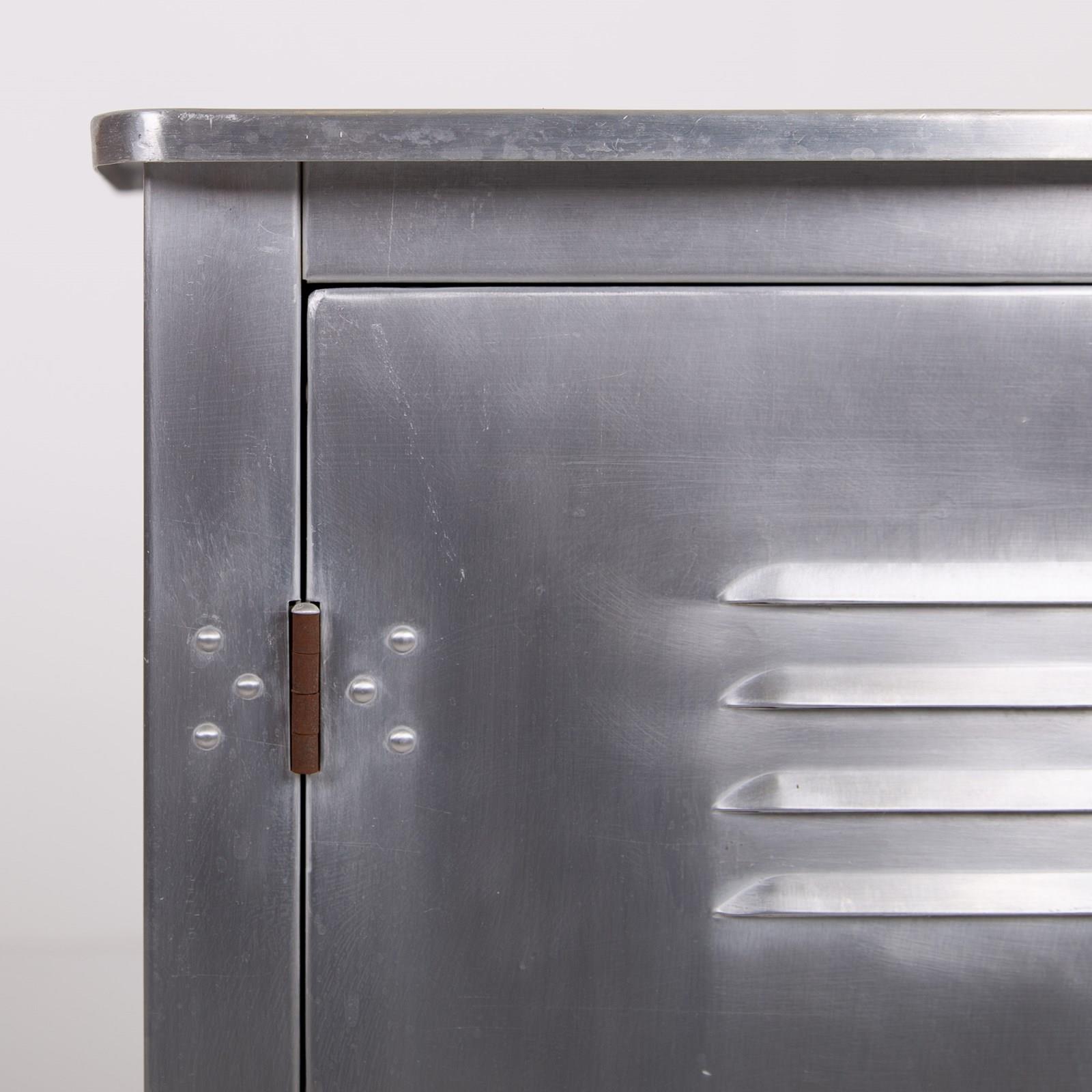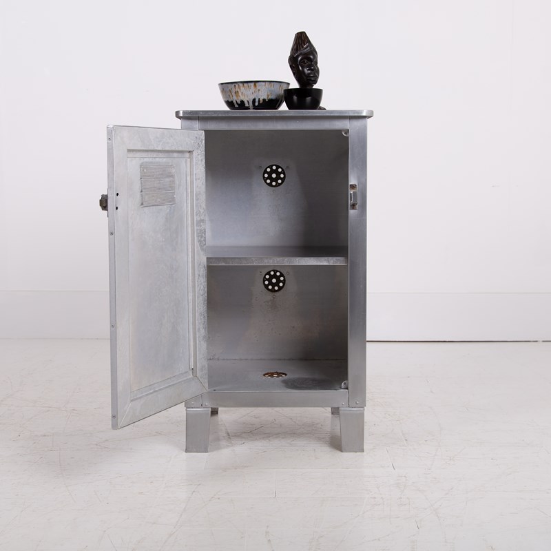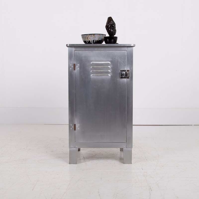 A great looking vintage folded and pressed aluminium cabinet C1940 with a single vented door and original latch sitting in fine order and perfect for a bathroom, bedroom or hallway.