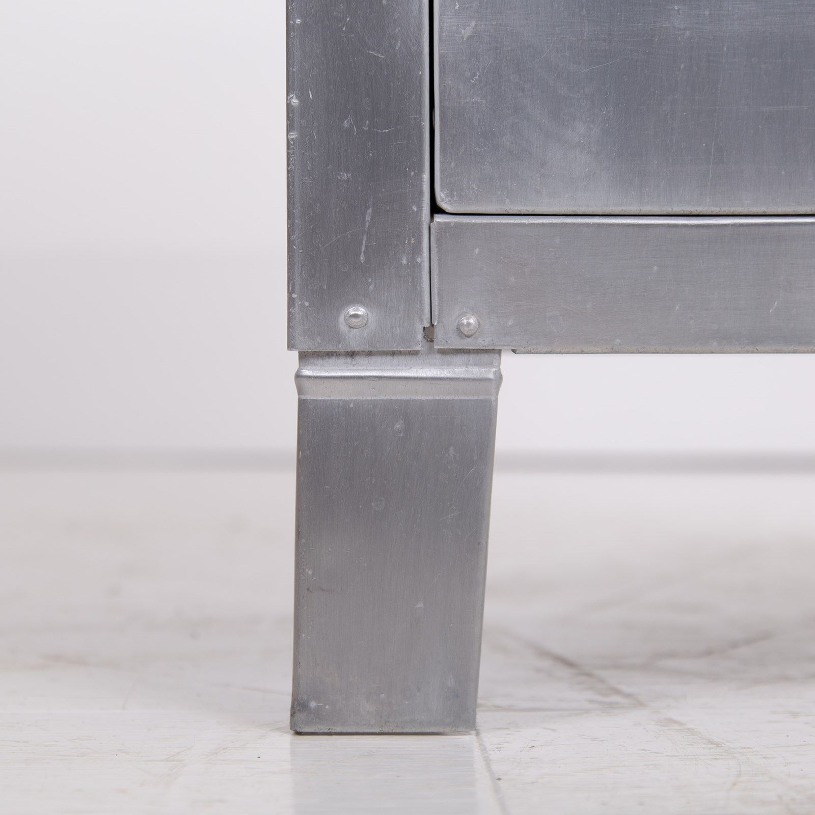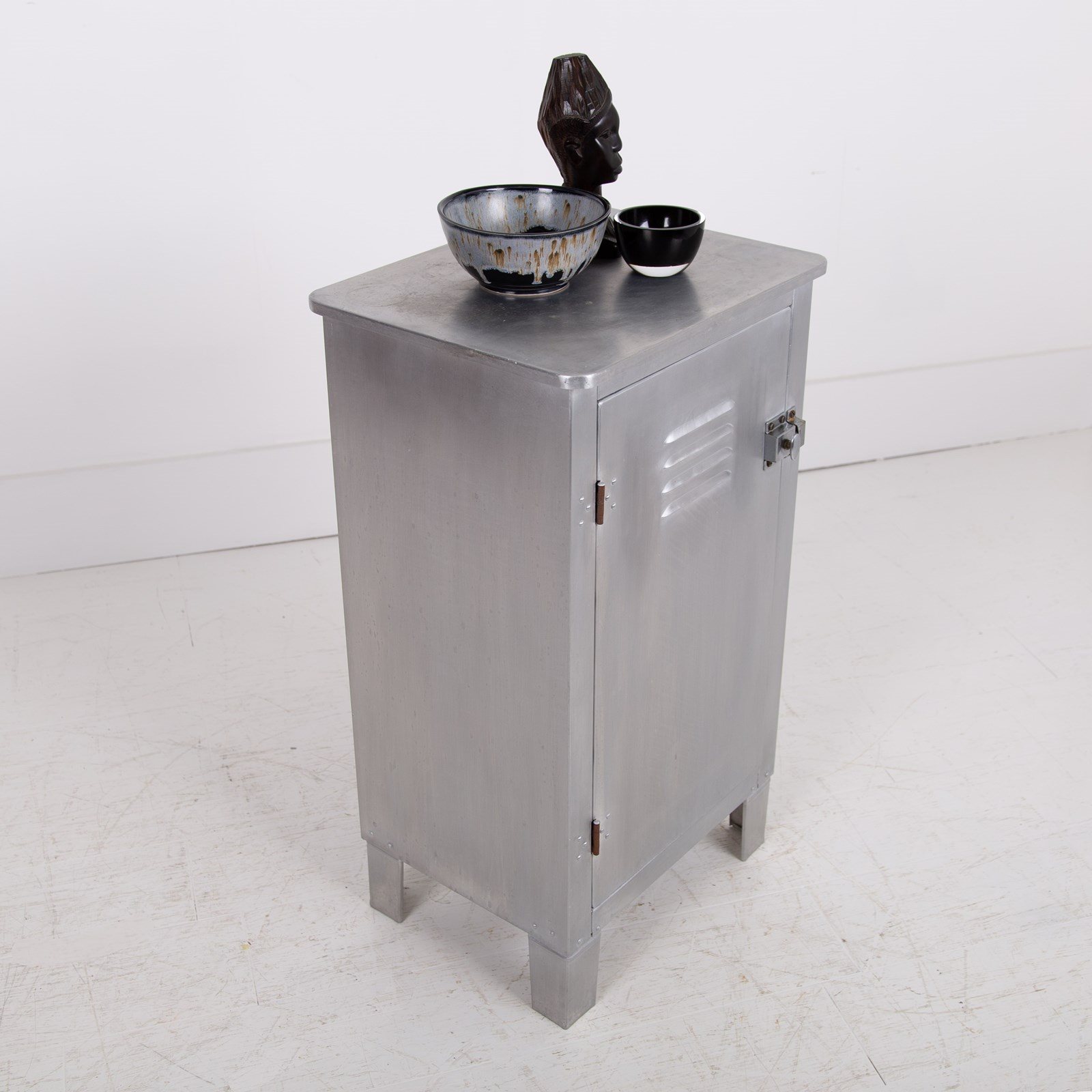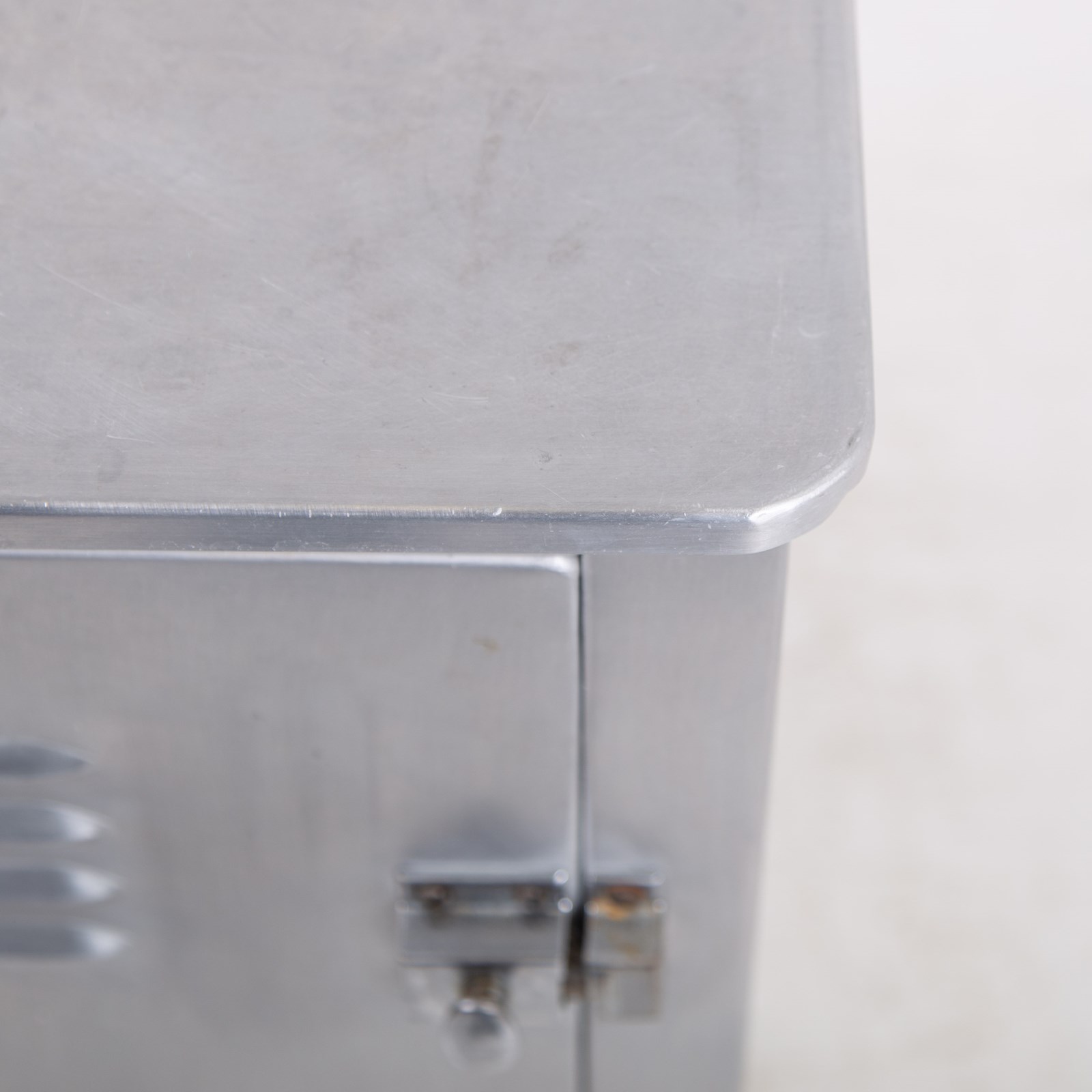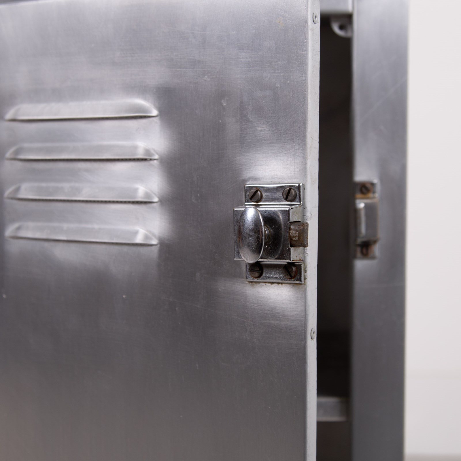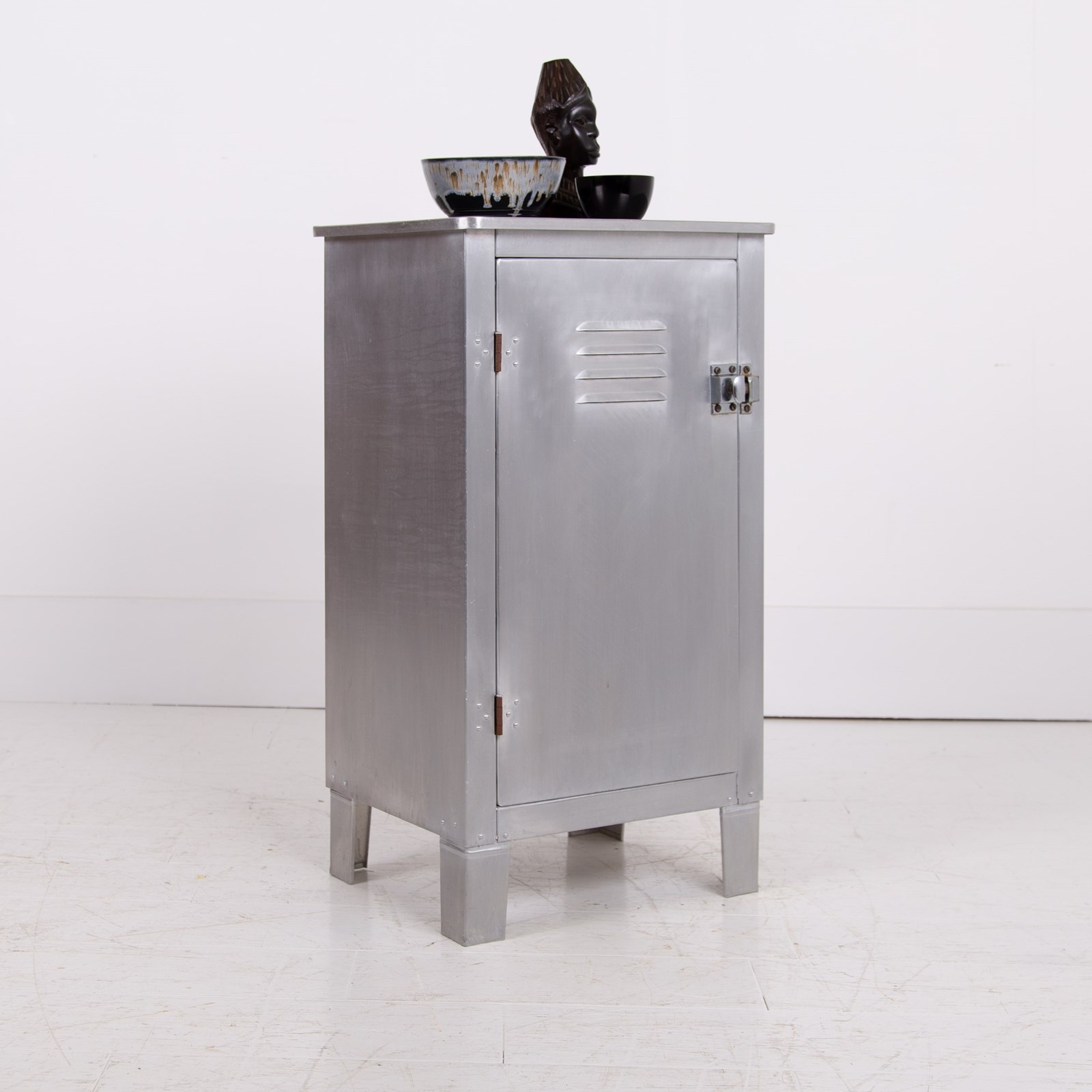 A great looking vintage folded and pressed aluminium cabinet C1940 with a single vented door and original latch sitting in fine order and perfect for a bathroom, bedroom or hallway.