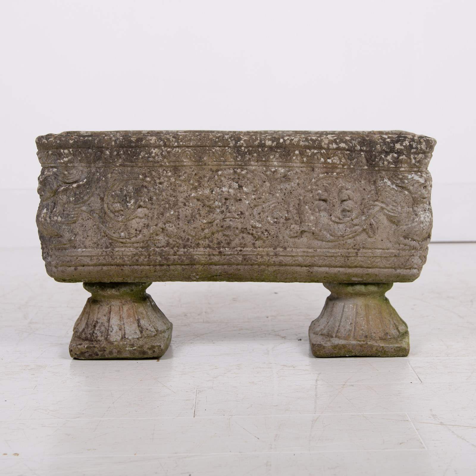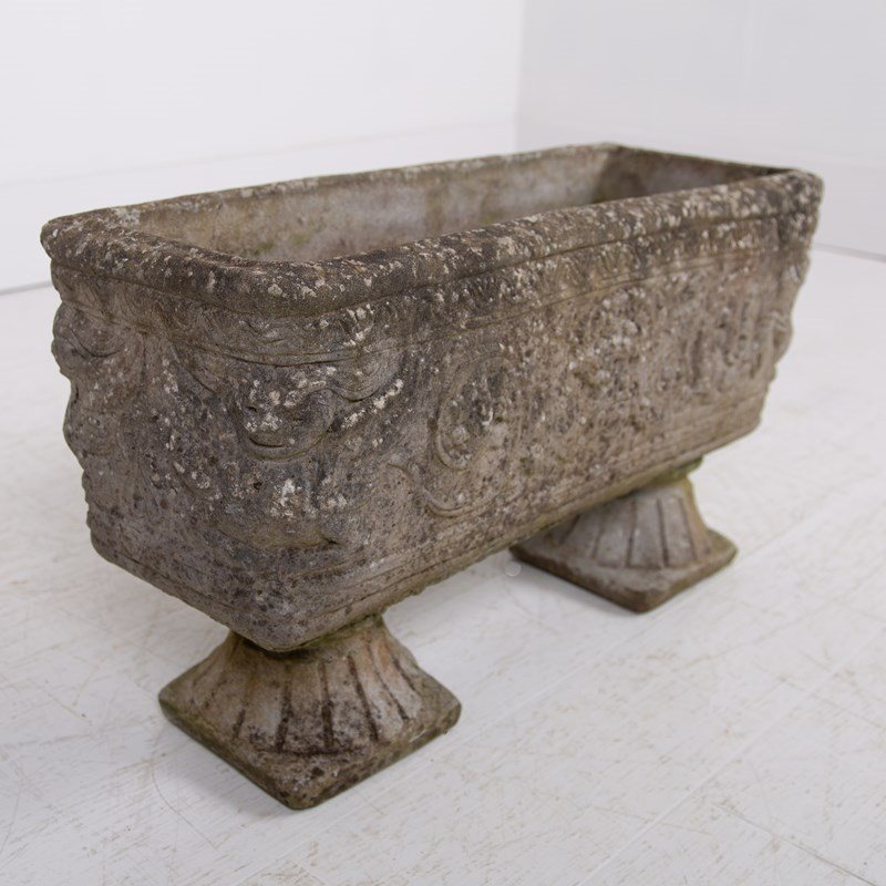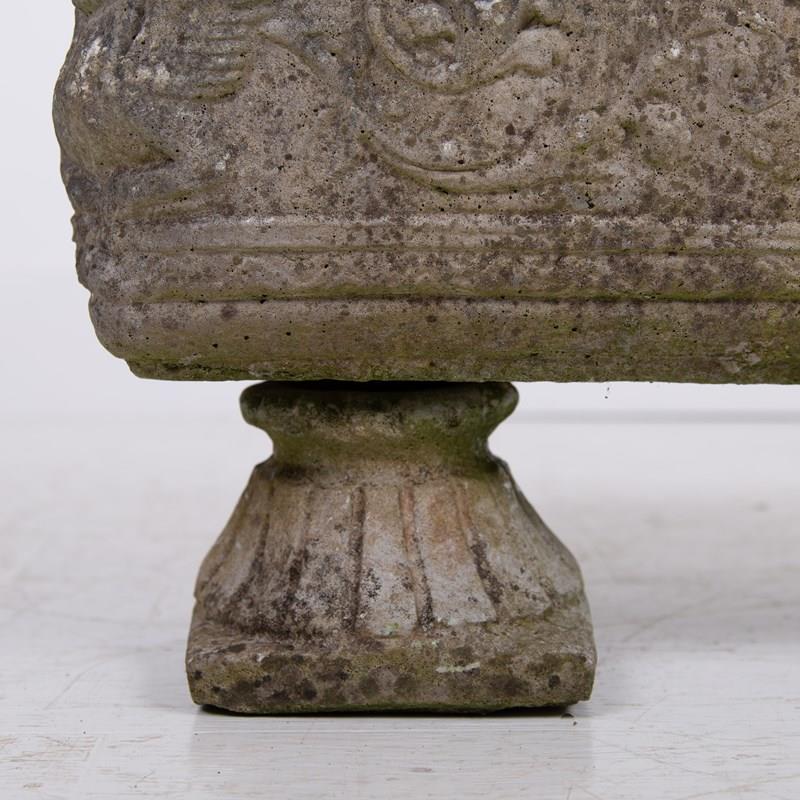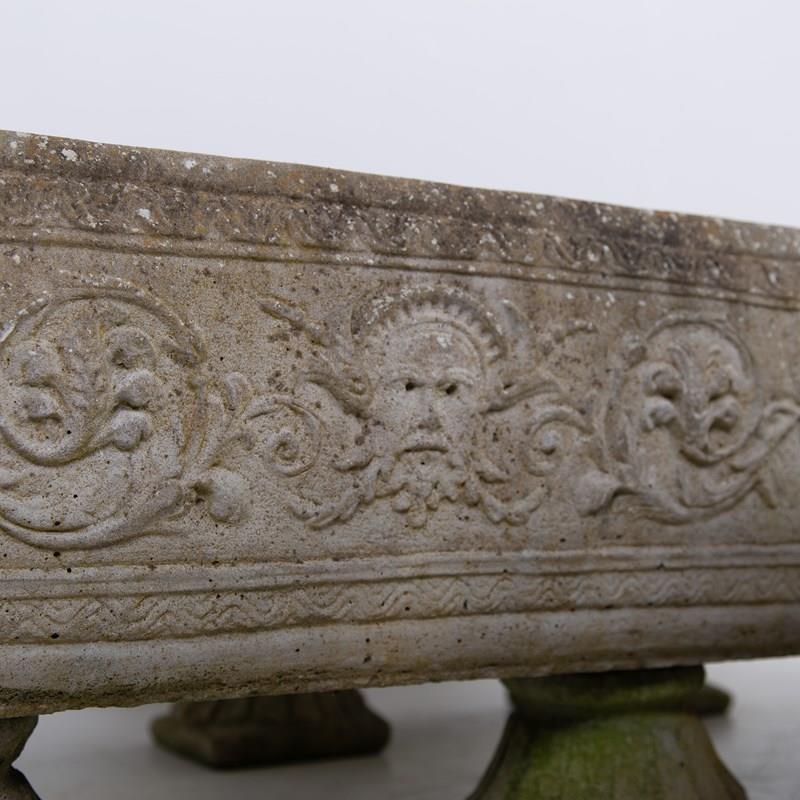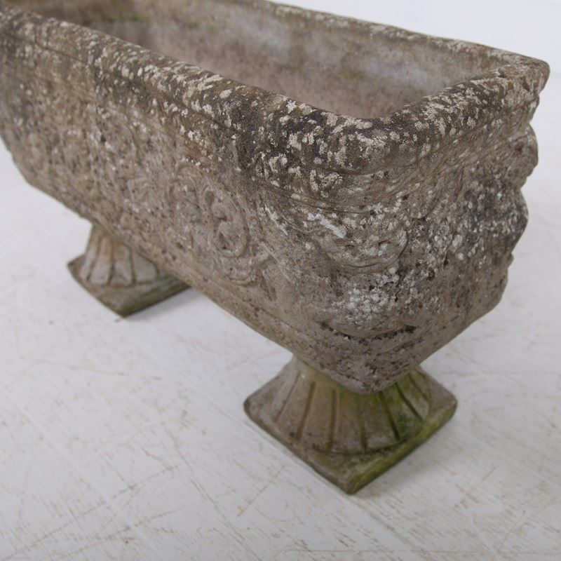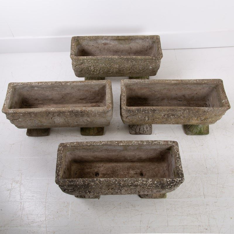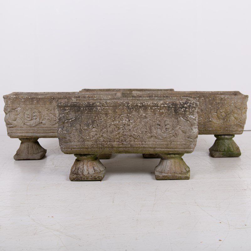 These are nice, a great set of 4 matching well sized plant troughs sitting on “fan shaped” feet with some lovely weathering and historic tones to the reconstituted stone. They are of good scale with a well defined decorative relief to all sides depicting Greek weather gods and the like…