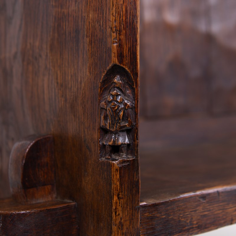 “Tom Whittaker circa 1910-1991 lived and worked in Littlebeck near Whitby after studying in his native York and with craftsmen in Germany and Switzerland. He used only English Oak and his trademark was to carve a little woodland gnome into each and every piece of furniture he made. Legend has it that a gnome is born every time an acorn sprouts and then that gnome will guard that tree throughout its life. Tom Whittaker the Gnome Man of Littlebecks work is highly recognised and regarded.”