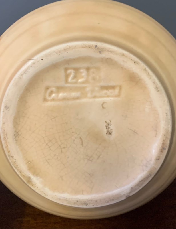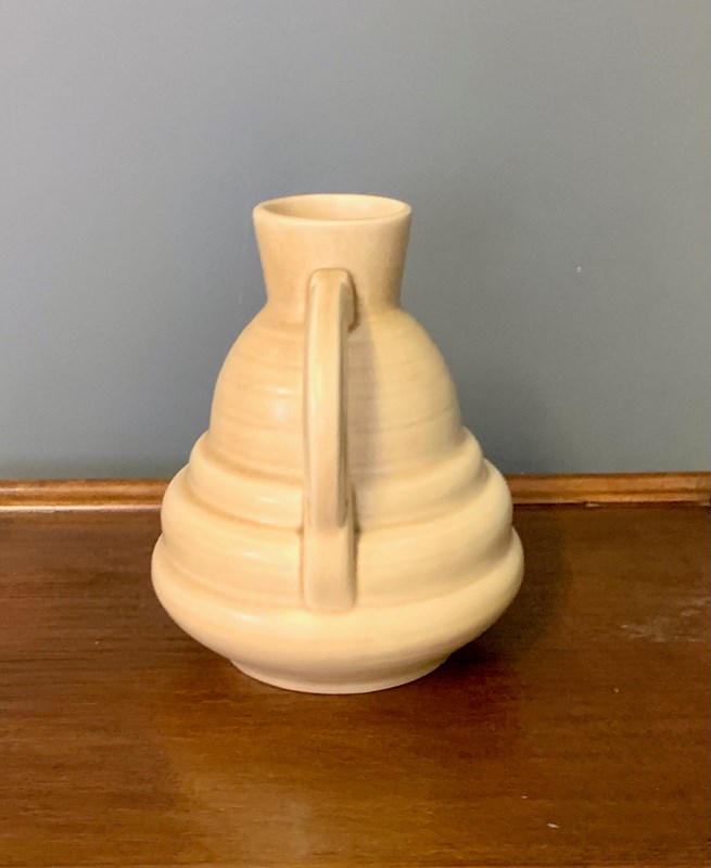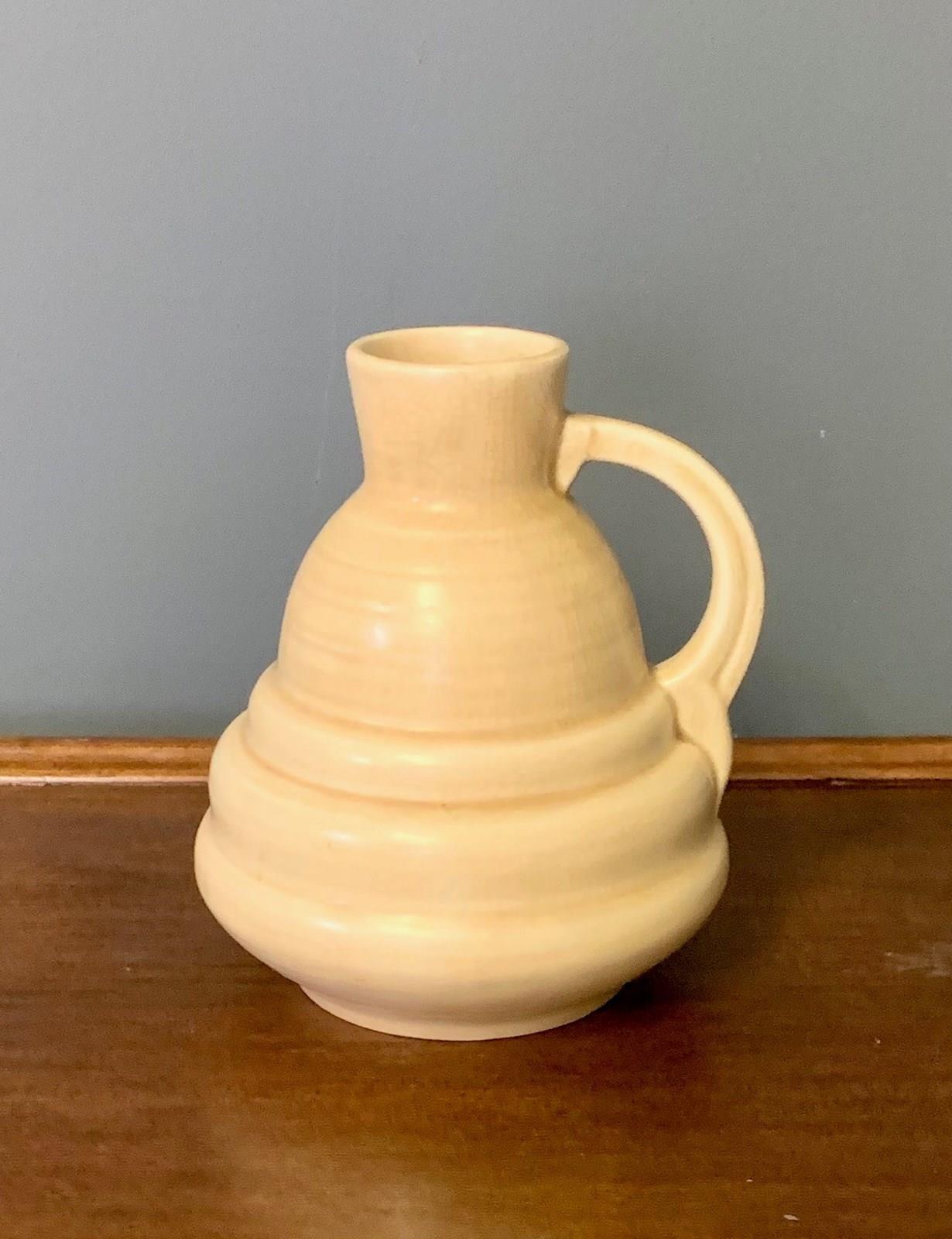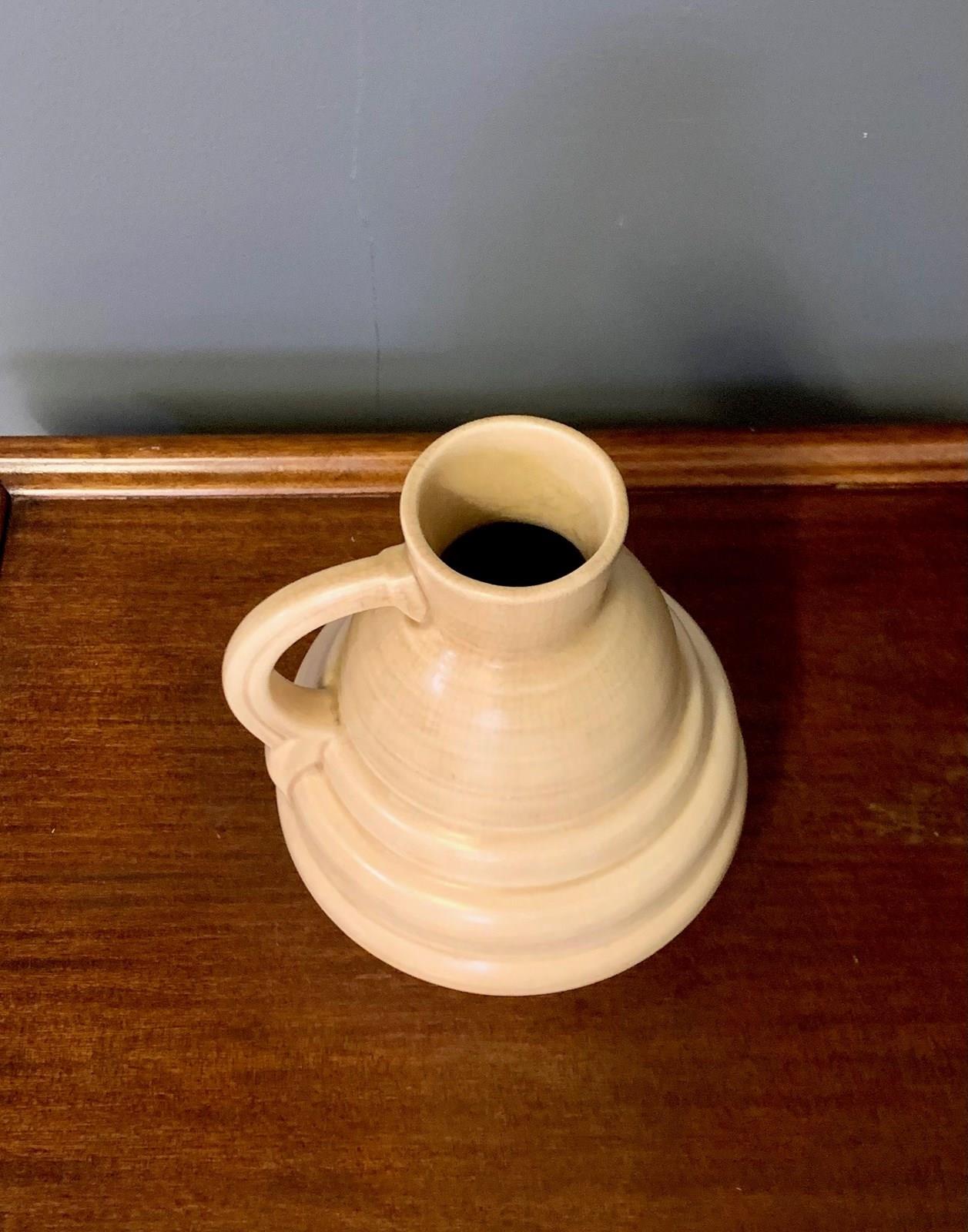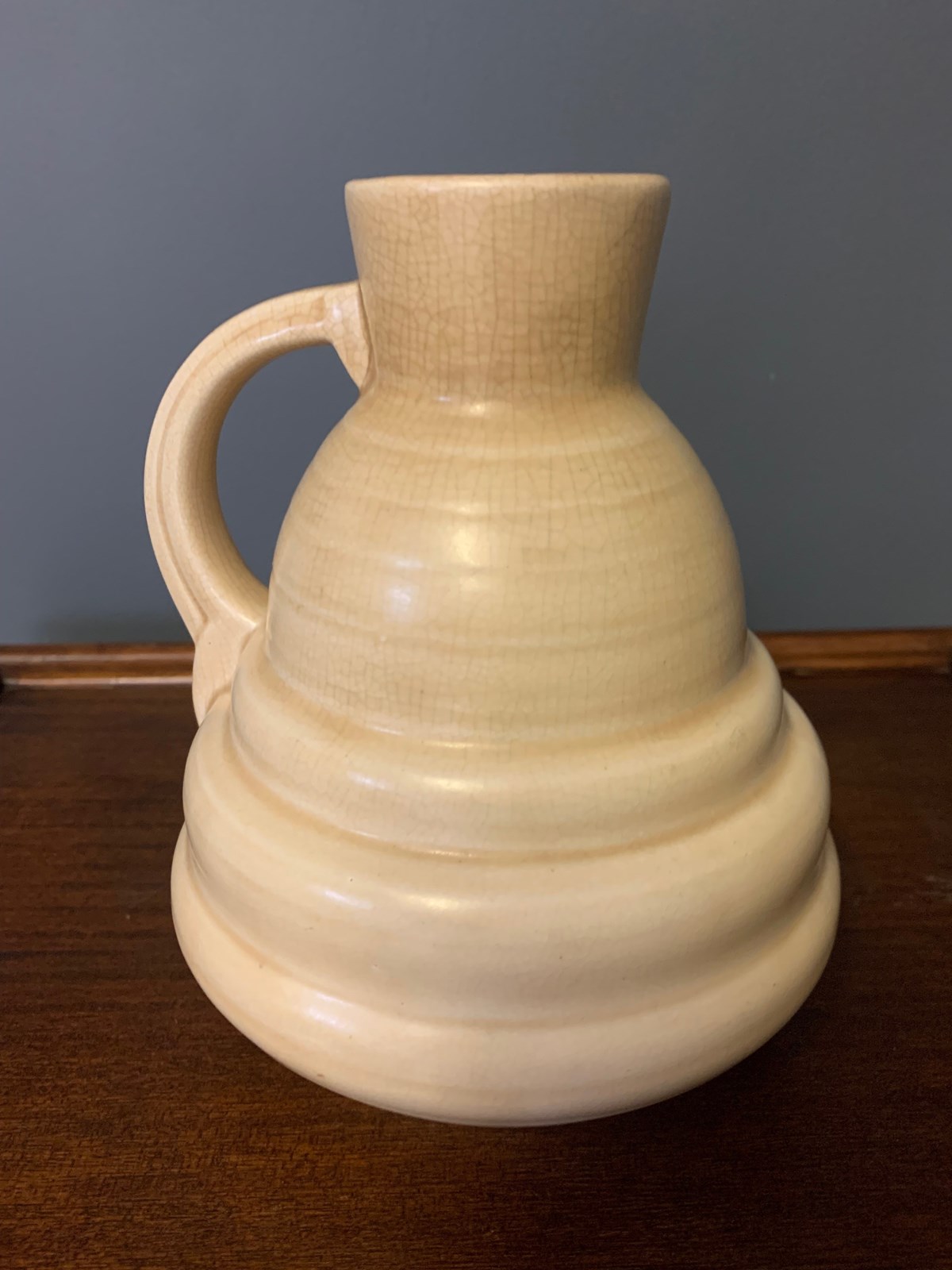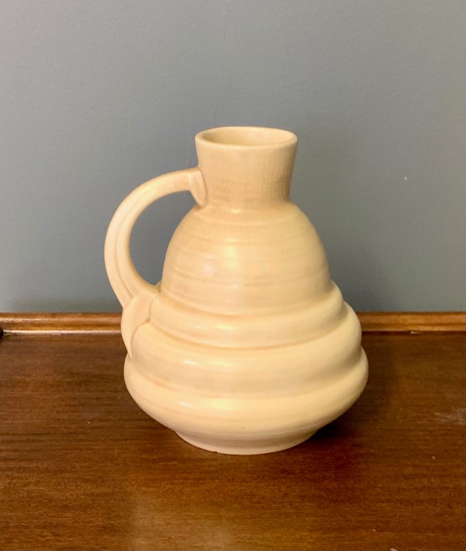 Art Deco Vase with handle, cream/beige colour with an aged scumble glazed finish, great aged condition, no cracks or chips. Makers stamp shown in photo.
