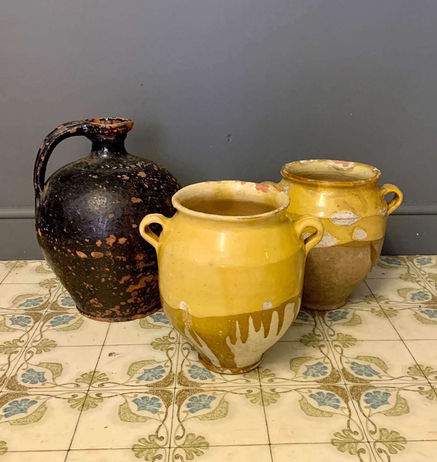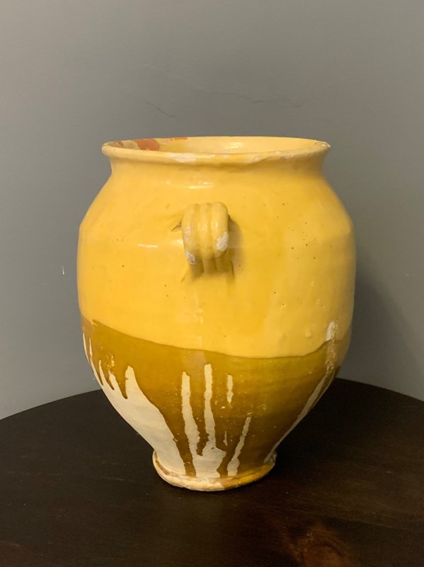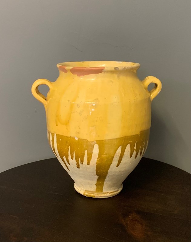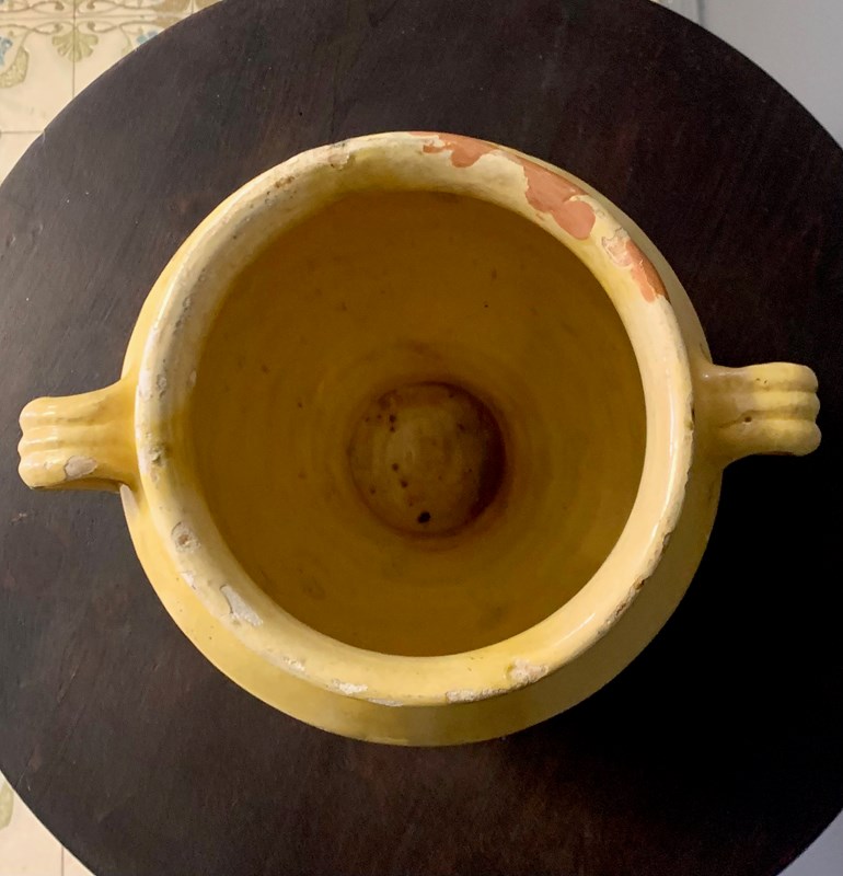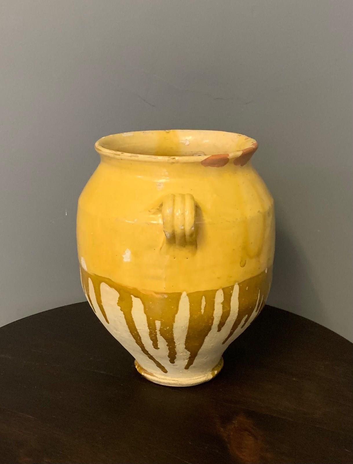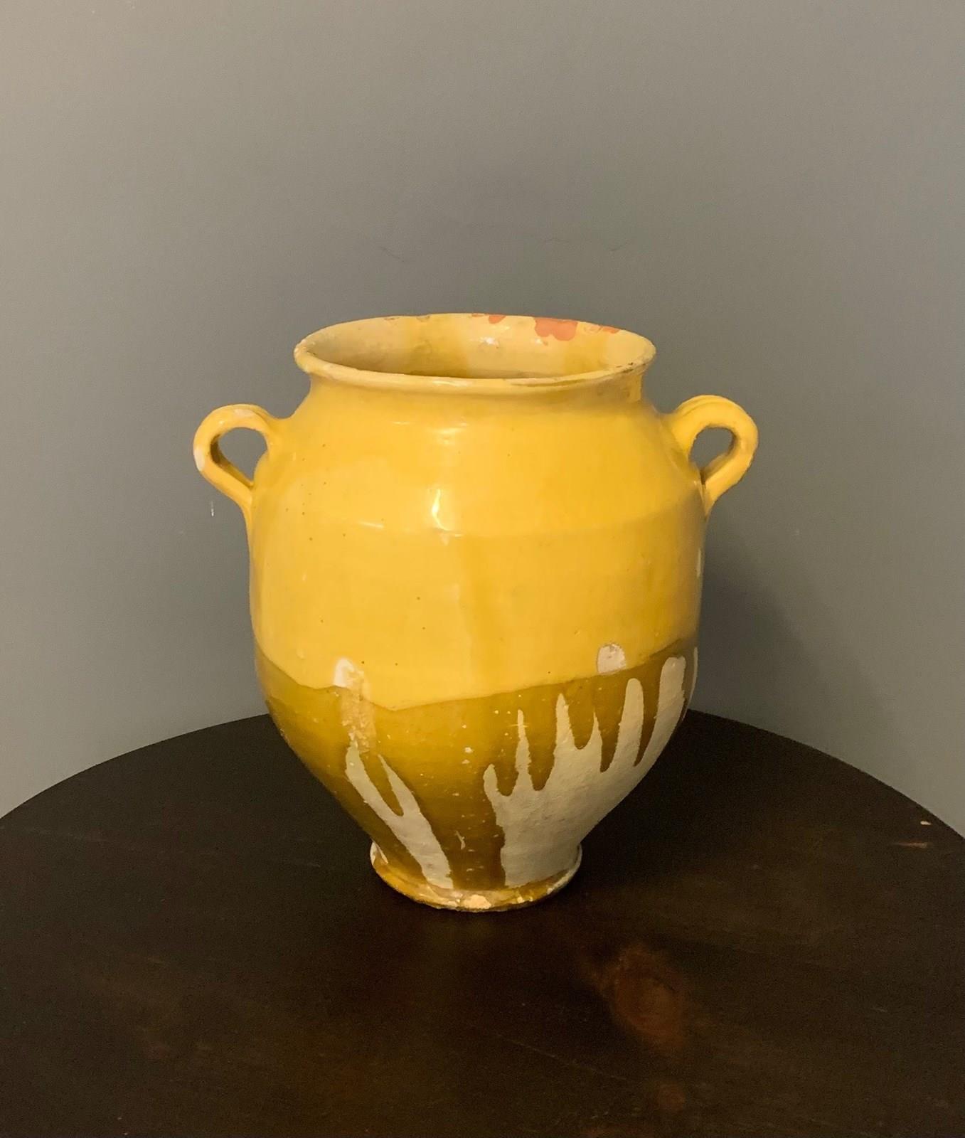 Antique French terracotta confit pot. Each of these earthenware pots are unique and distinctive with a classic yellow glaze. Used from the 19th to the mid-20th century to conserve food. Handmade and charming decorative pieces. Fabulously aged and in good antique condition with no chips or cracks to the pot, aged glaze as expected.