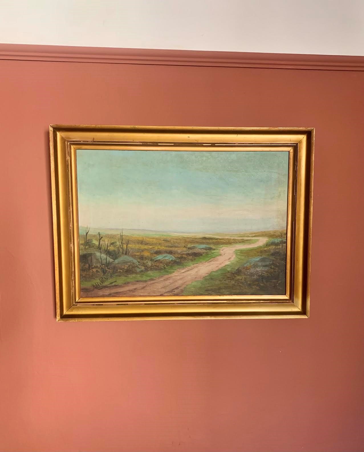 Beautiful large landscape oil on canvas in a gilt frame, signed by Hilda Walker. A lovely forest scene with path heading into the distance. Wear and tear to the frame and picture shown in the photos.