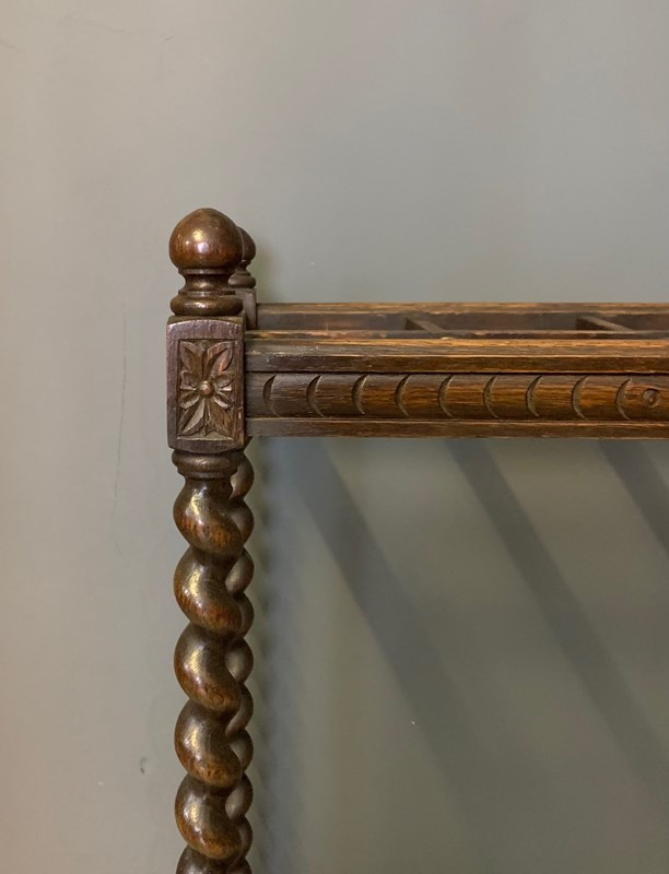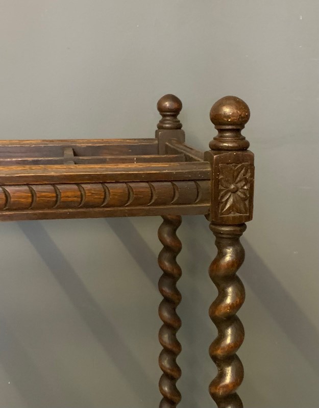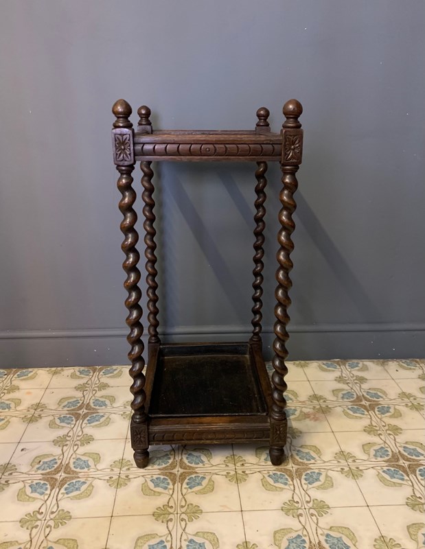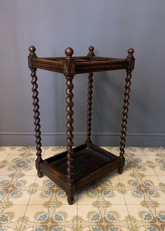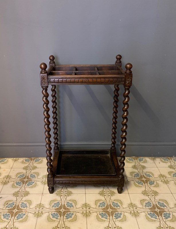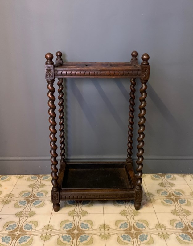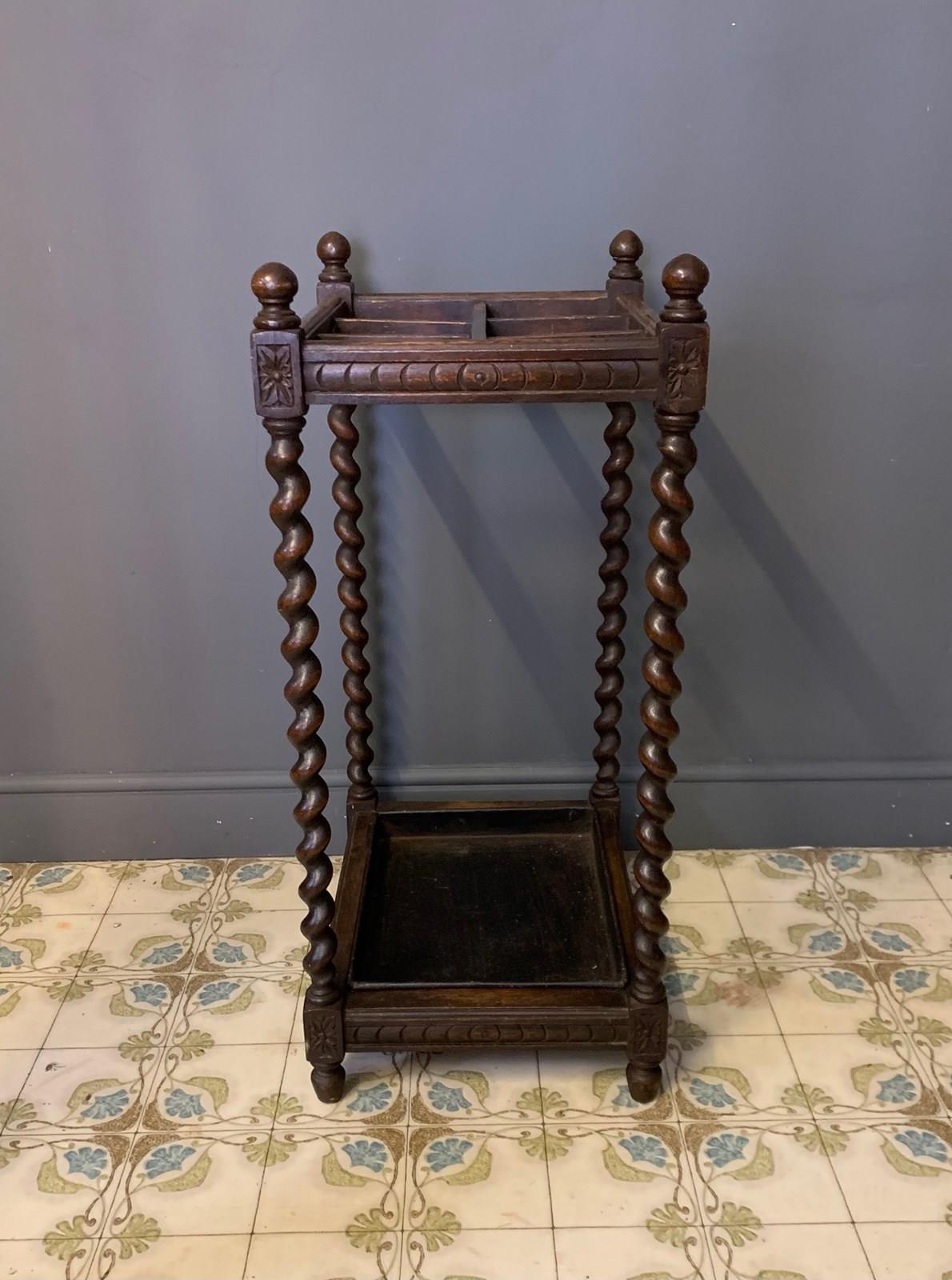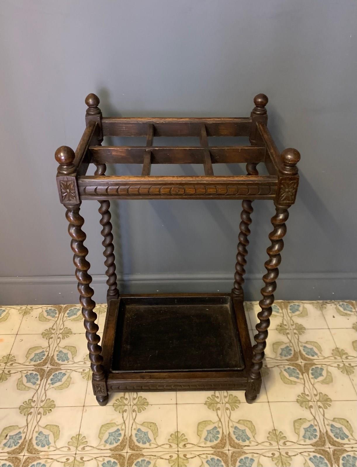 Large Wooden Barley Twist Umbrella/Stick Stand with lovely decorative detail and original drip tray. Wear and tear as expected, see photos.