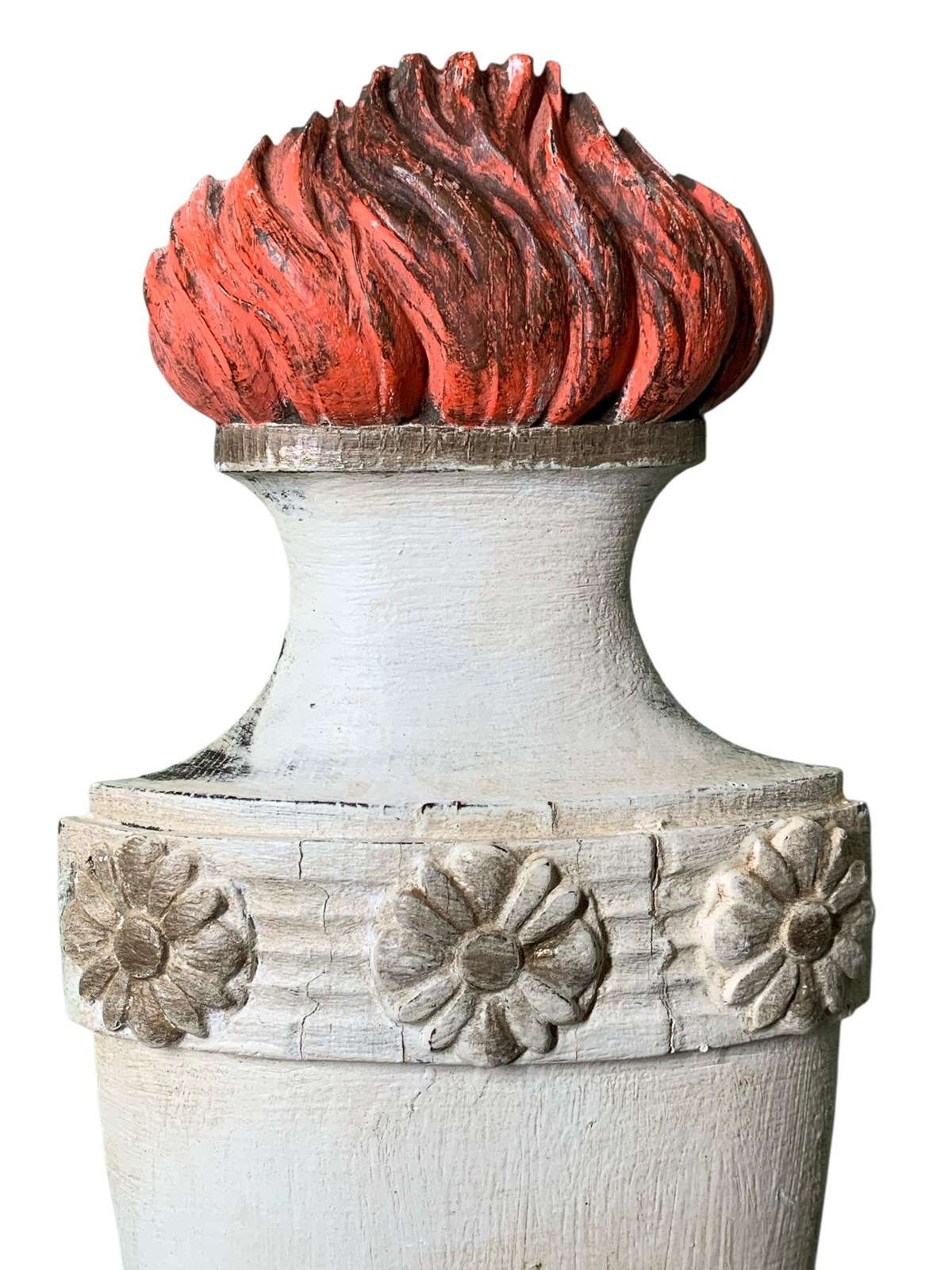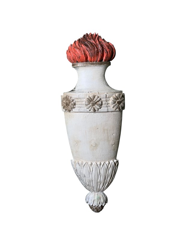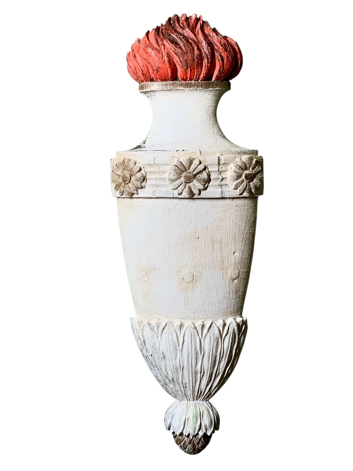A decorative 19th Century carved and painted pine wall element representing a flaming torch.
