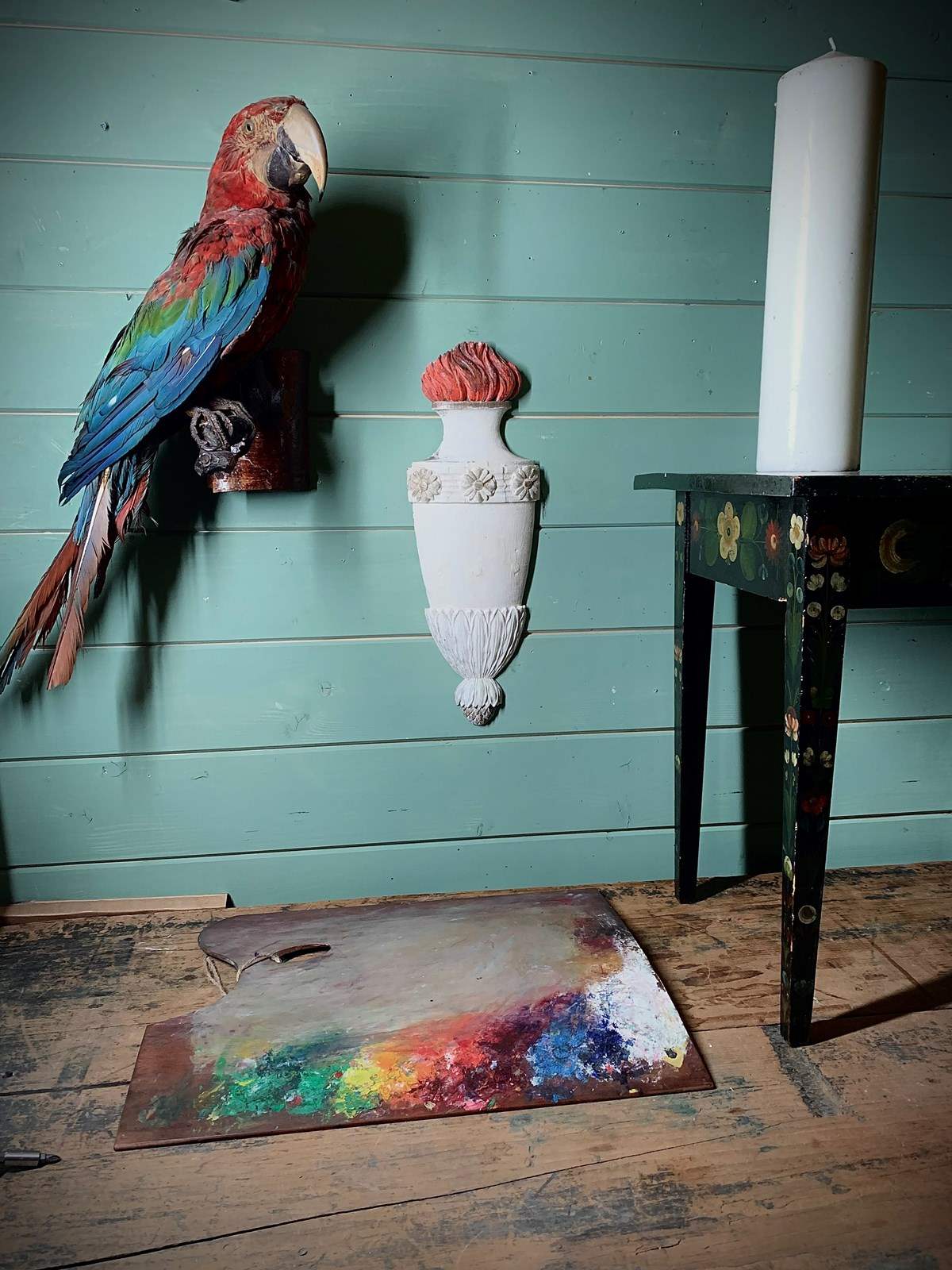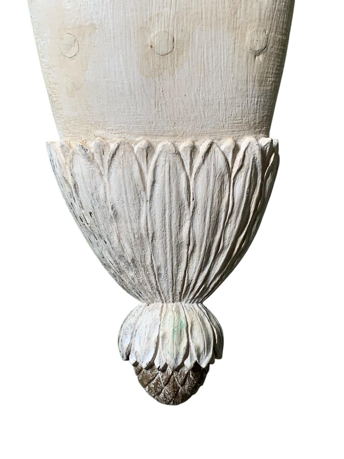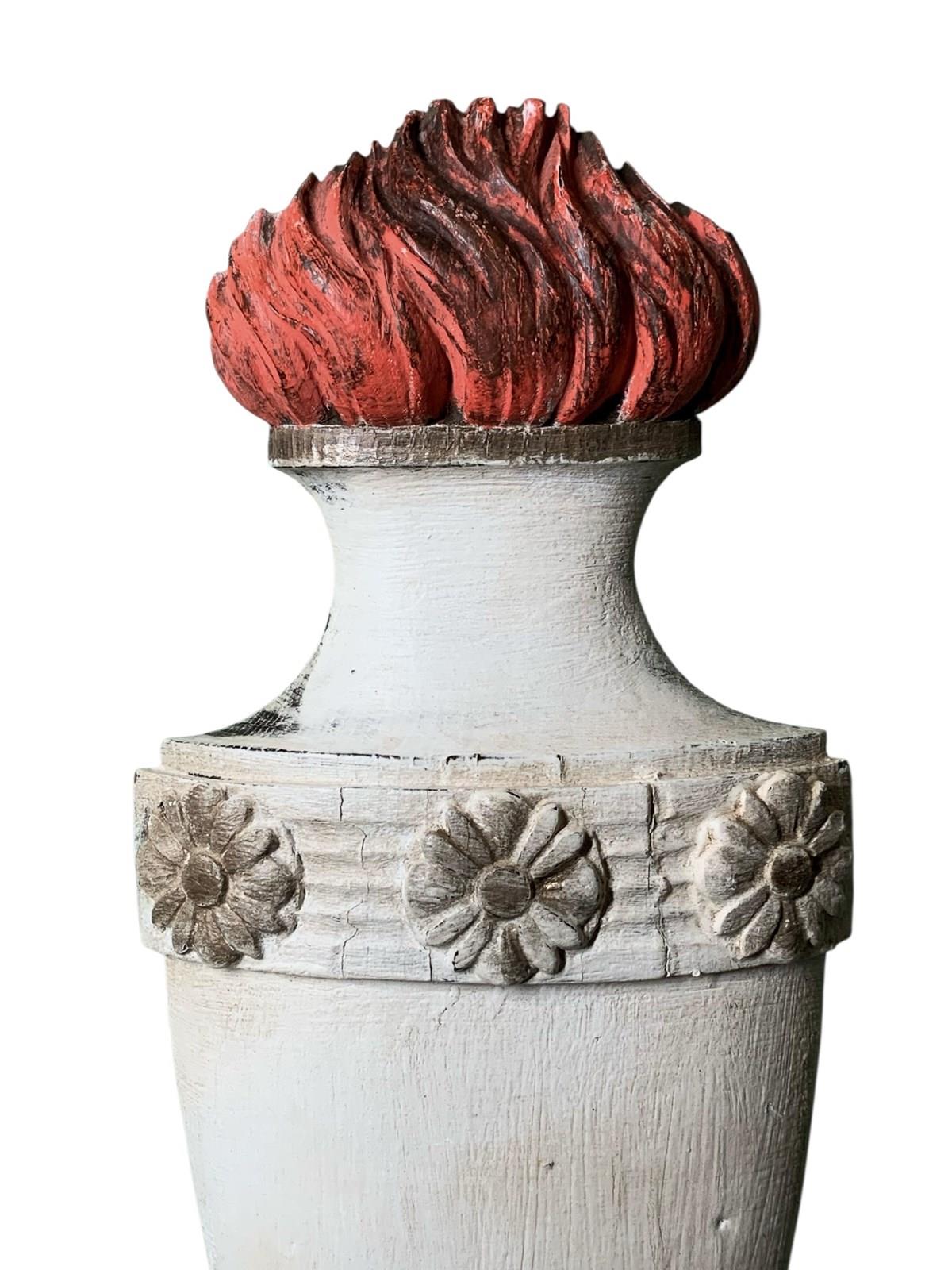 A decorative 19th Century carved and painted pine wall element representing a flaming torch.