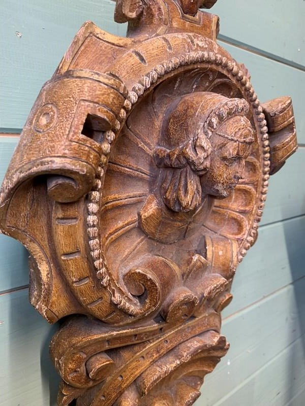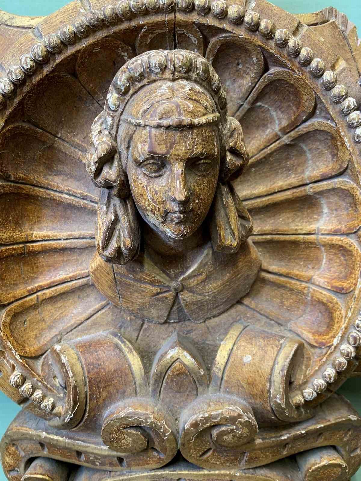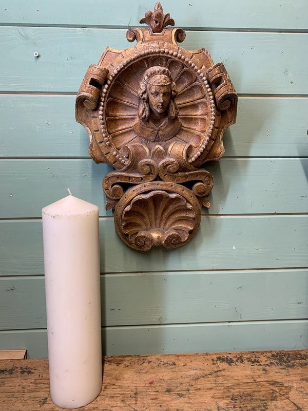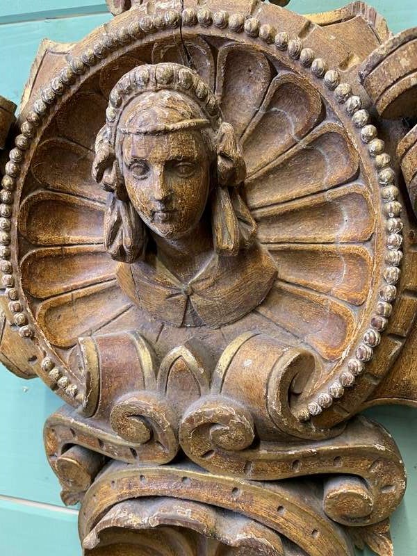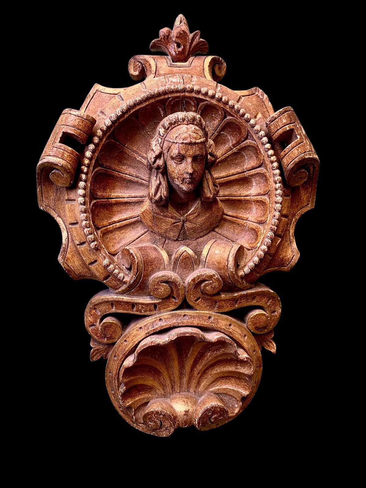 A French church carving suitable for wall display, circa 1850, with central female head (possibly of a saint)