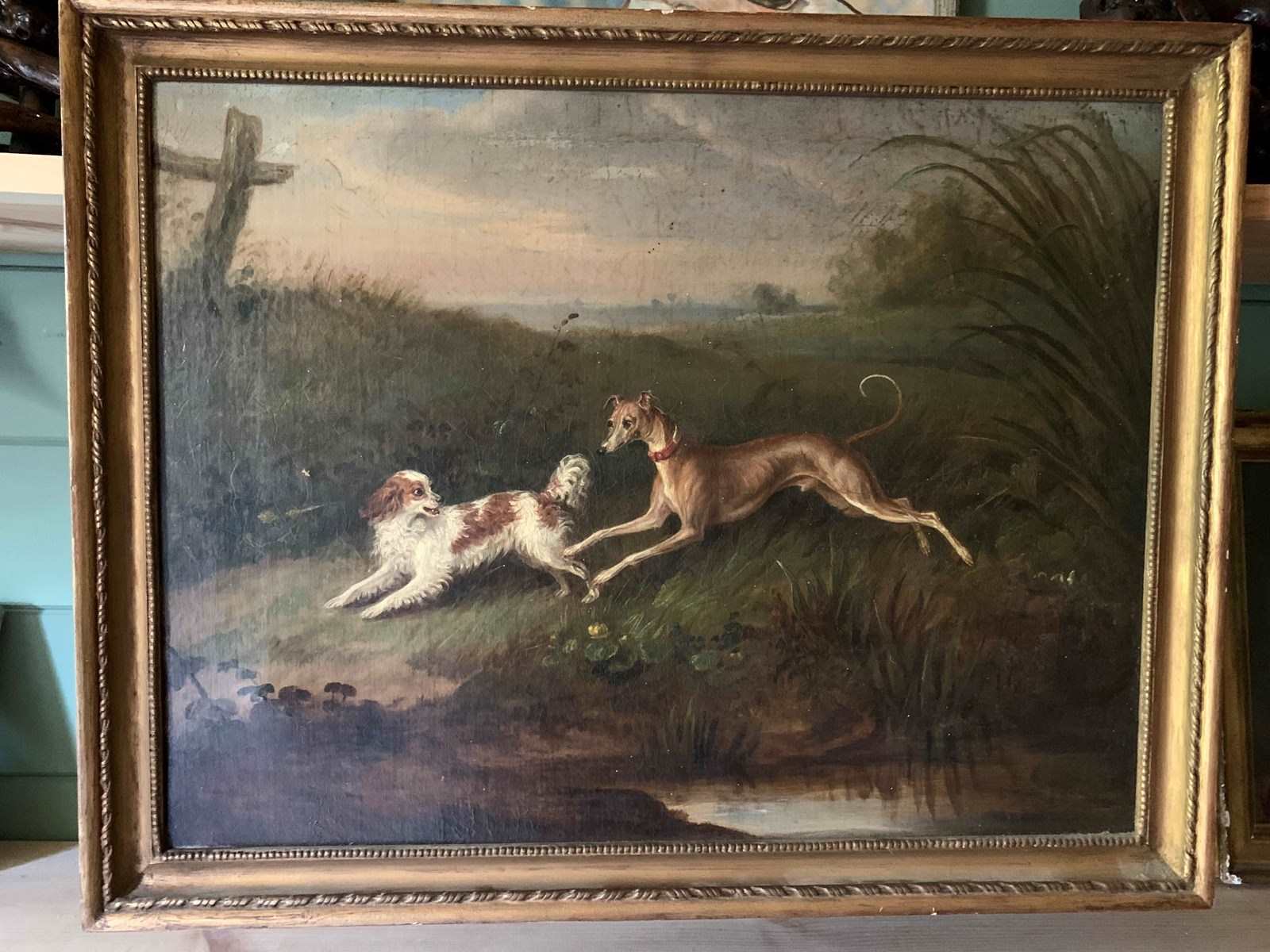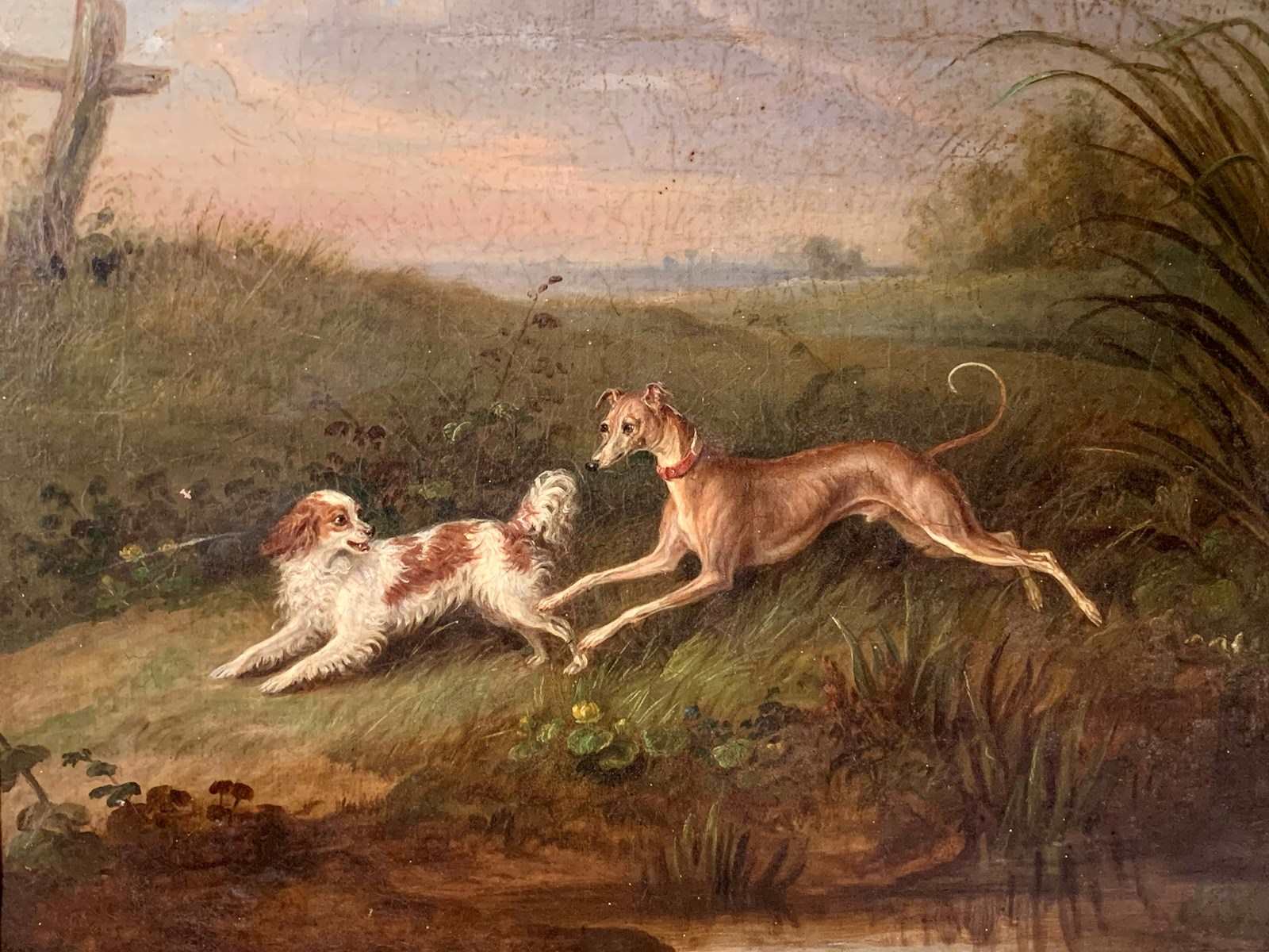 From the first half of the 19th Century, an oil painting on canvas of a greyhound and a spaniel in a landscape.