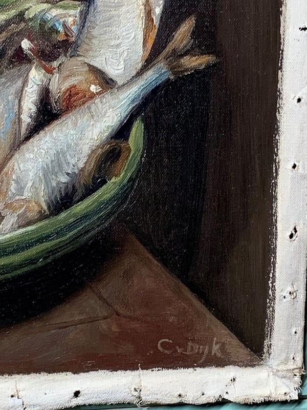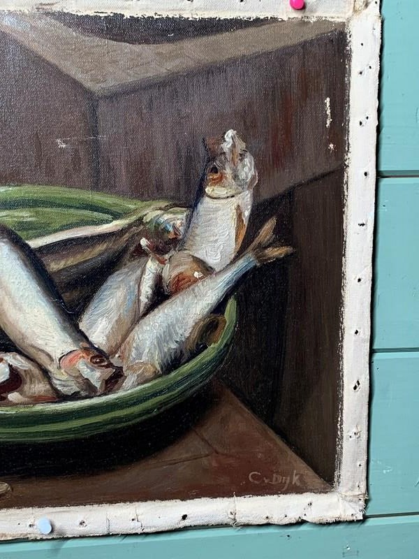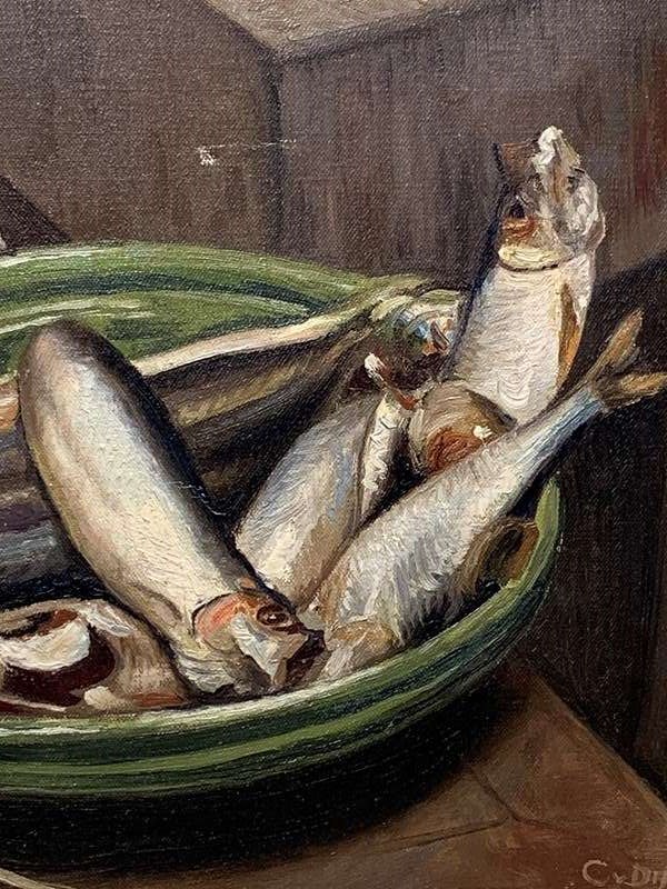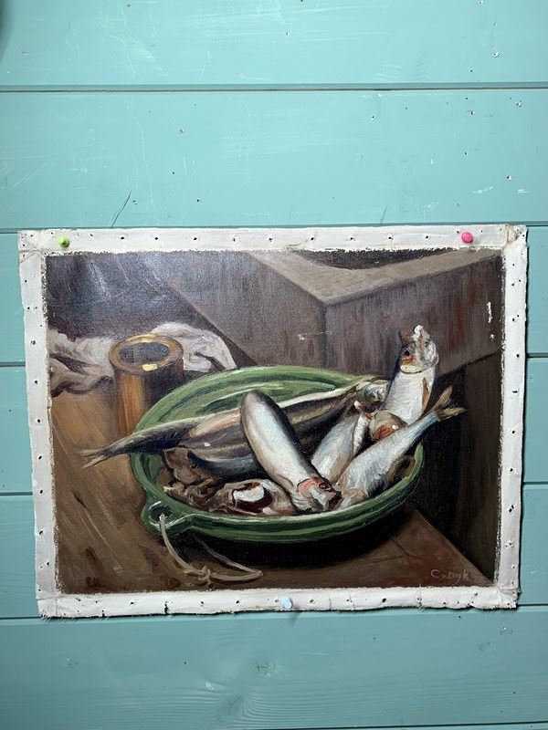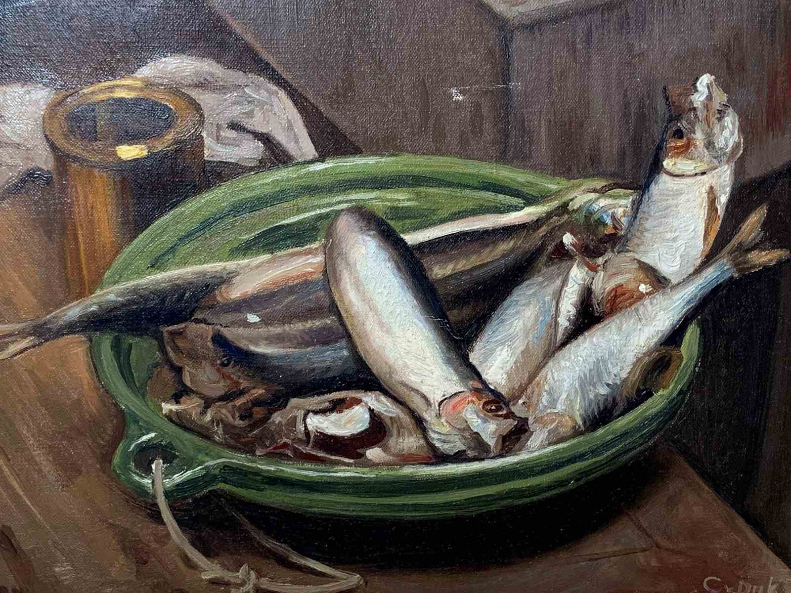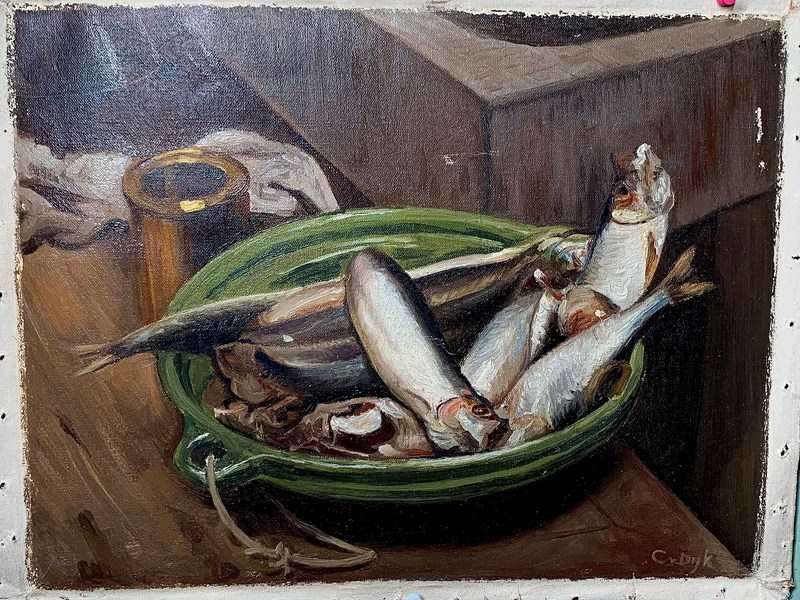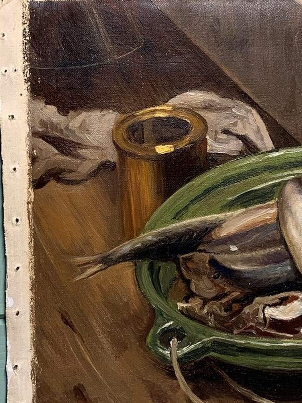 A good French still life of a bowl of fish circa 1920, oil on unstretched canvas.