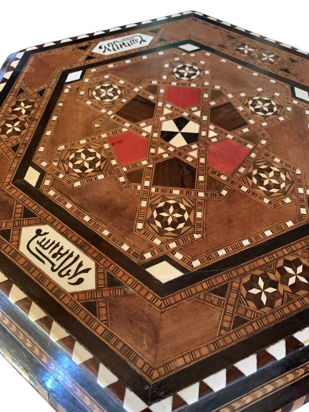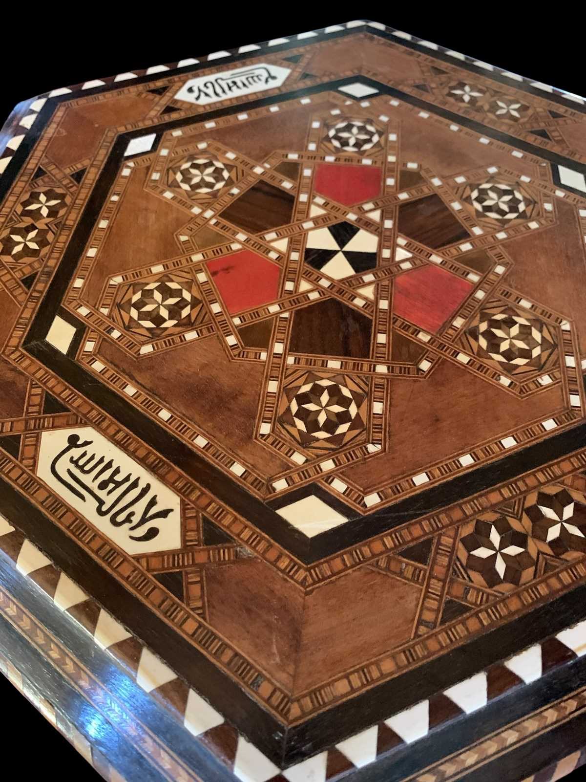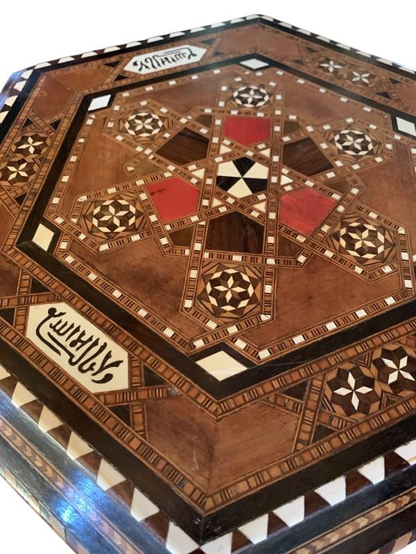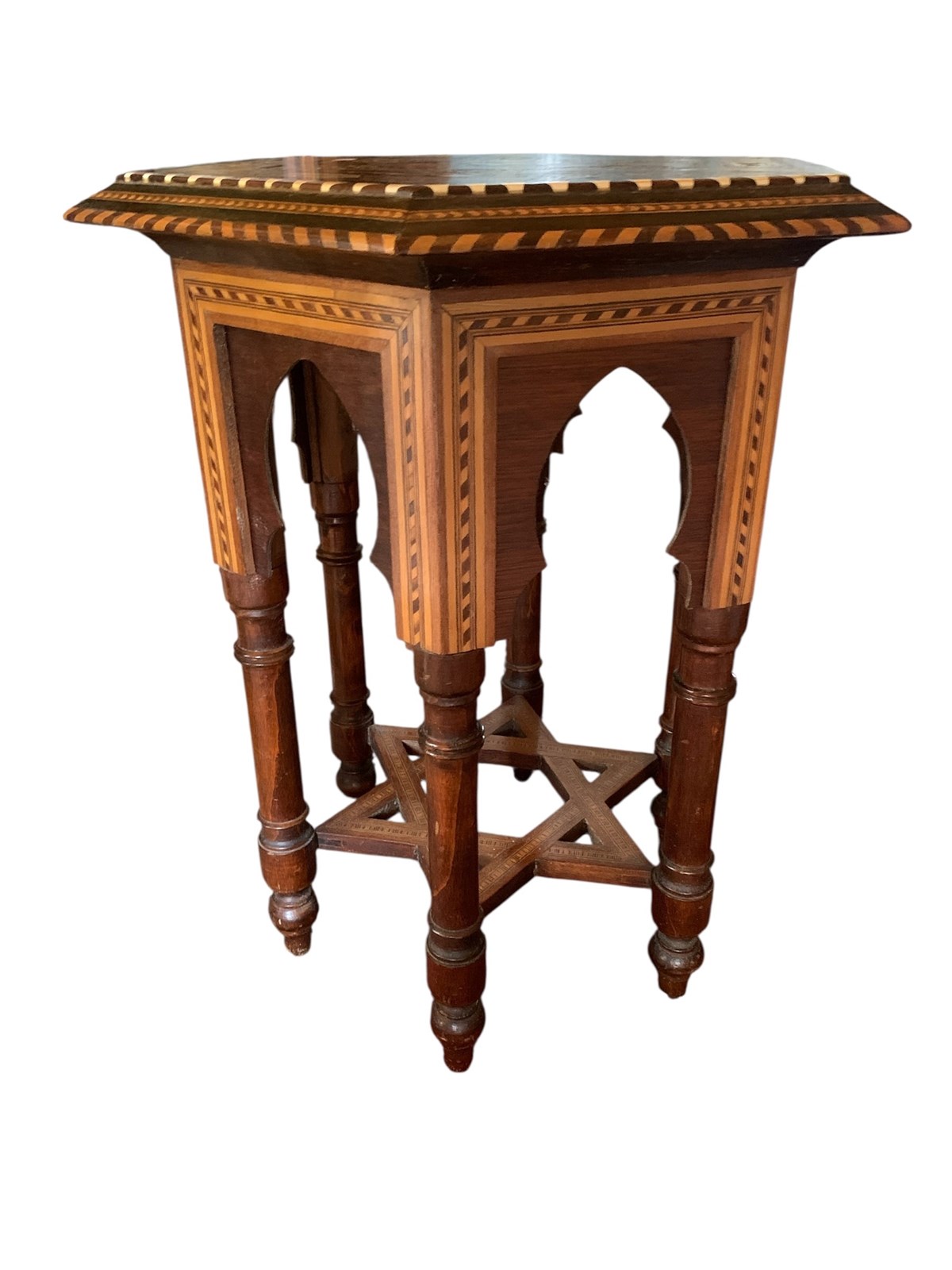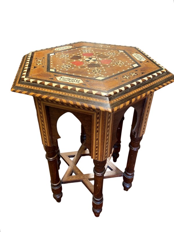 Delightful little hexagonal side table/occasional table, circa 1920, with multiple inlays of bone and stained woods, all in nice antique condition with just minor wear commensurate with age.