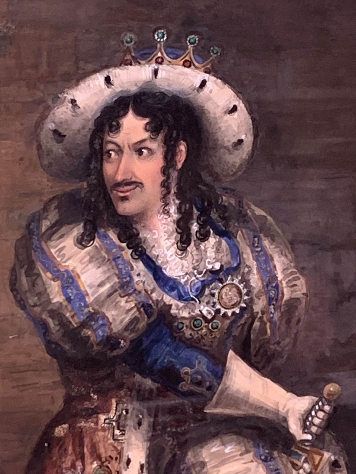 It is likely to be the shakesperian actor Edmund Kean playing King Richard III in around 1817.