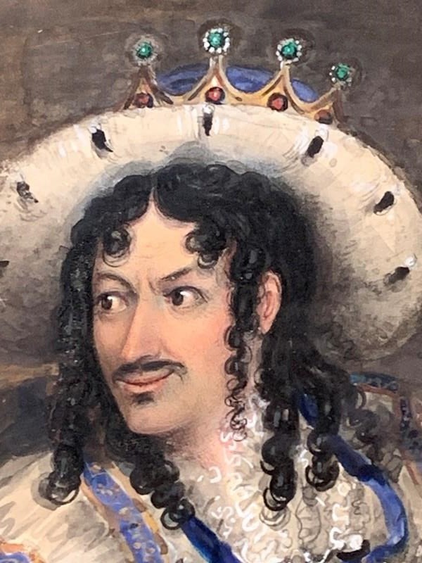 An early 20th Century watercolour of great quality and detail, depicting a 16th Century cavalier sporting a royal crown.
