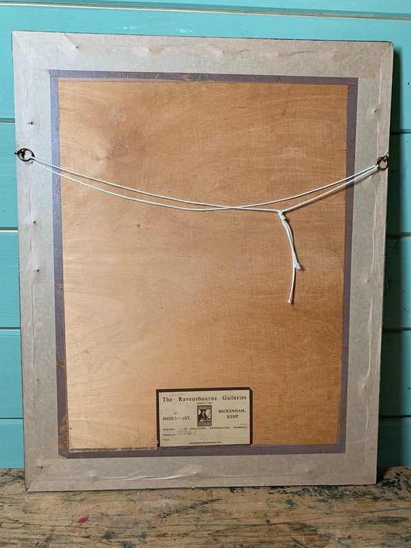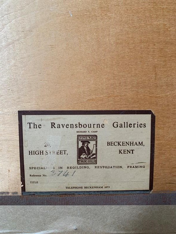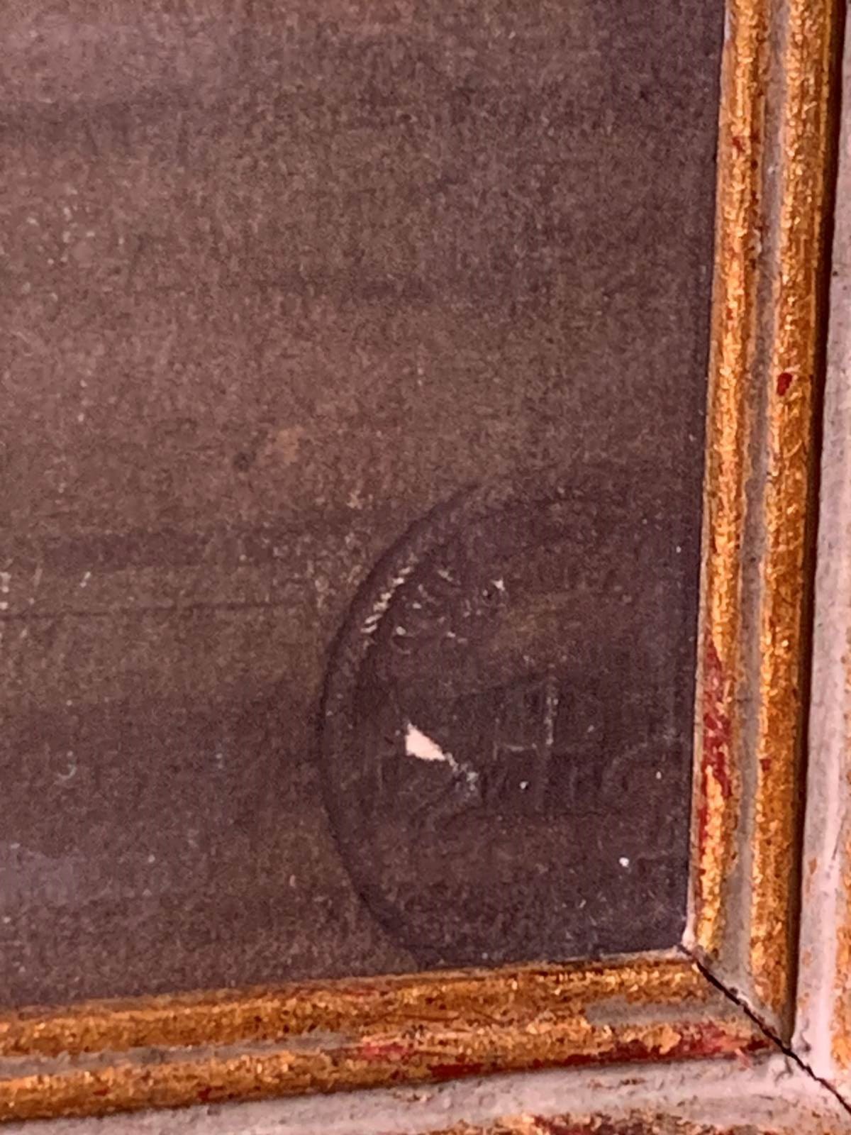 The watercolour bears a circular stamp on the bottom right hand corner which is difficult to decipher without taking it out of its frame.