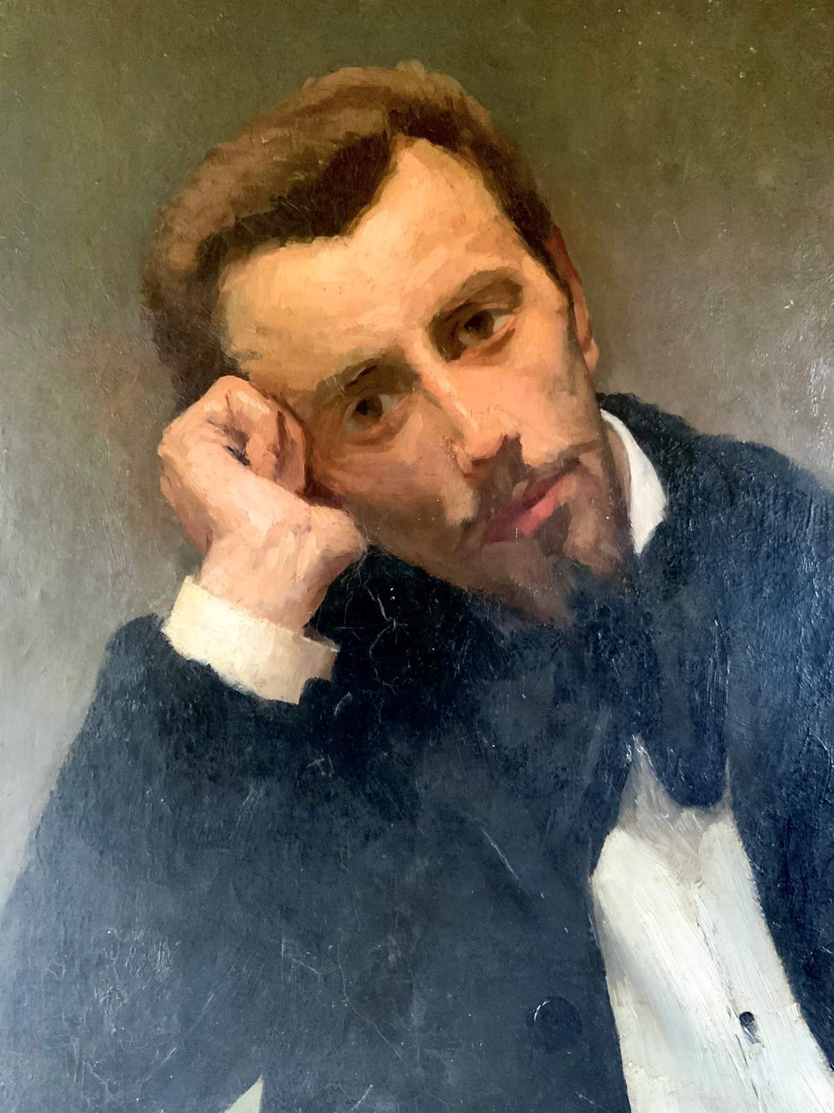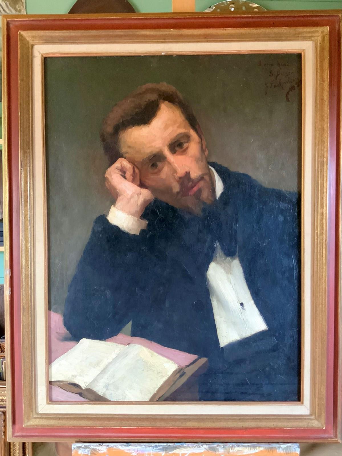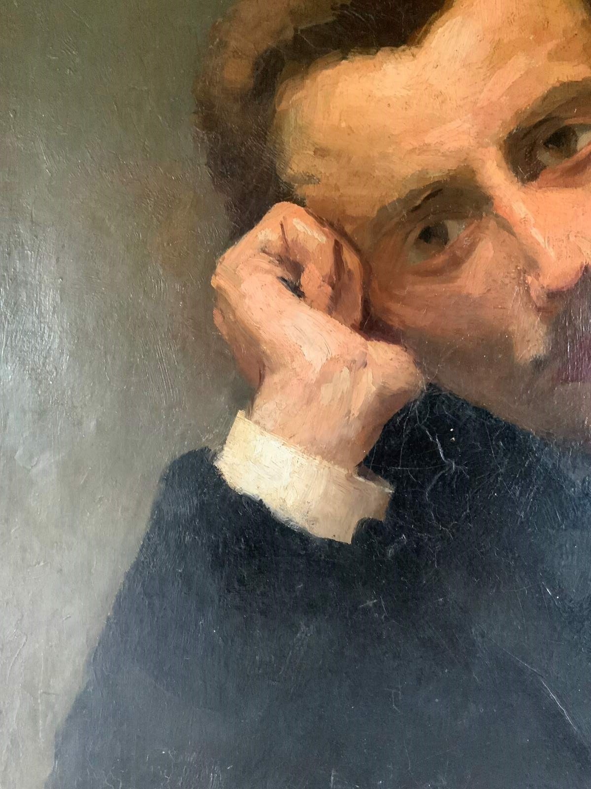 Stunning late 19th Century French school oil on canvas portrait of a gentleman in deep thoughts with an open book at his side.