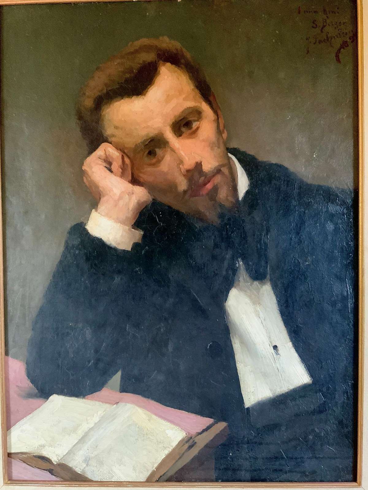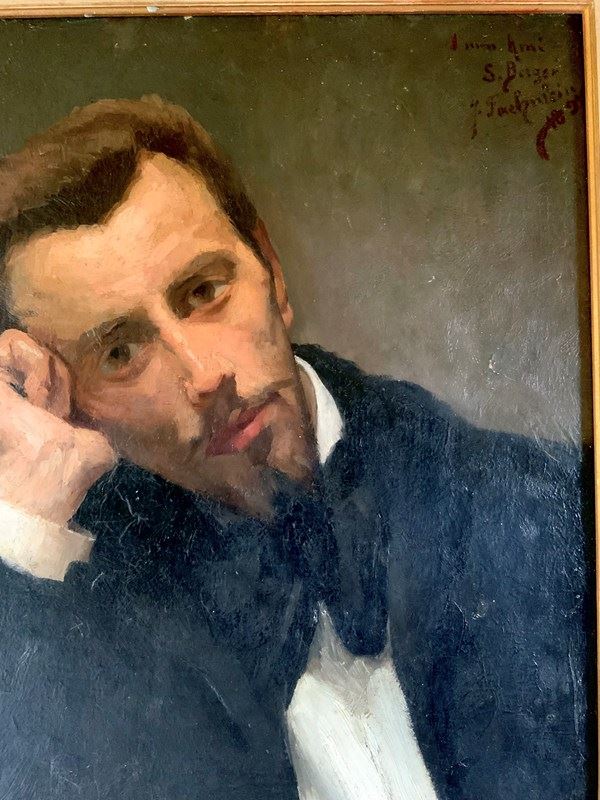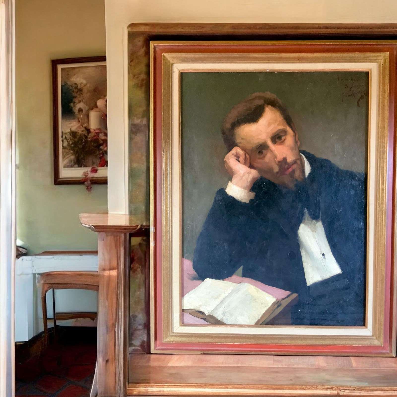 Stunning late 19th Century French school oil on canvas portrait of a gentleman in deep thoughts with an open book at his side.
