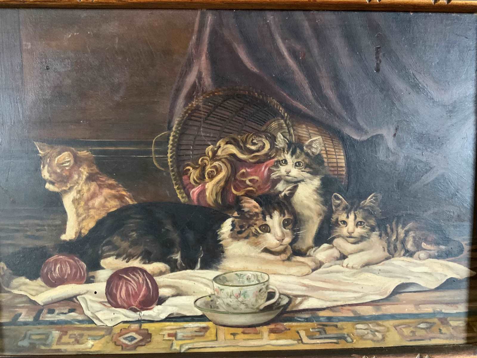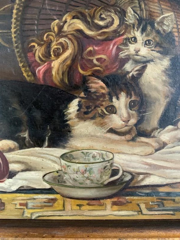 Finely executed late 19th Century French school oil on panel of a family of kittens with a cup of tea.