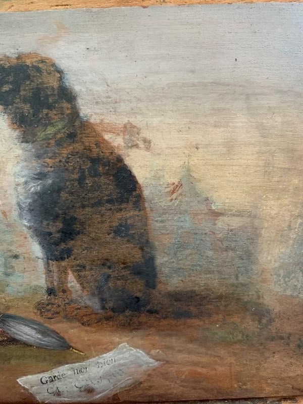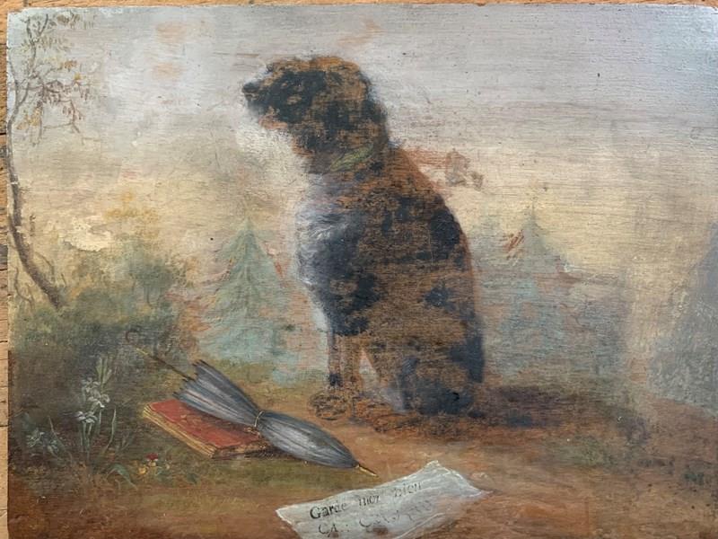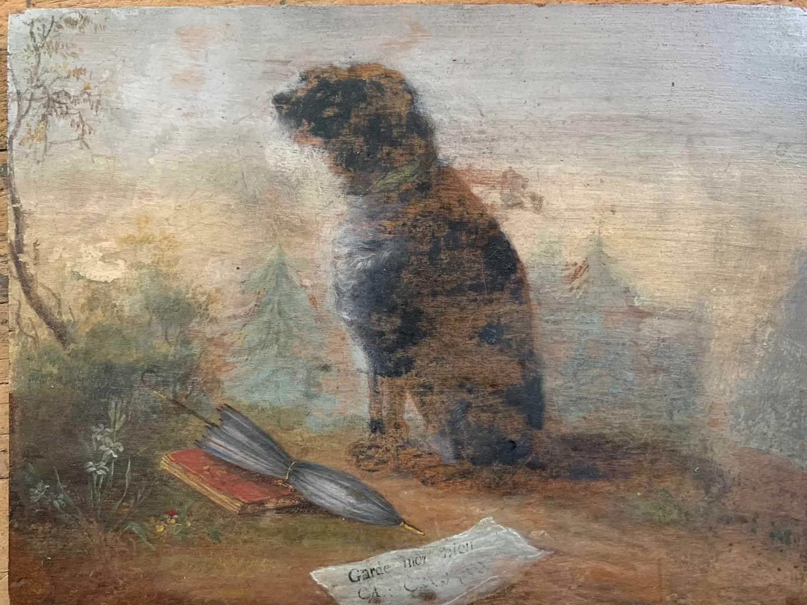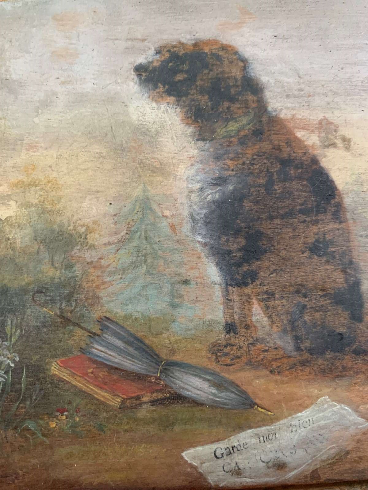 A ghostly and faithful dog… all that remains of its master's presence is his umbrella and a book on the ground, and a handkerchief inscribed "Gardes moi bien", "Guard me well", and signed underneath.