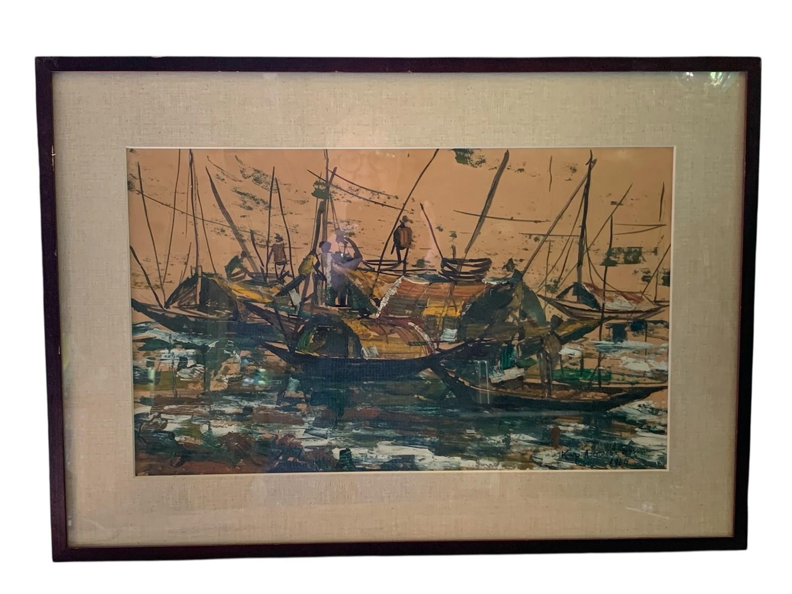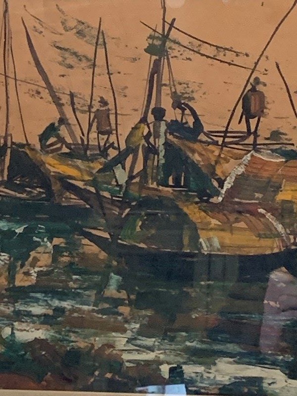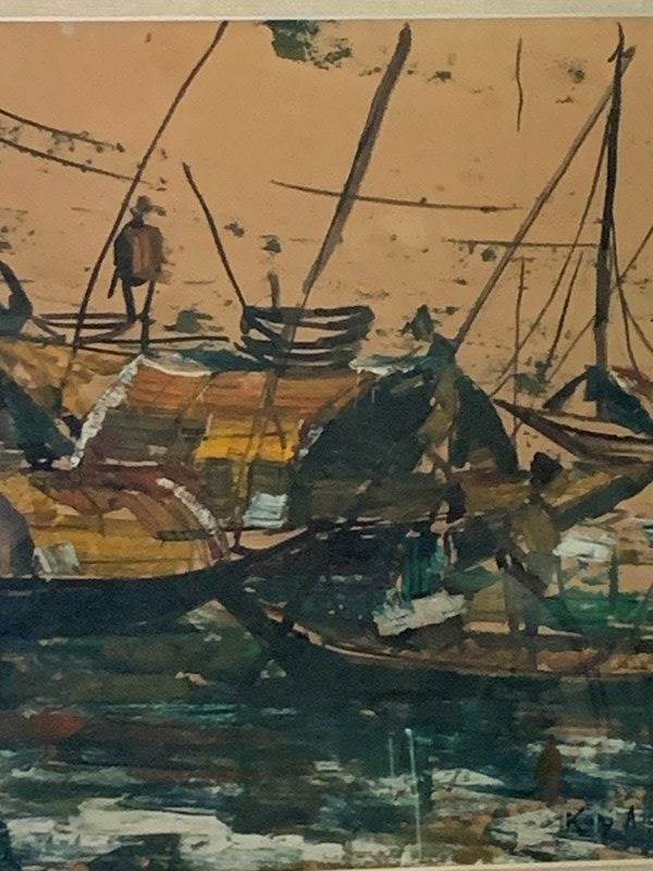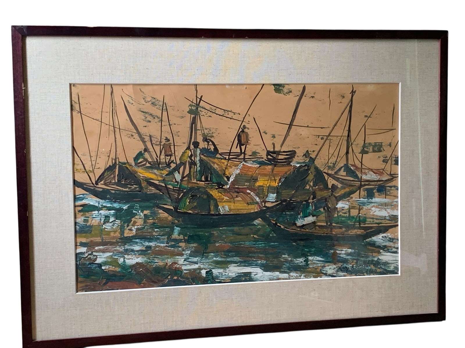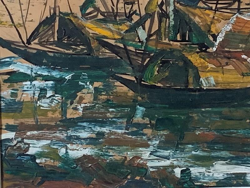A very interesting oil on paper of an abstract expressionist view of Chinese fishing boats and fishermen on a water edge.