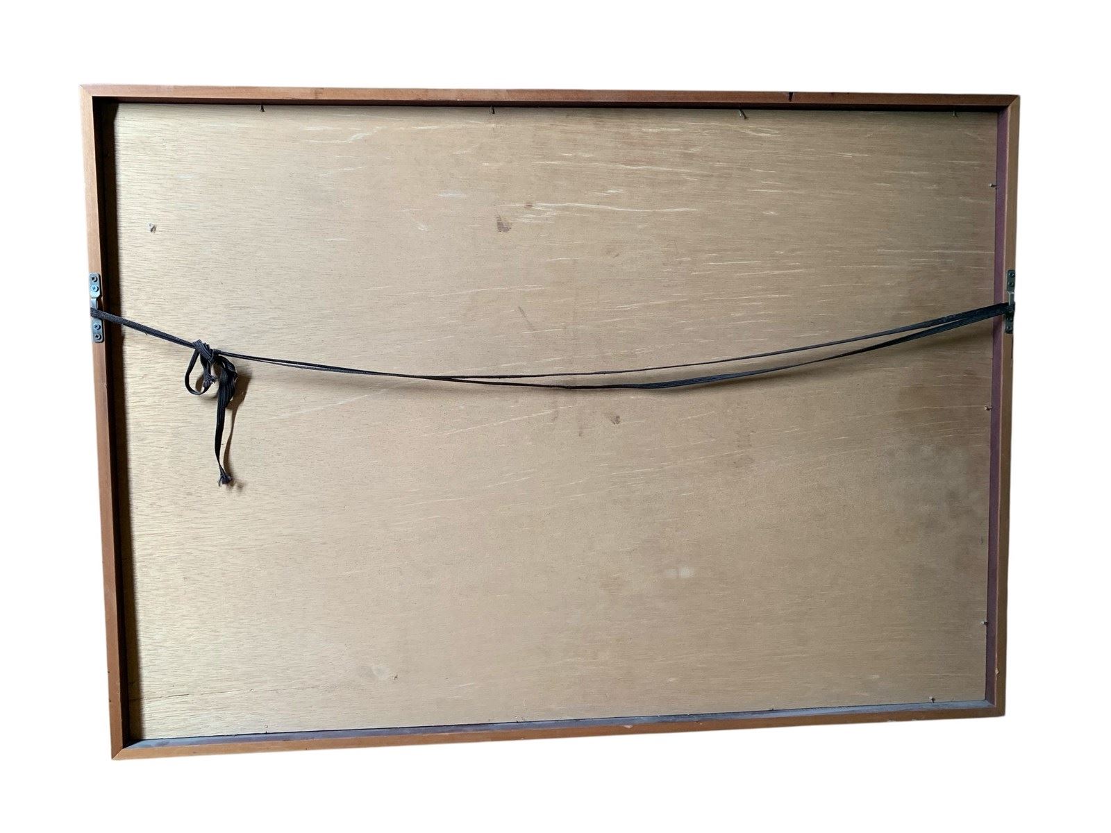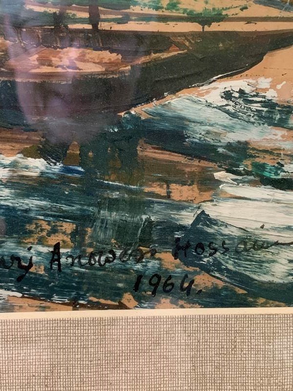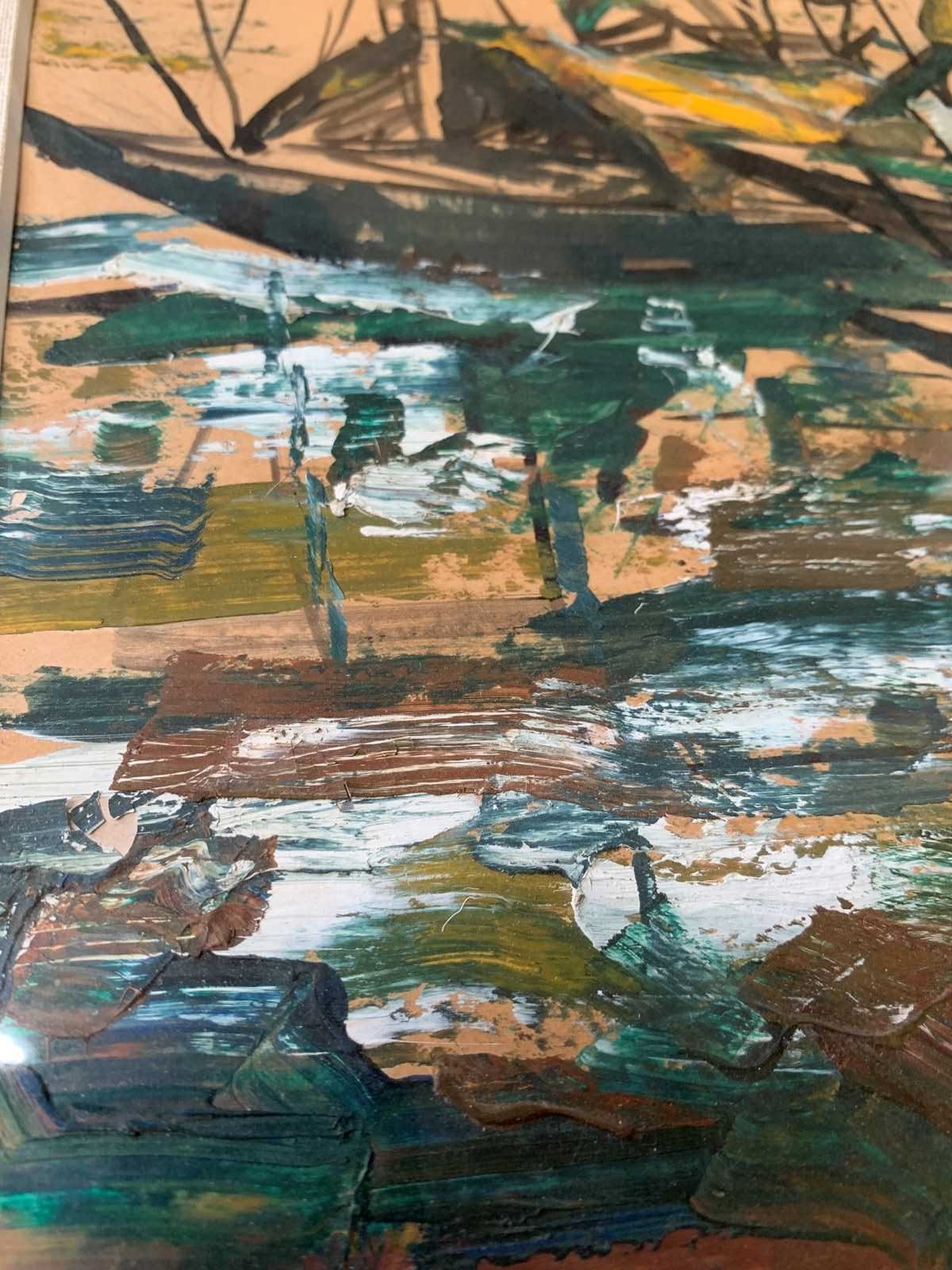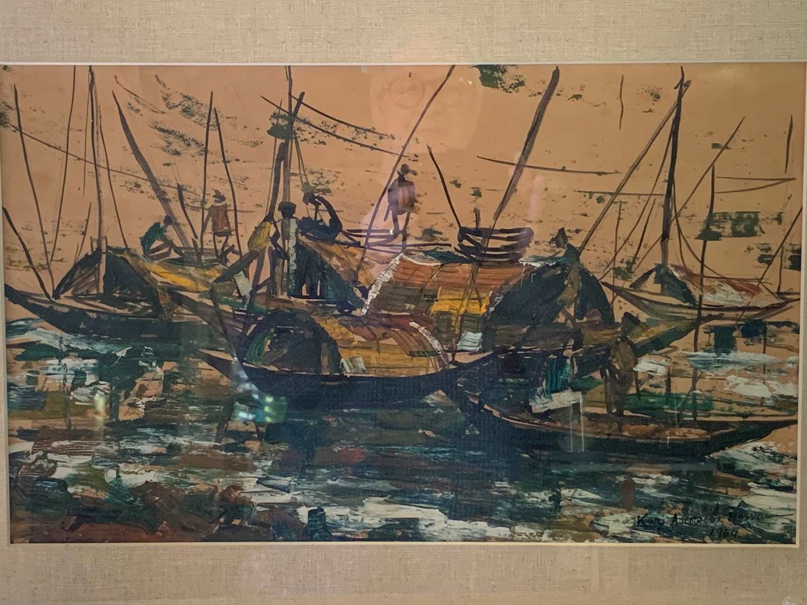 A very interesting oil on paper of an abstract expressionist view of Chinese fishing boats and fishermen on a water edge.