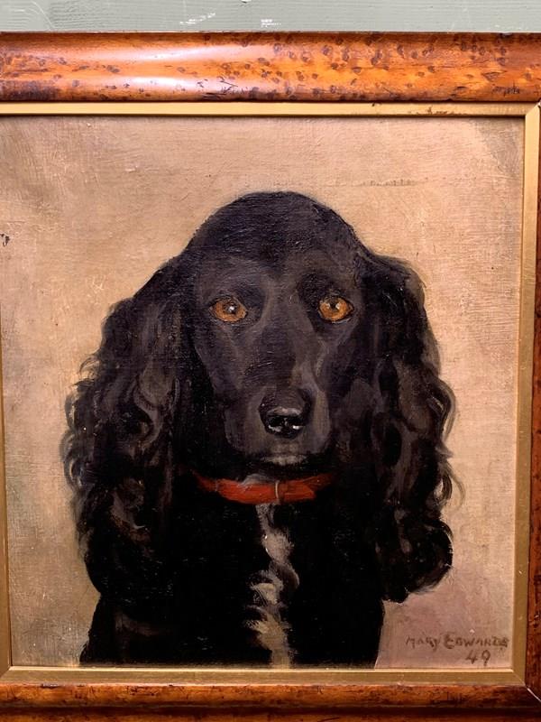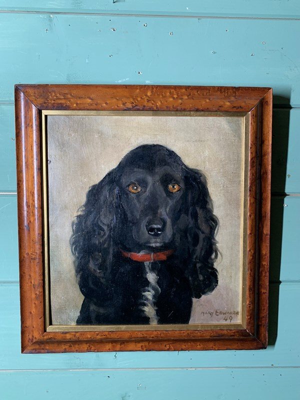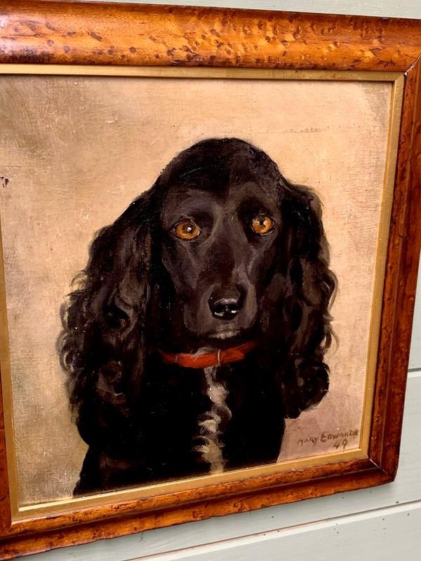 A striking mid century portrait of a black spaniel, oil on board, contained in a lovely befitting maple frame.