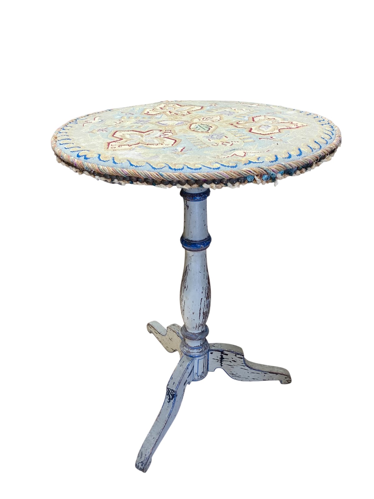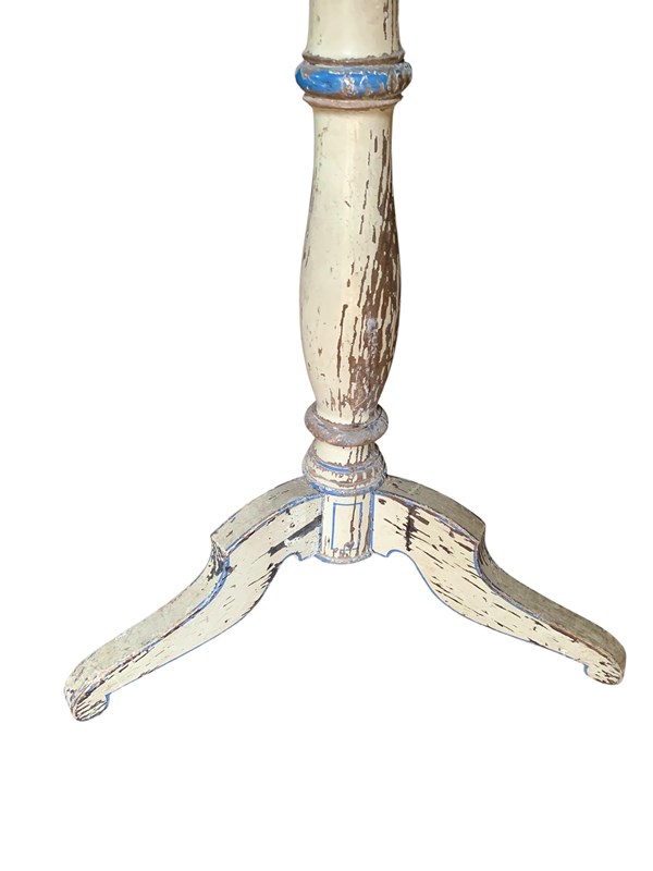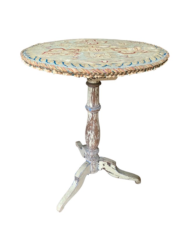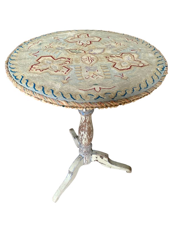 A perfectly charming painted pine gueridon or lamp table circa 1870, in its distressed original paintwork and original tapestry top.