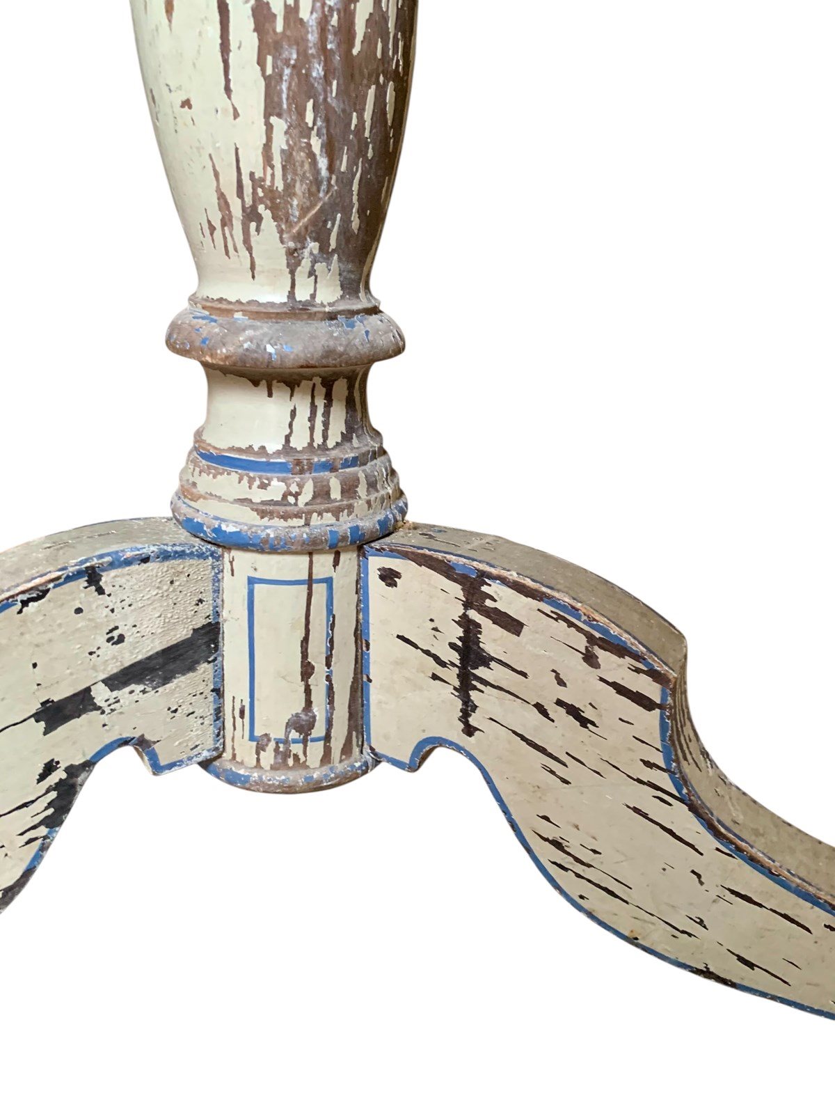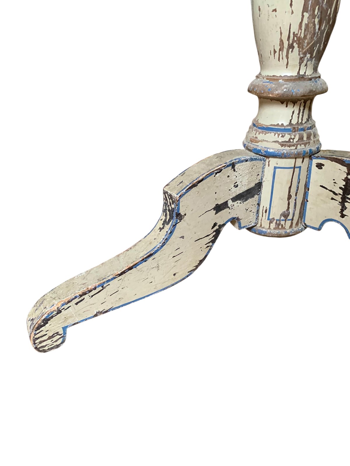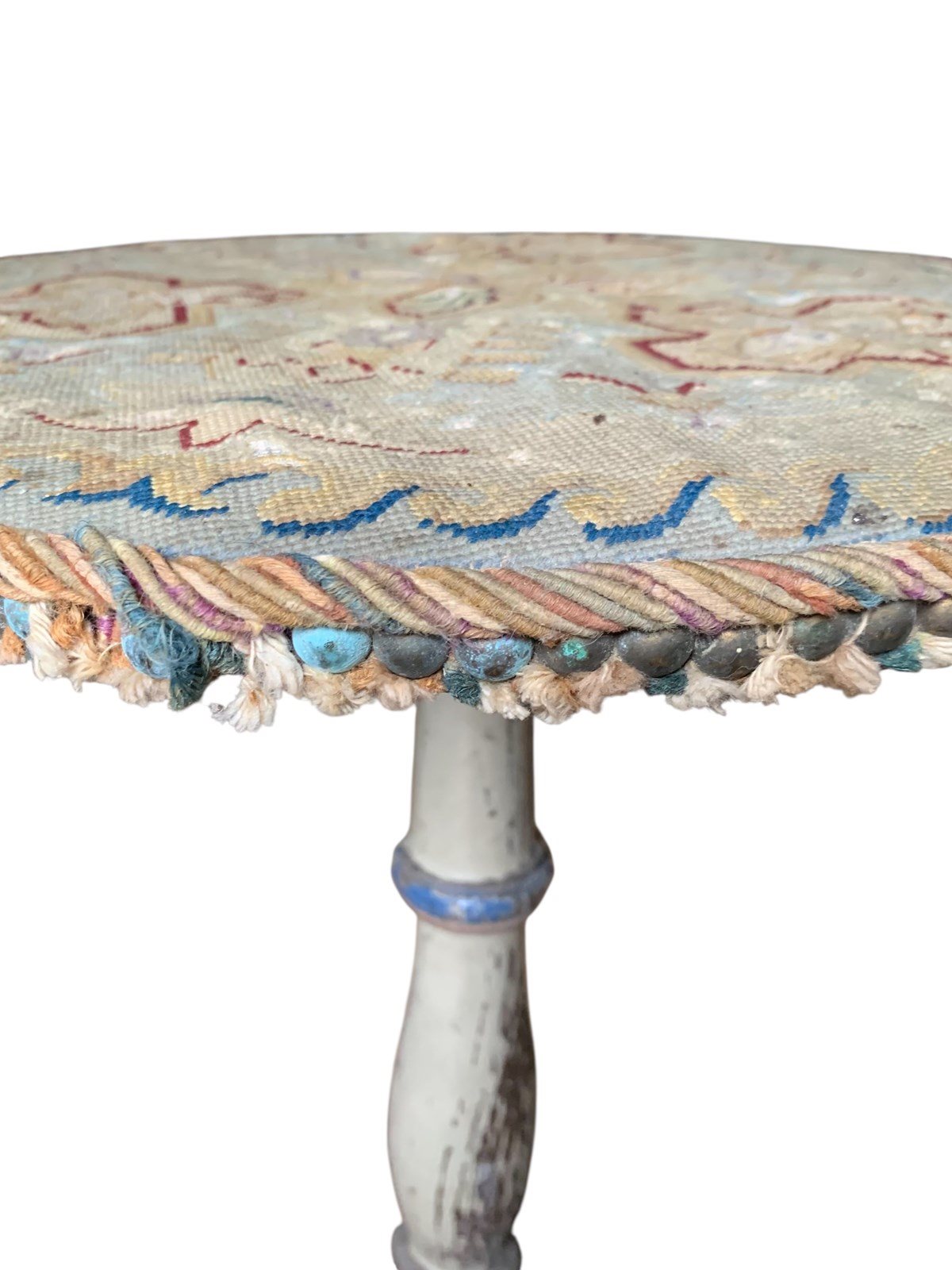 A perfectly charming painted pine gueridon or lamp table circa 1870, in its distressed original paintwork and original tapestry top.