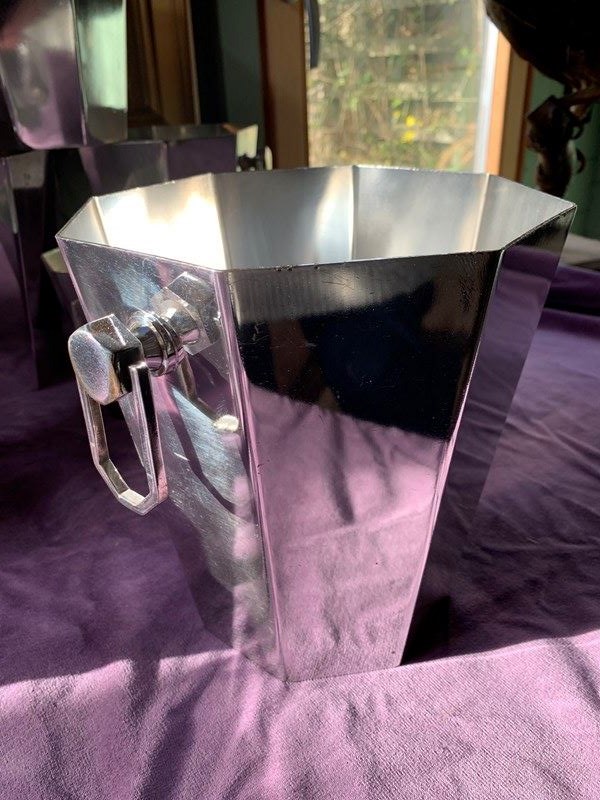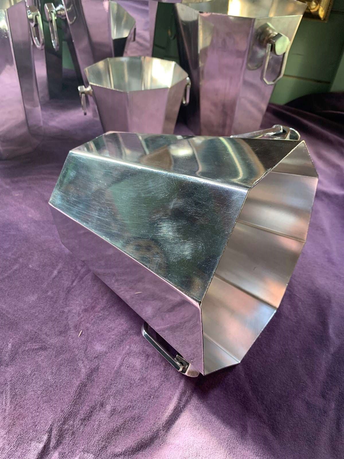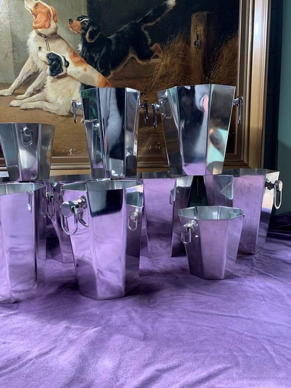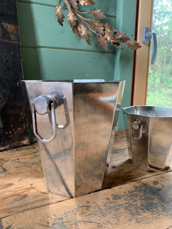 Featuring their original silver plate over substantial brass construction, the larger examples weighing nearly 2Kg, these buckets originate from France, made in the 1930’s possibly for a hotel or restaurant, and are stamped with maker’s mark Europ-Felix, a renowned manufacturer of tableware.