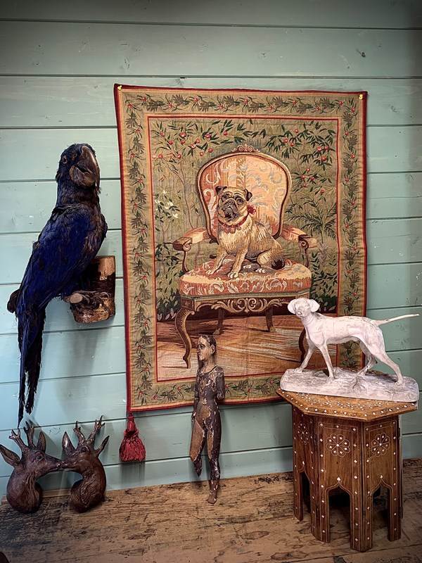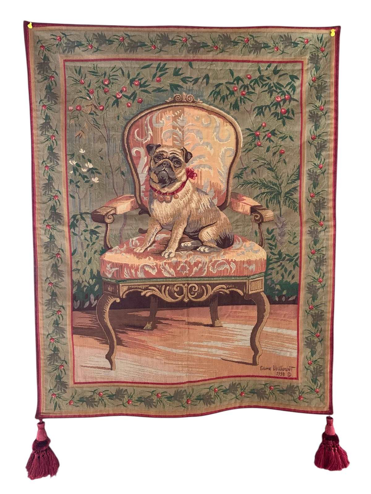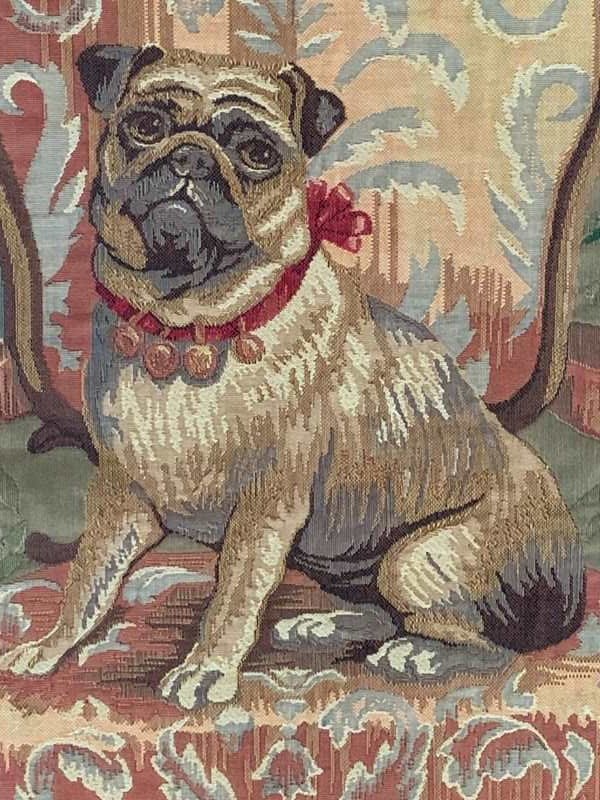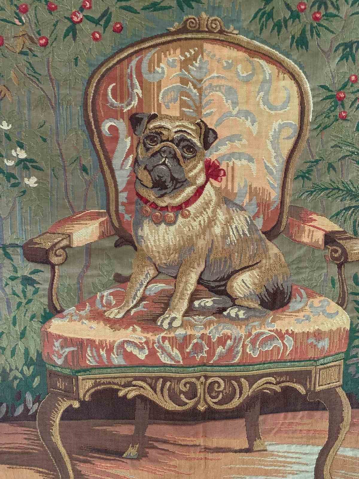 A charming late 20th Century wall hanging tapestry in lovely vintage condition depicting a pug seated on a French antique armchair.
